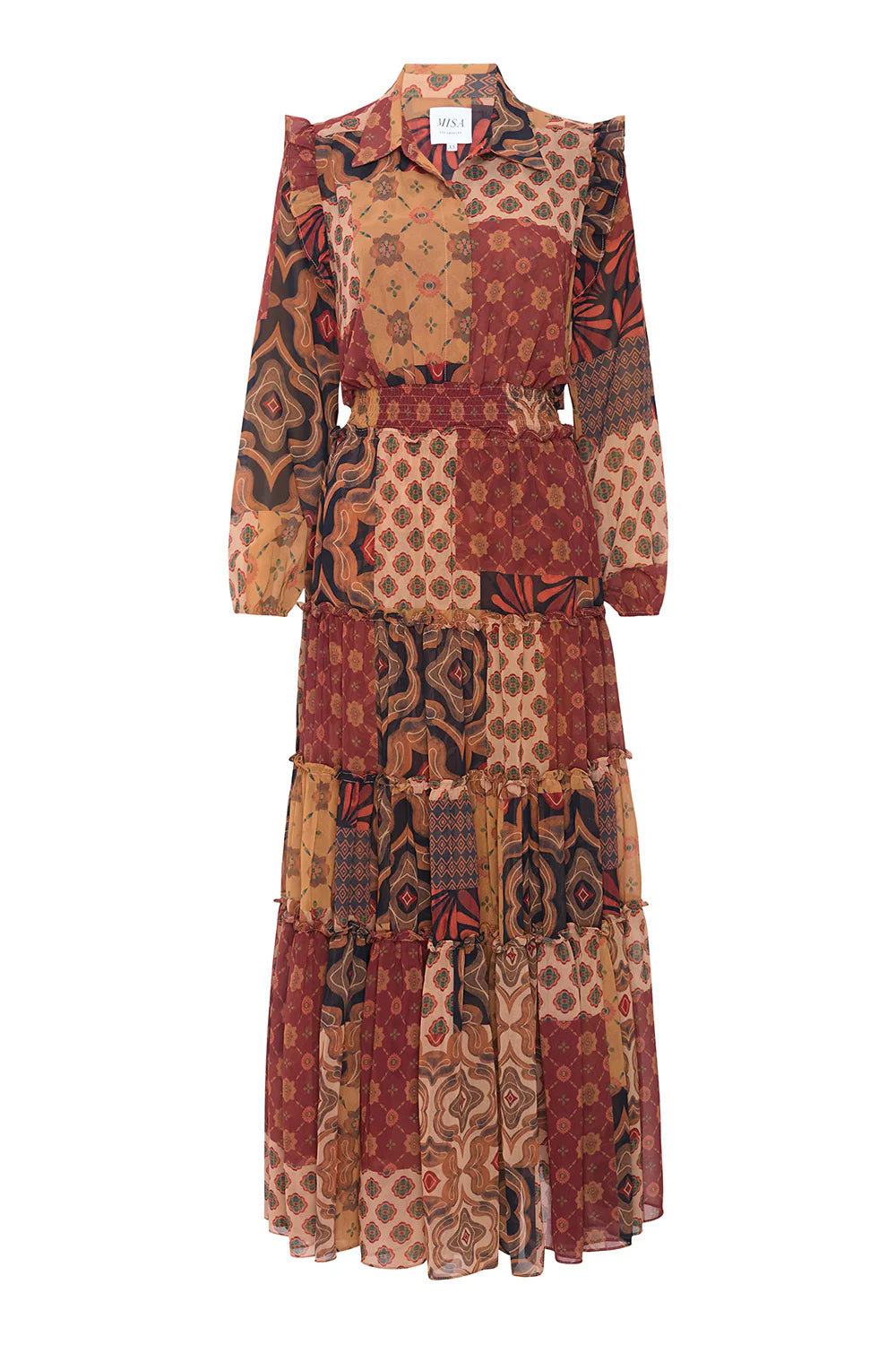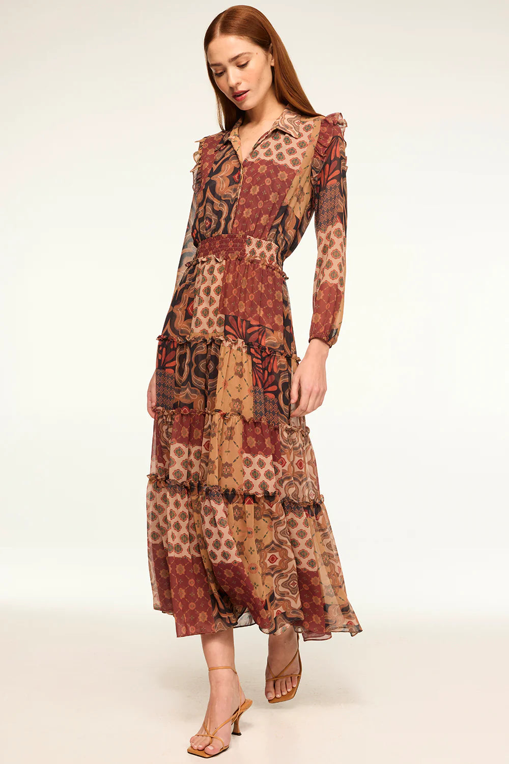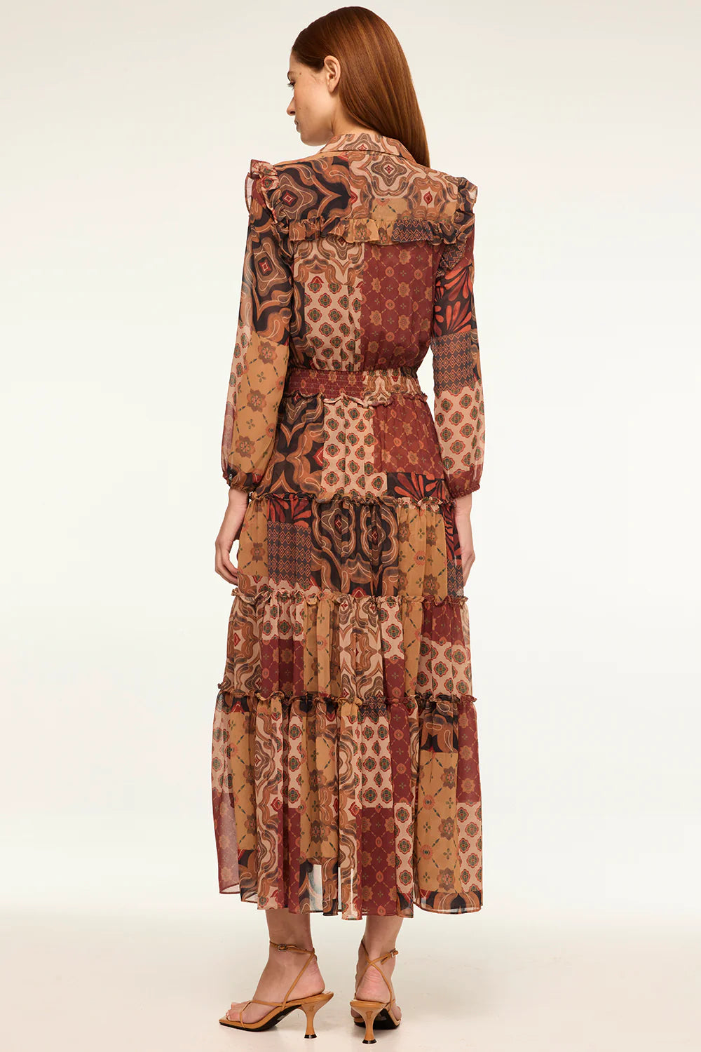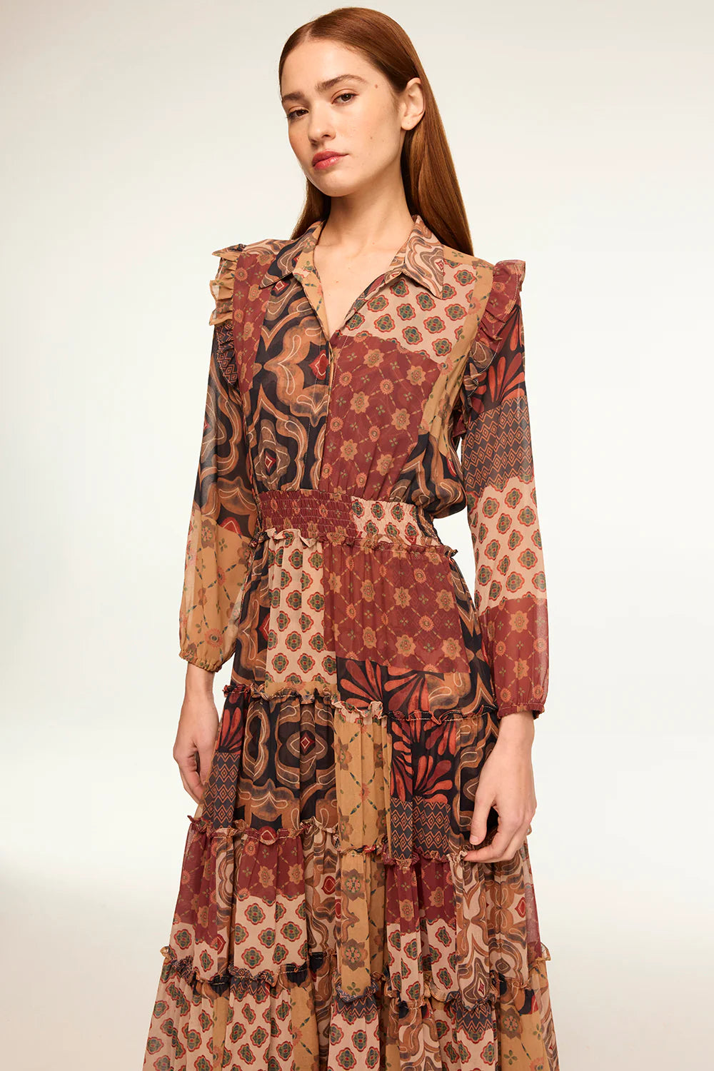 Our universally flattering Ahreana is back for fall in a Surreal Patchwork printed chiffon in the perfect fall palette. This feminine take on the shirt dress features a covered front button placket to the elasticated waist. A fold collar and delicate ruffle shoulder details lead into long semi-sheer sleeves. Back placket ruffle detail. The bodice and skirt are self-lined. The tiered ankle-grazing skirt finishes off this timeless style that can be worn with everything from boots to strappy heels.