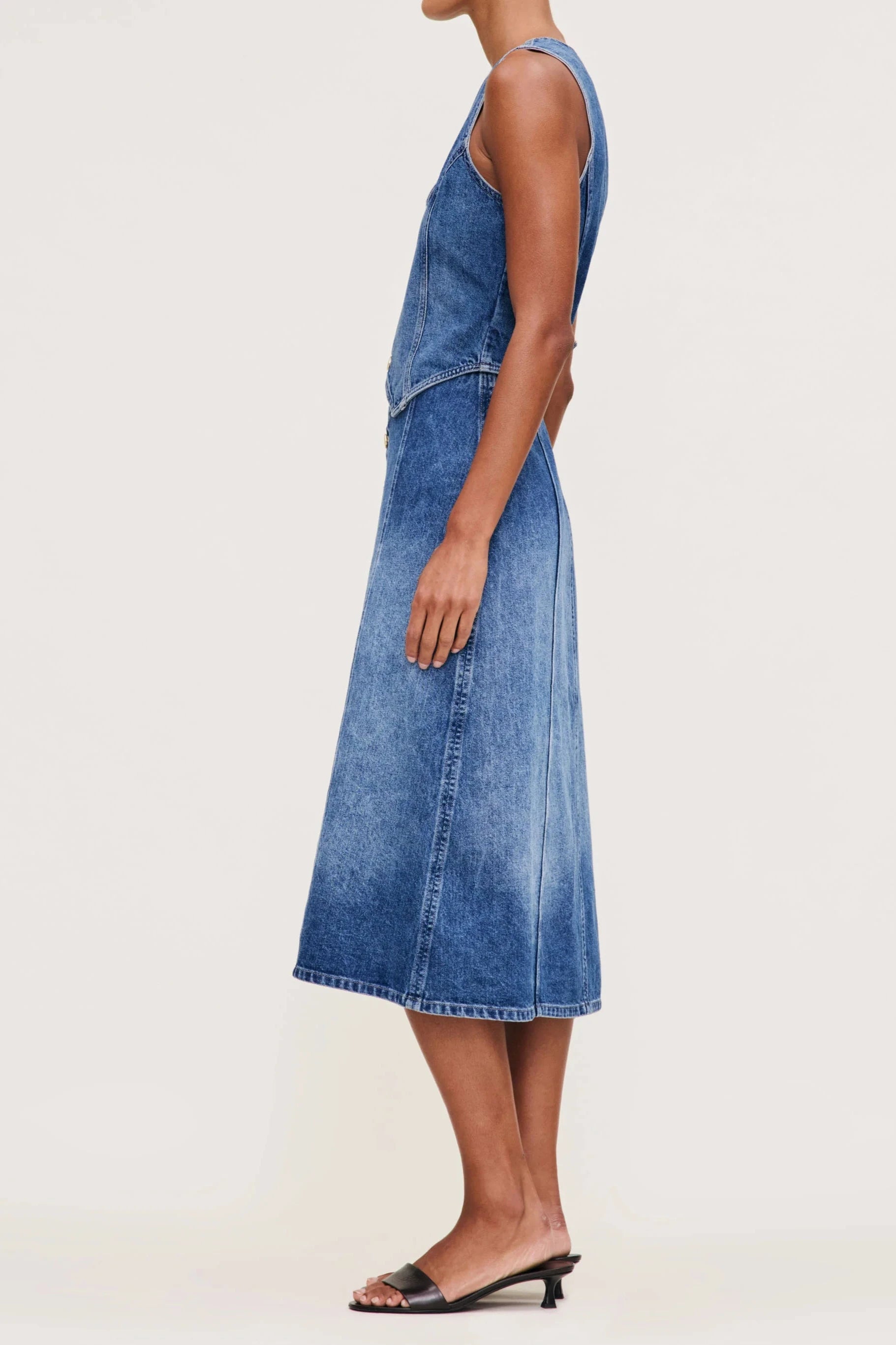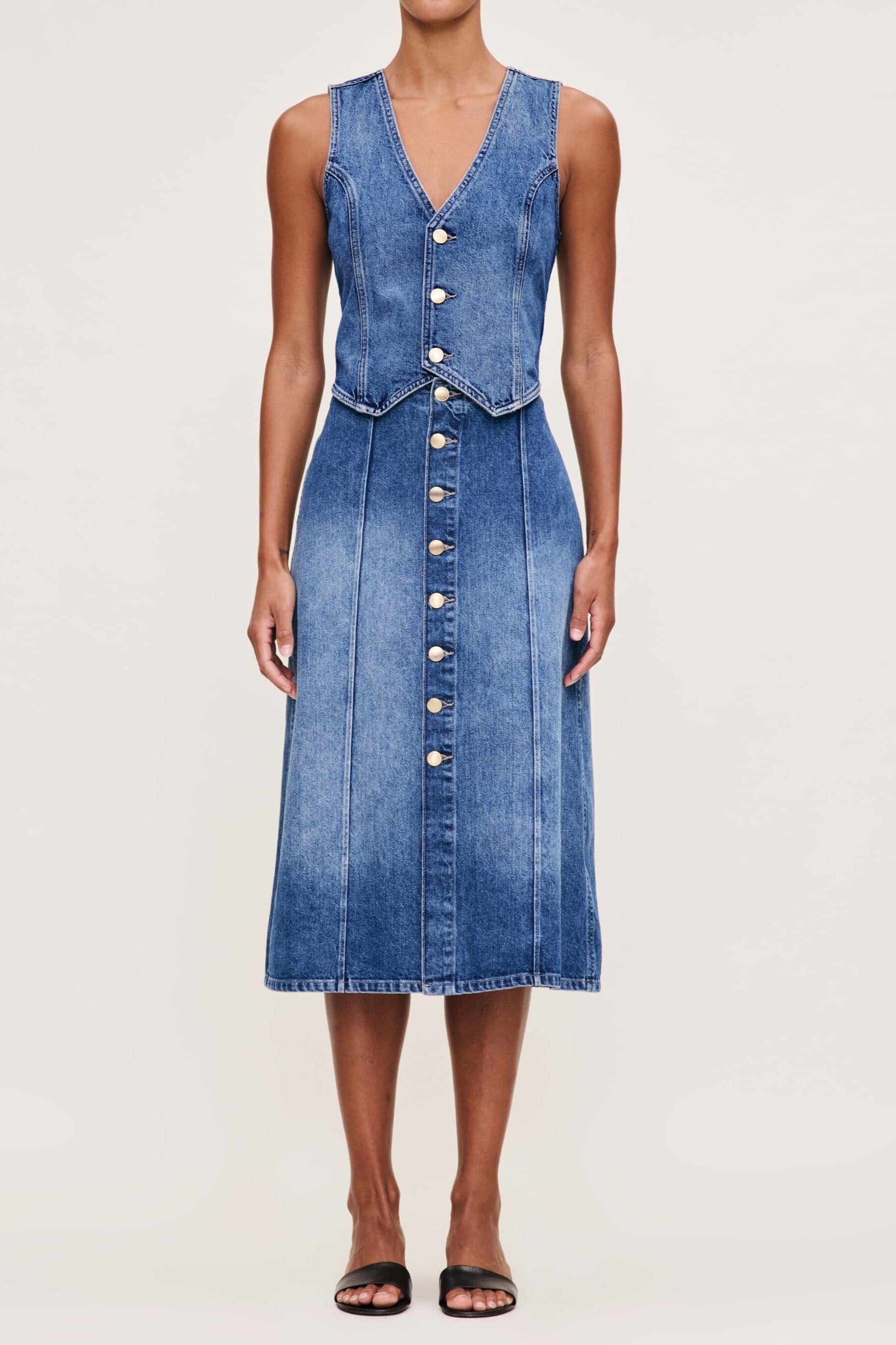Alma is an A-line skirt designed to sit at your natural waist with a button front closure.