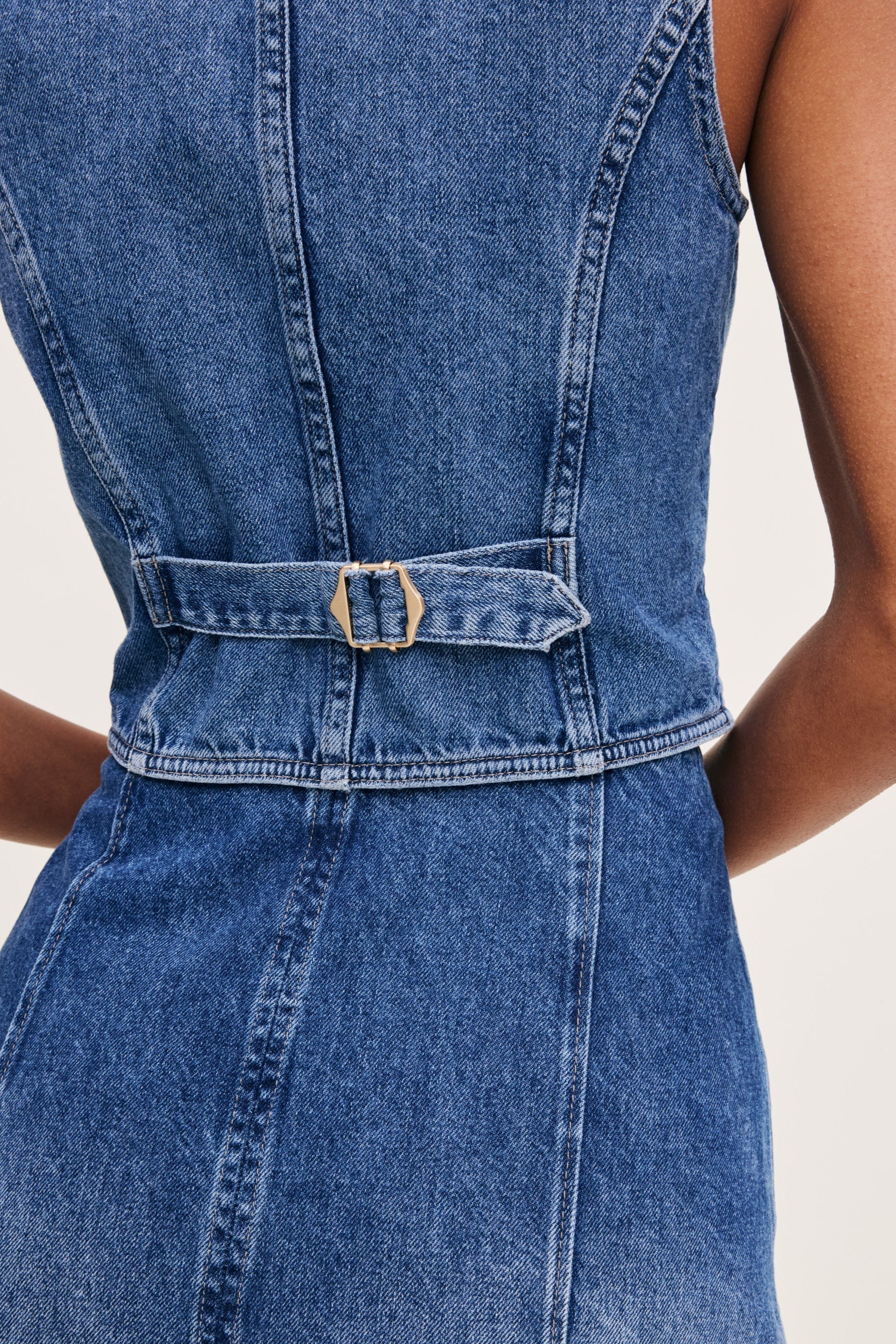 Wythe is a bright mid-indigo wash with subtle fading. It features gold hardware, light khaki stitching and a clean hem.