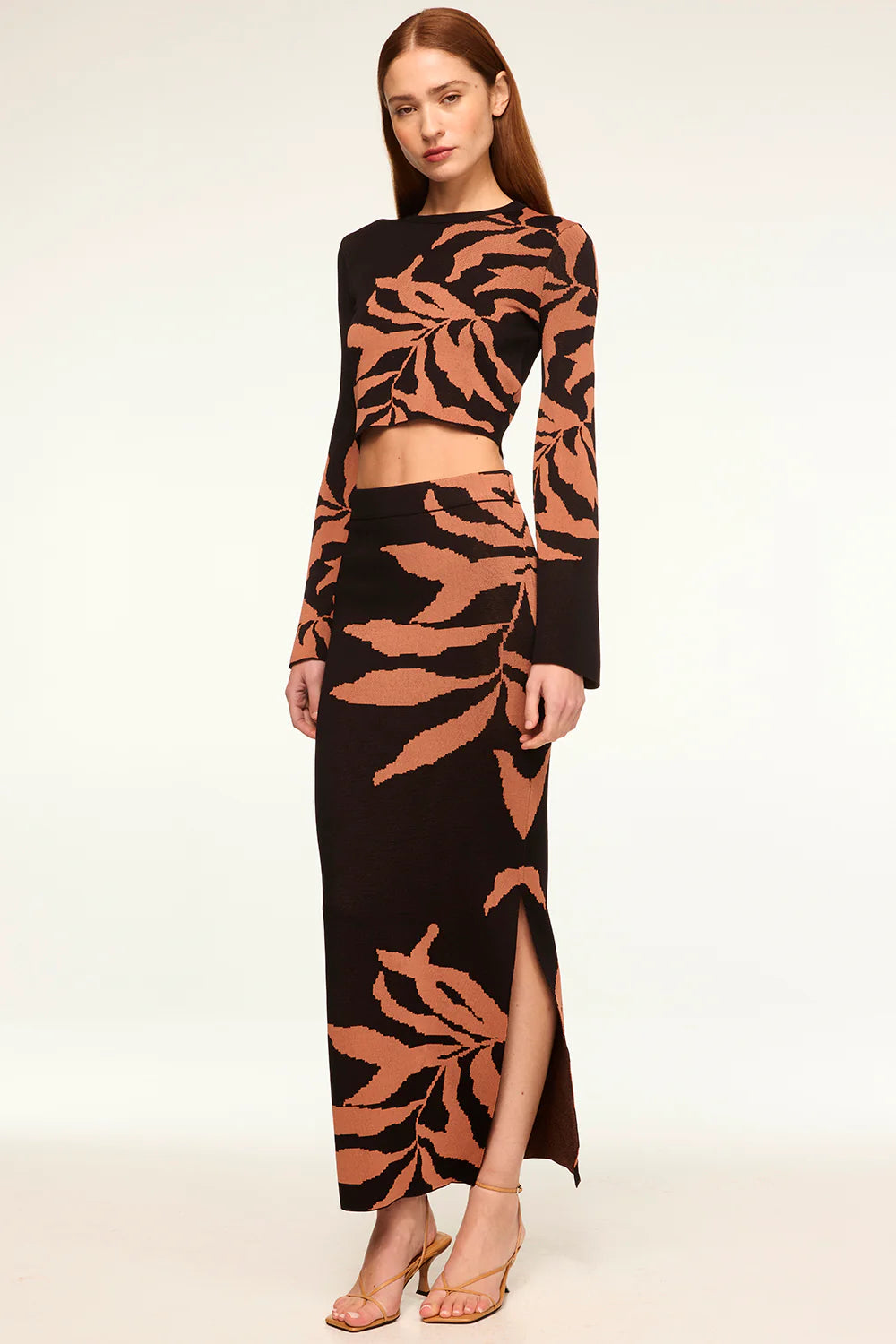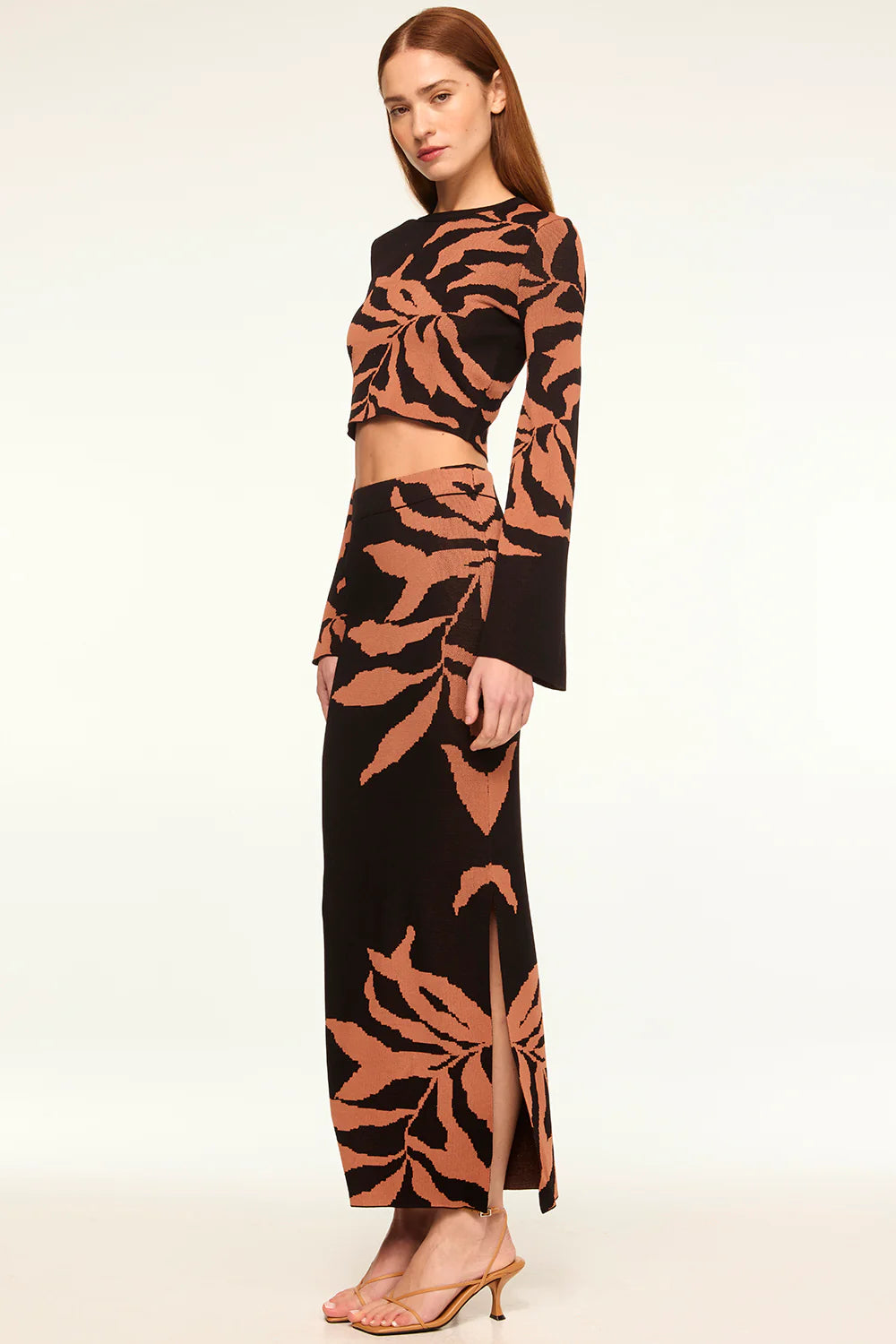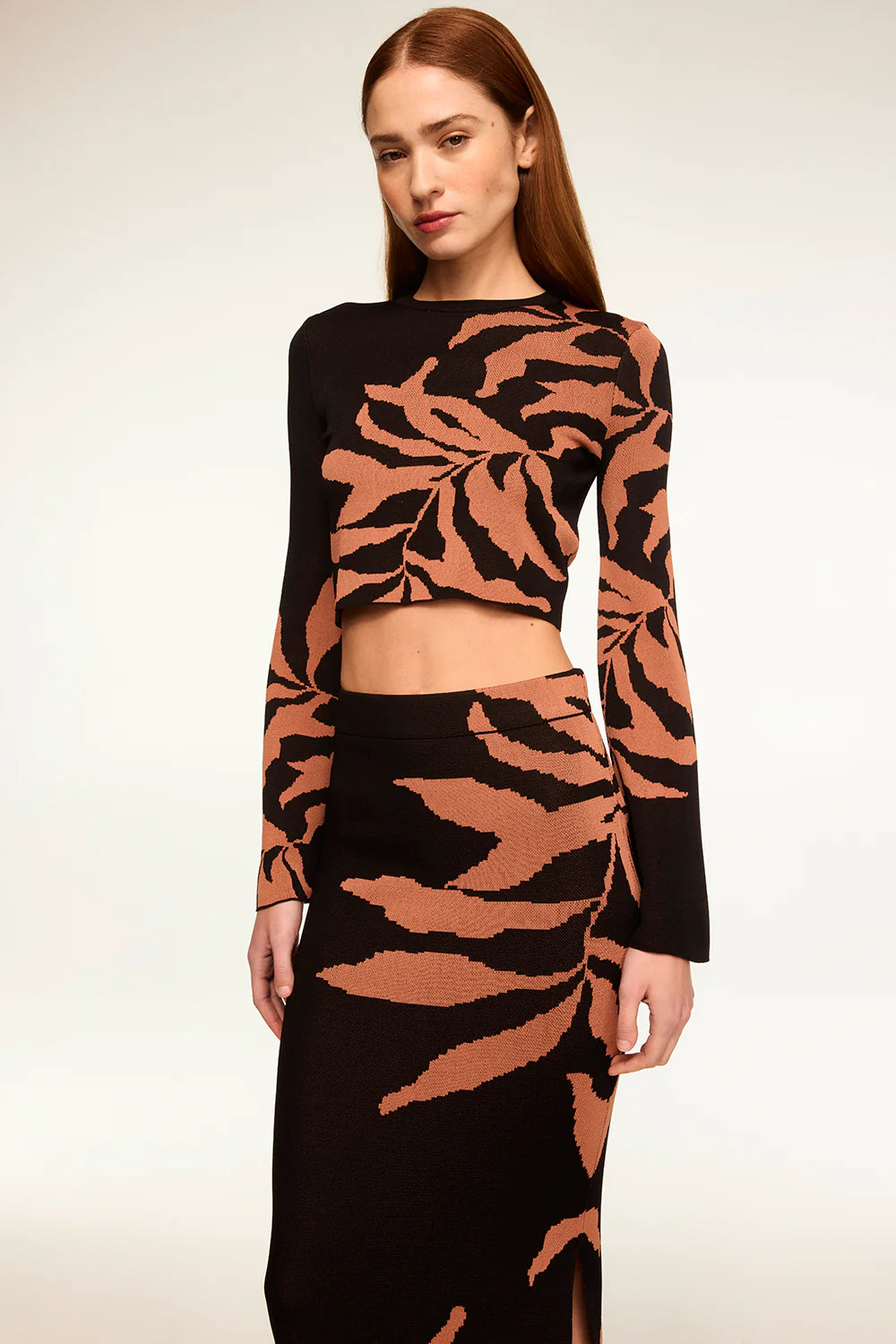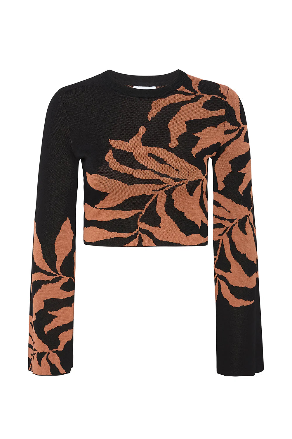 Amila is a fitted cropped jacquard knit with a tonal fern motif adorning the bodice and sleeves. This chic stretch knit top has a high crew neckline and long bell sleeves. Pair with the coordinating Fira skirt for a fall-ready set.