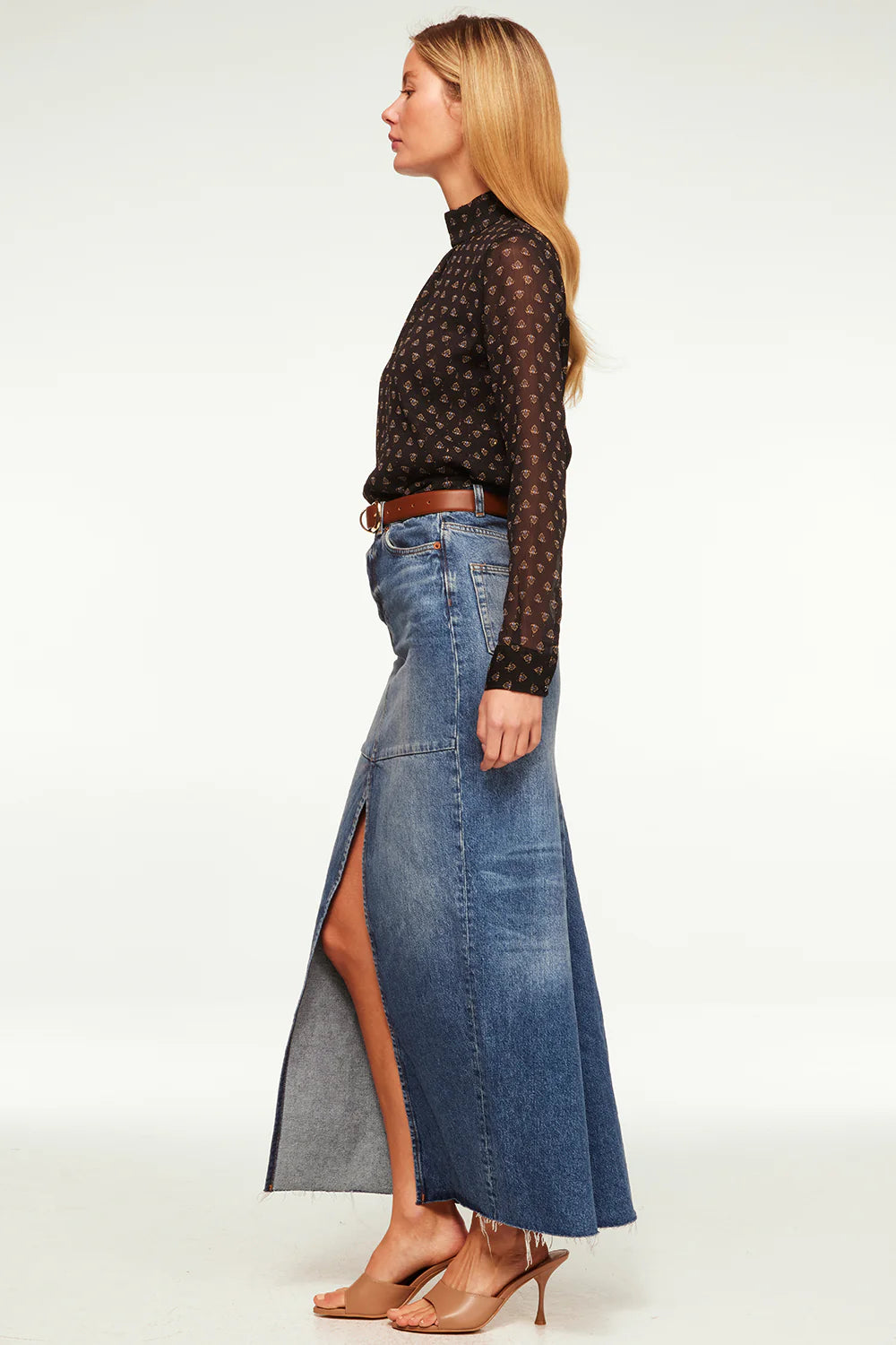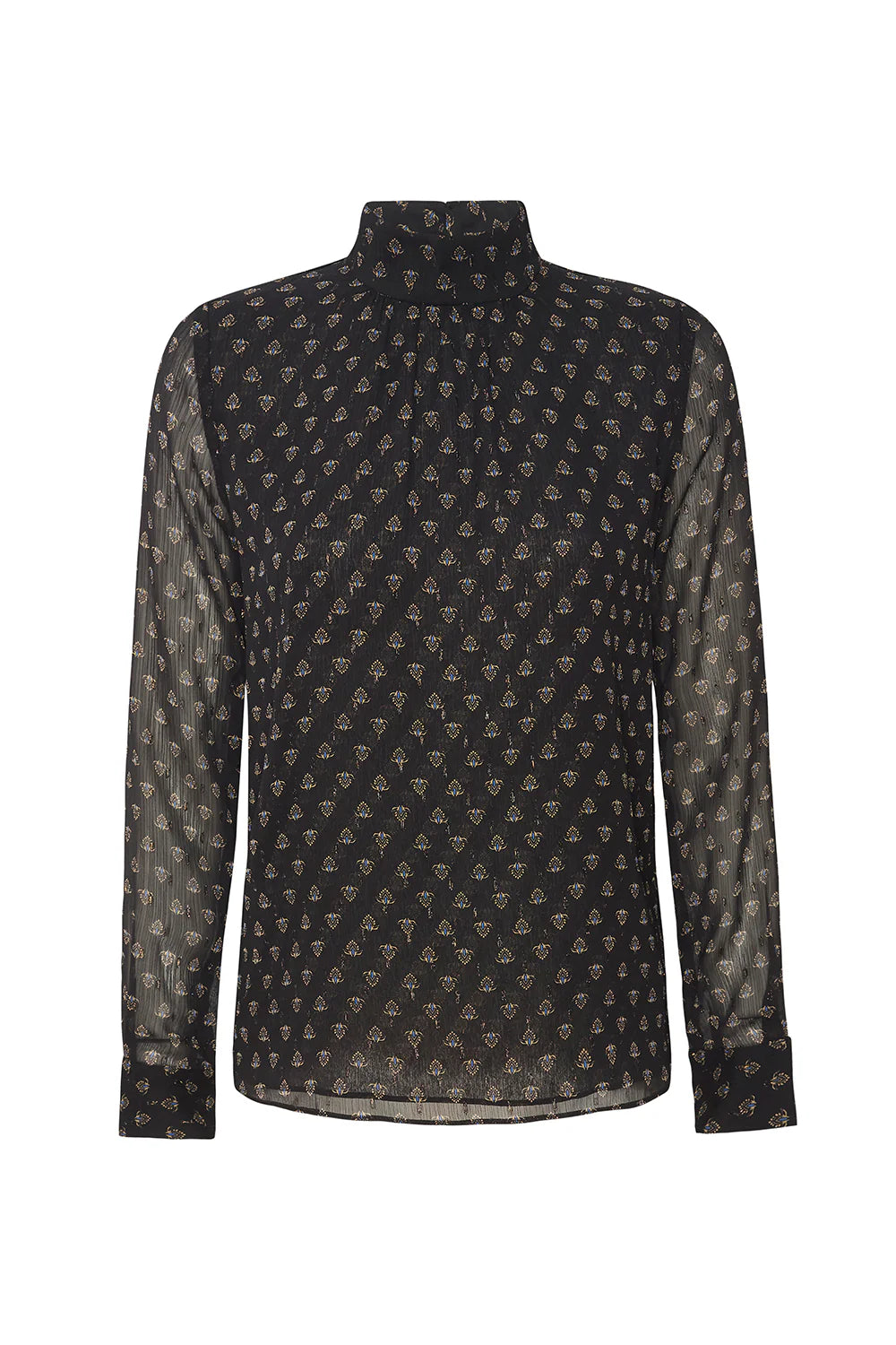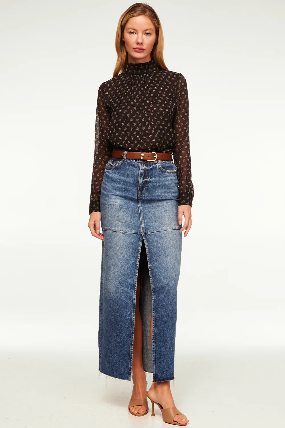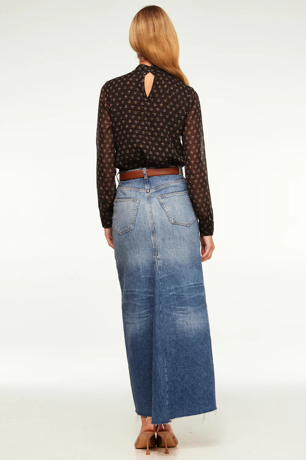 Our new Annie top is cut from a Black Lapis Eye printed crinkle chiffon with lurex clip dots. This high neck silhouette features a keyhole button back closure and long sheer sleeves. The bodice is double-lined.