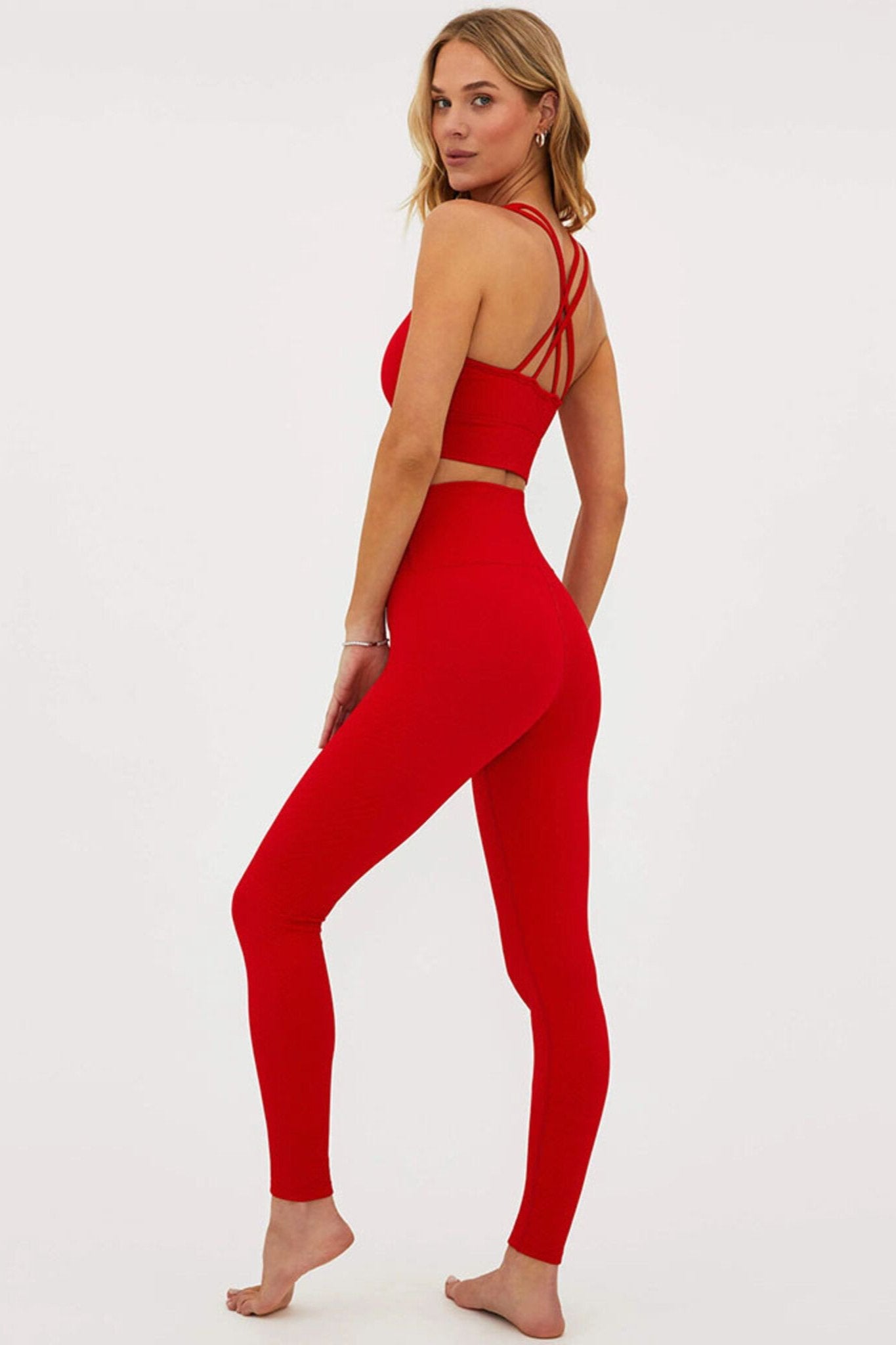 The Azalea Top is our new sports bra featured in our soft new waffle fabrication that offers four-way stretch, a soft waffle texture, with sweat-wicking properties and medium compression. This top has a high neckline with a bold strappy back. Pair with the matching Piper Legging in Merry Red Waffle.