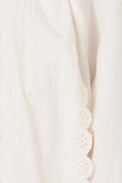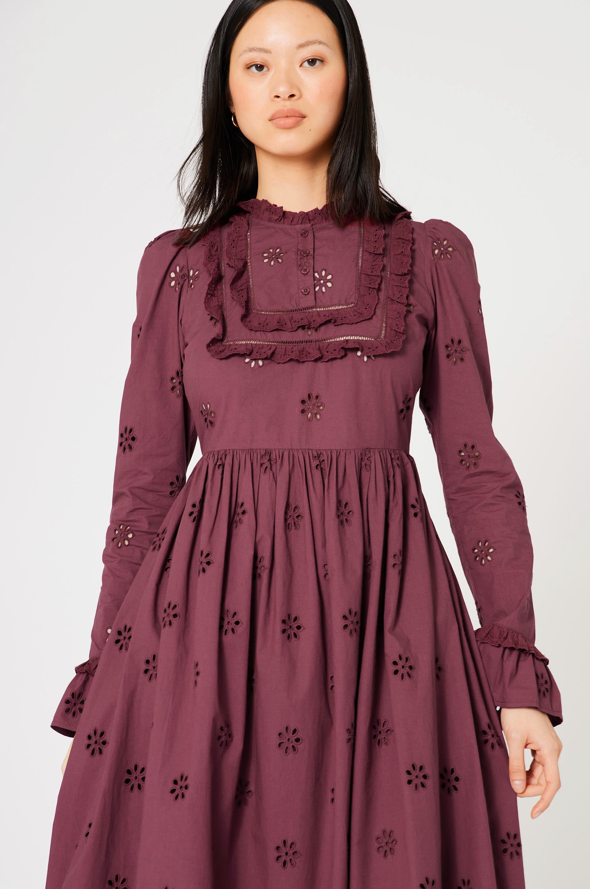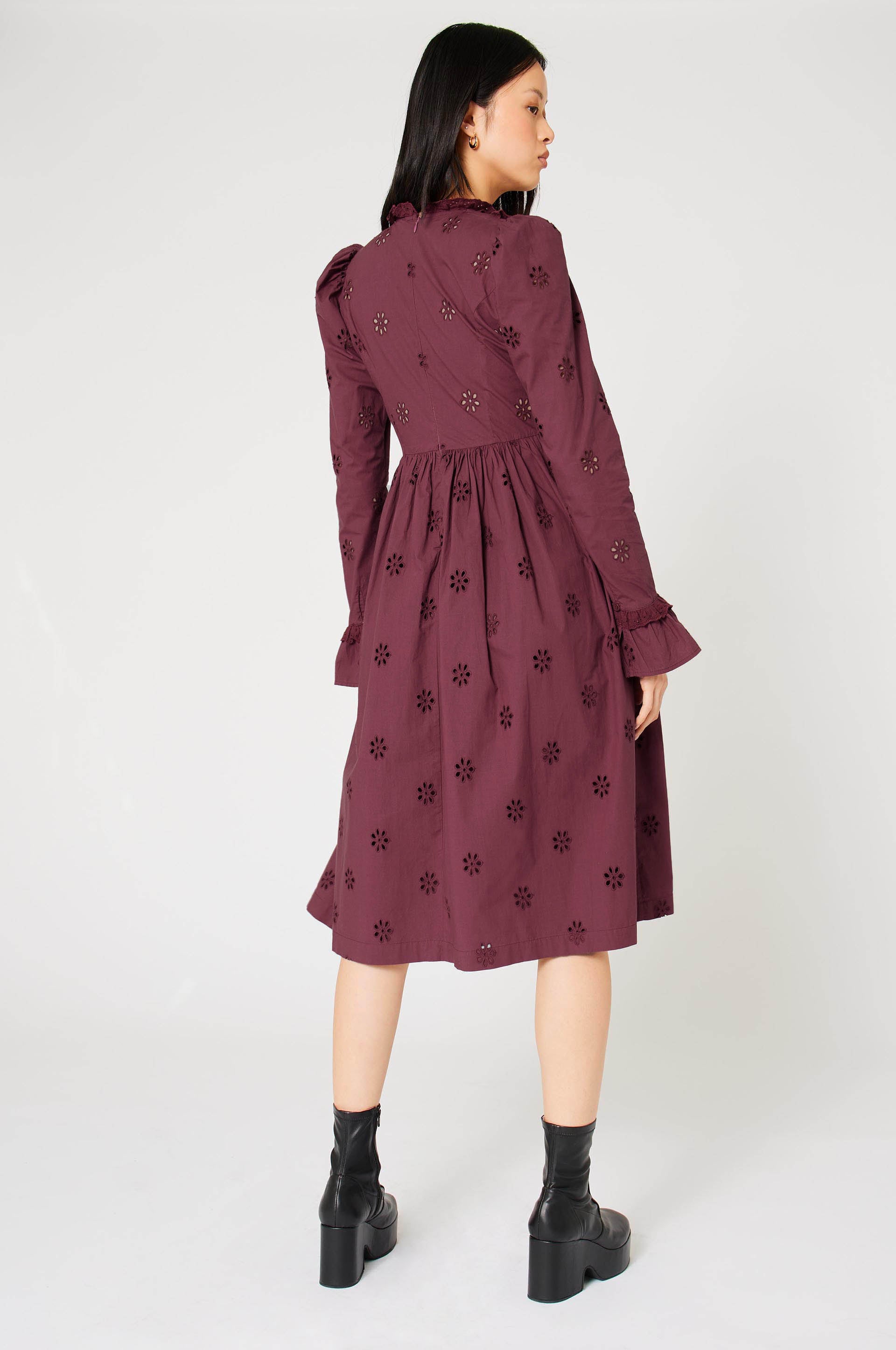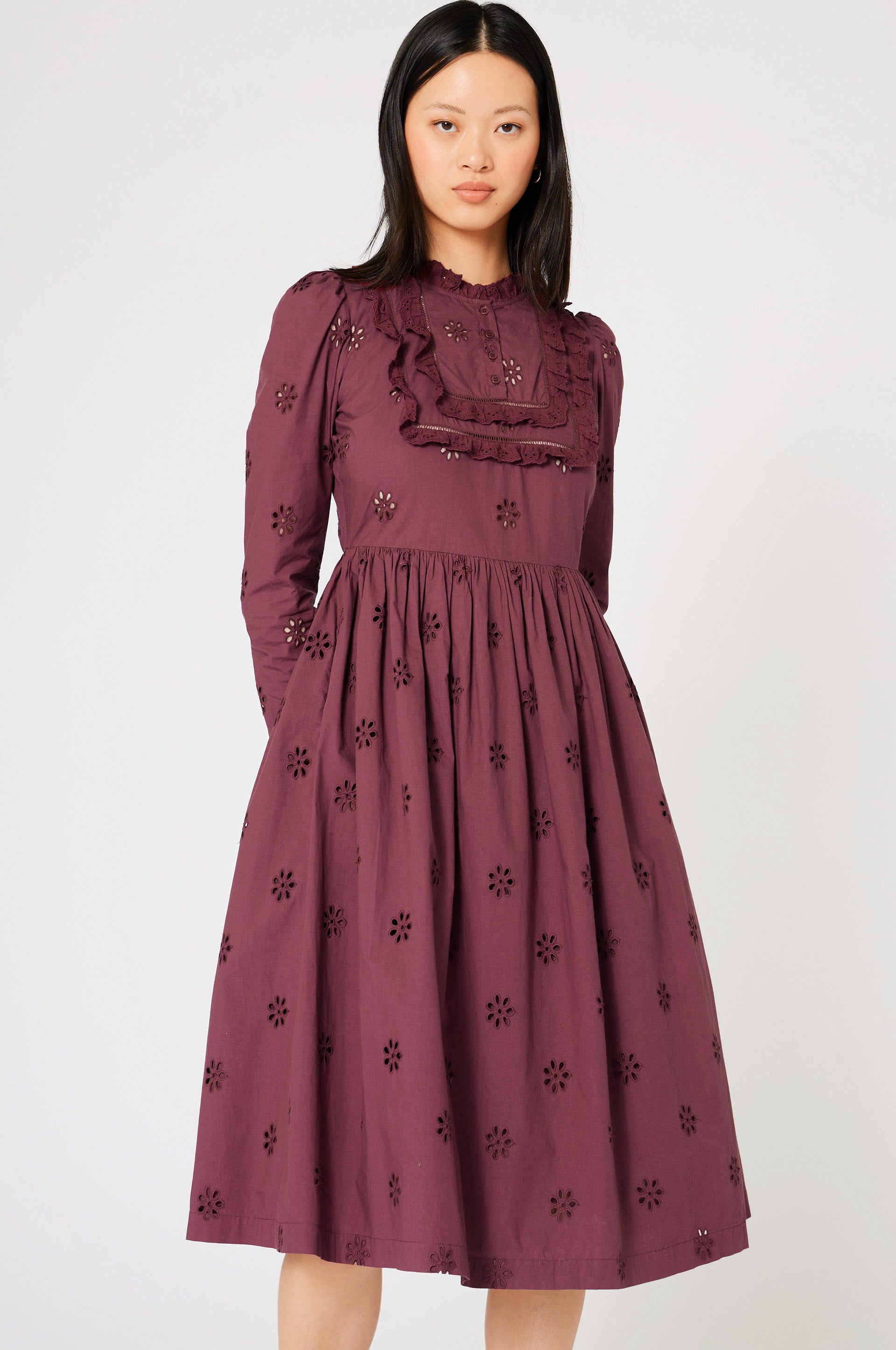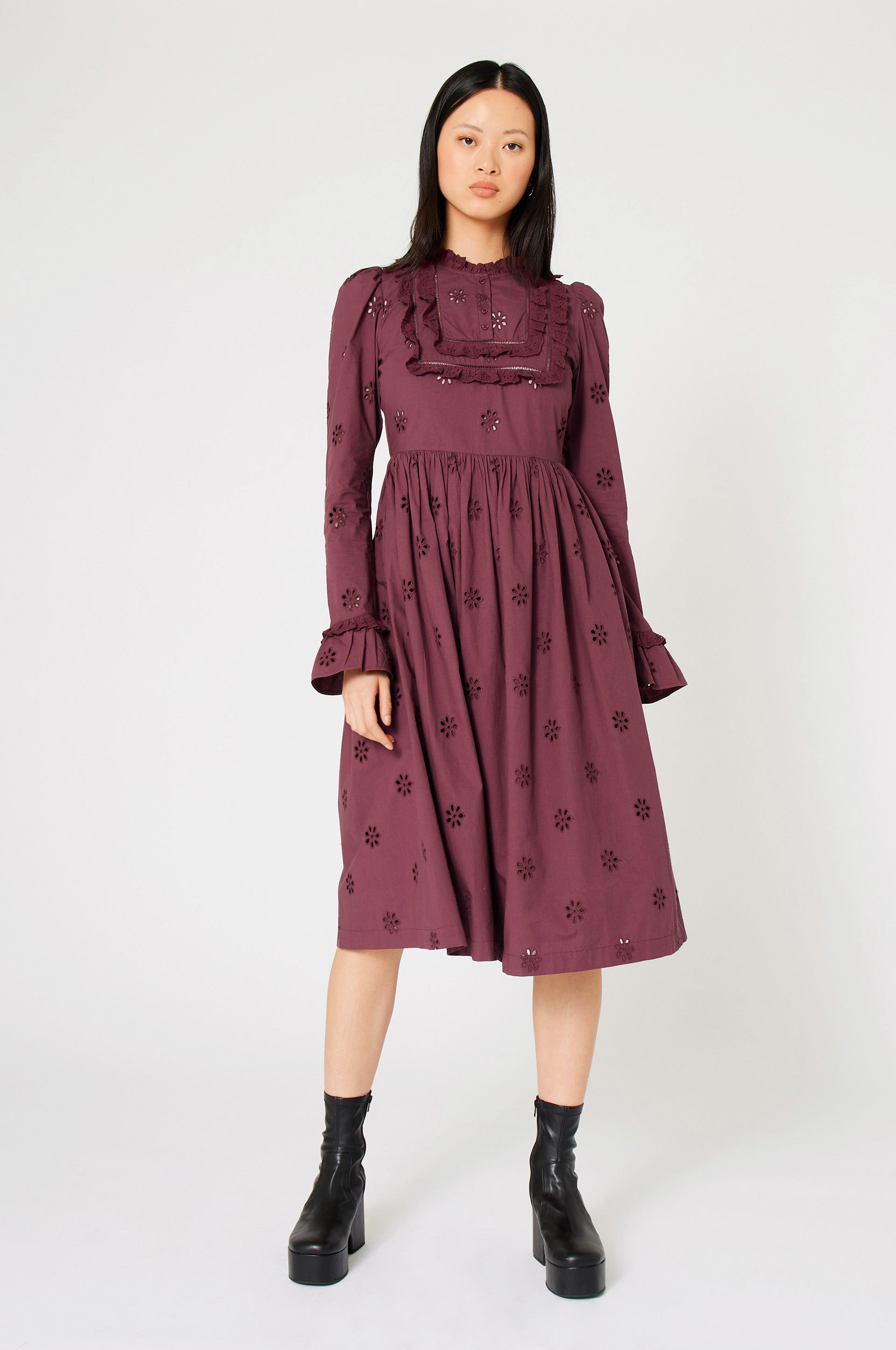 Eyelet style fabric midi dress. Lined skirt. Gathered waist. Long smocked sleeves. Round ruffled collar. Back zip fastener. Buttoned ruffled cuffs.