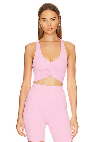 Our best-selling bike short is now available in our cable fabric in Prism Pink. Make it a set with the matching Mindy top.
