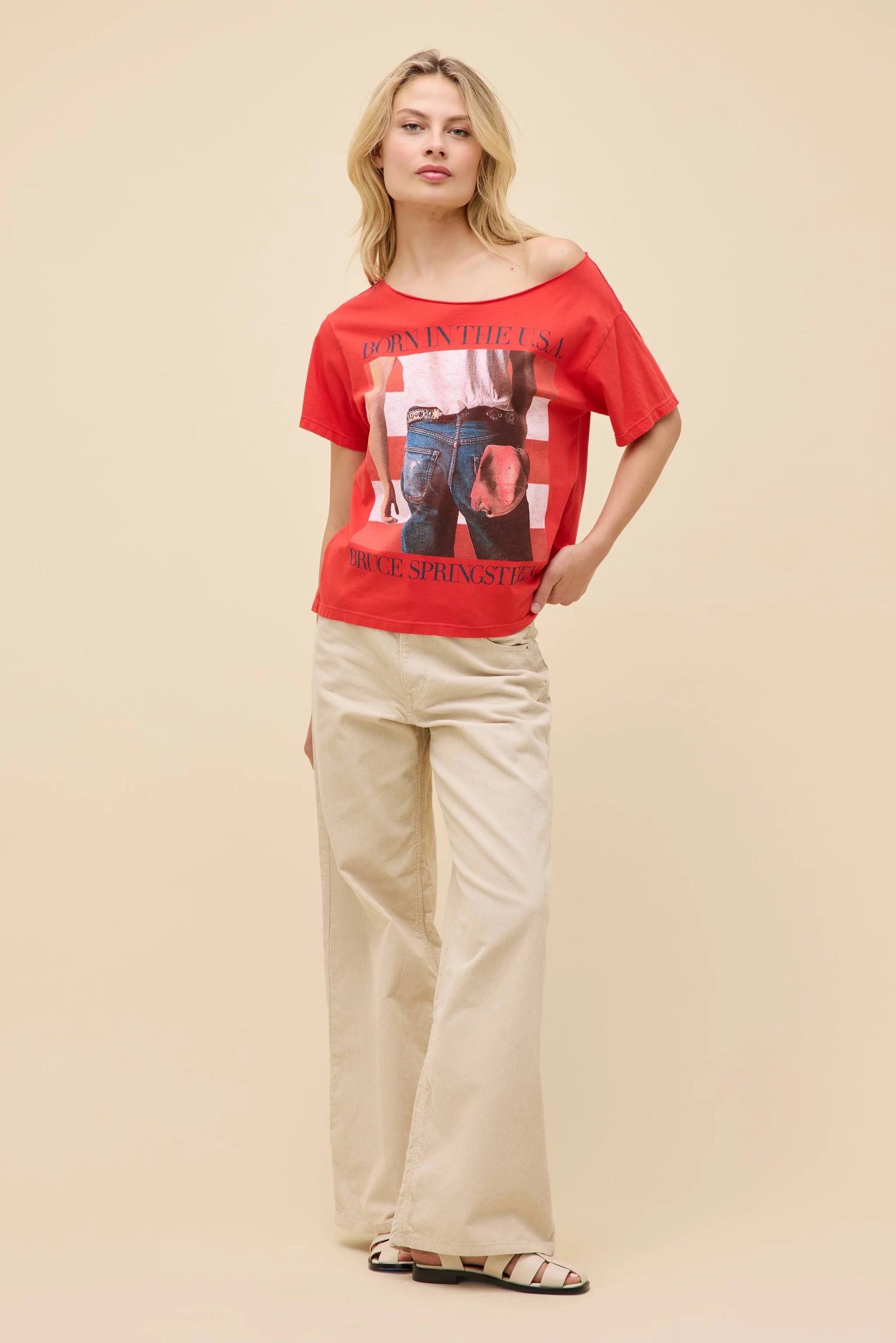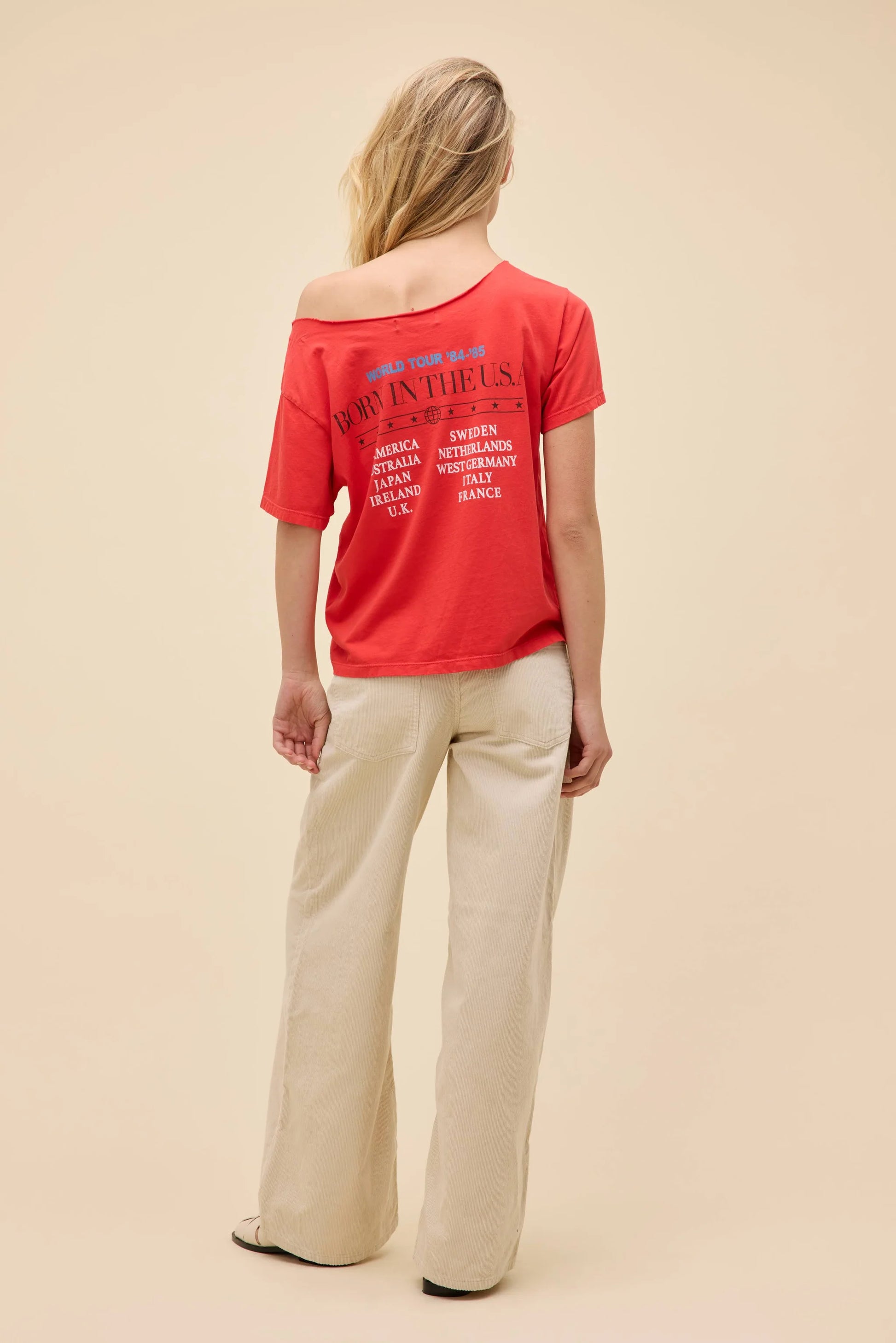 A best-selling graphic reissued on an off-the-shoulder tee paying homage to The Boss, one of the most iconic rock artists in music history and the voice of the working class. The release of Bruce Springsteen's Born in the USA single, album and corresponding '84-'85 world tour unleashed a revolution. The timeless track dipped into the trials and triumphs of the American working class, and became a massive hit with an anthemic chorus that still radiates today. Its artwork lands center on this top-notch tee with tour details stamped on the back from when Springsteen and his E Street Band hit the road.