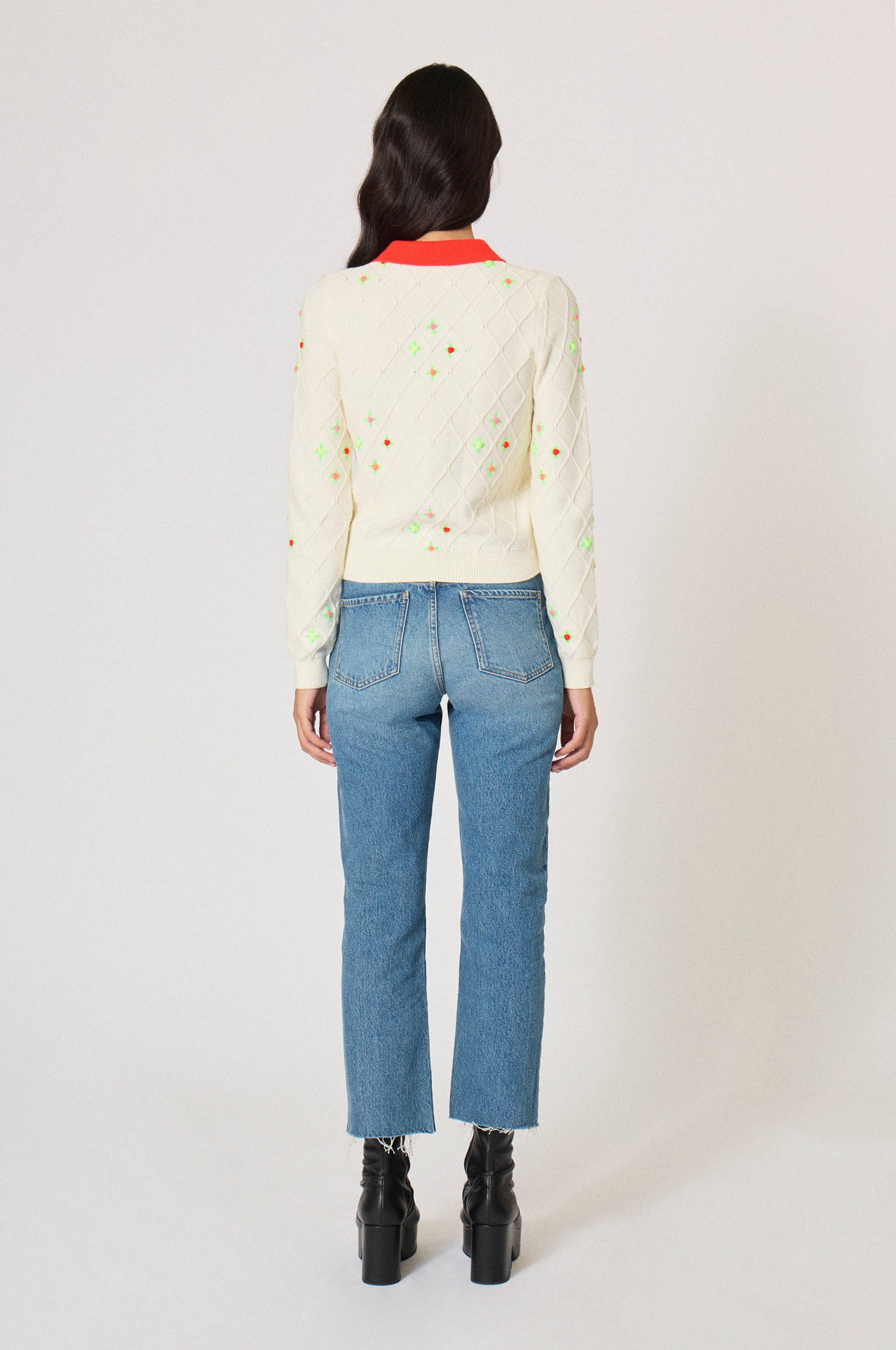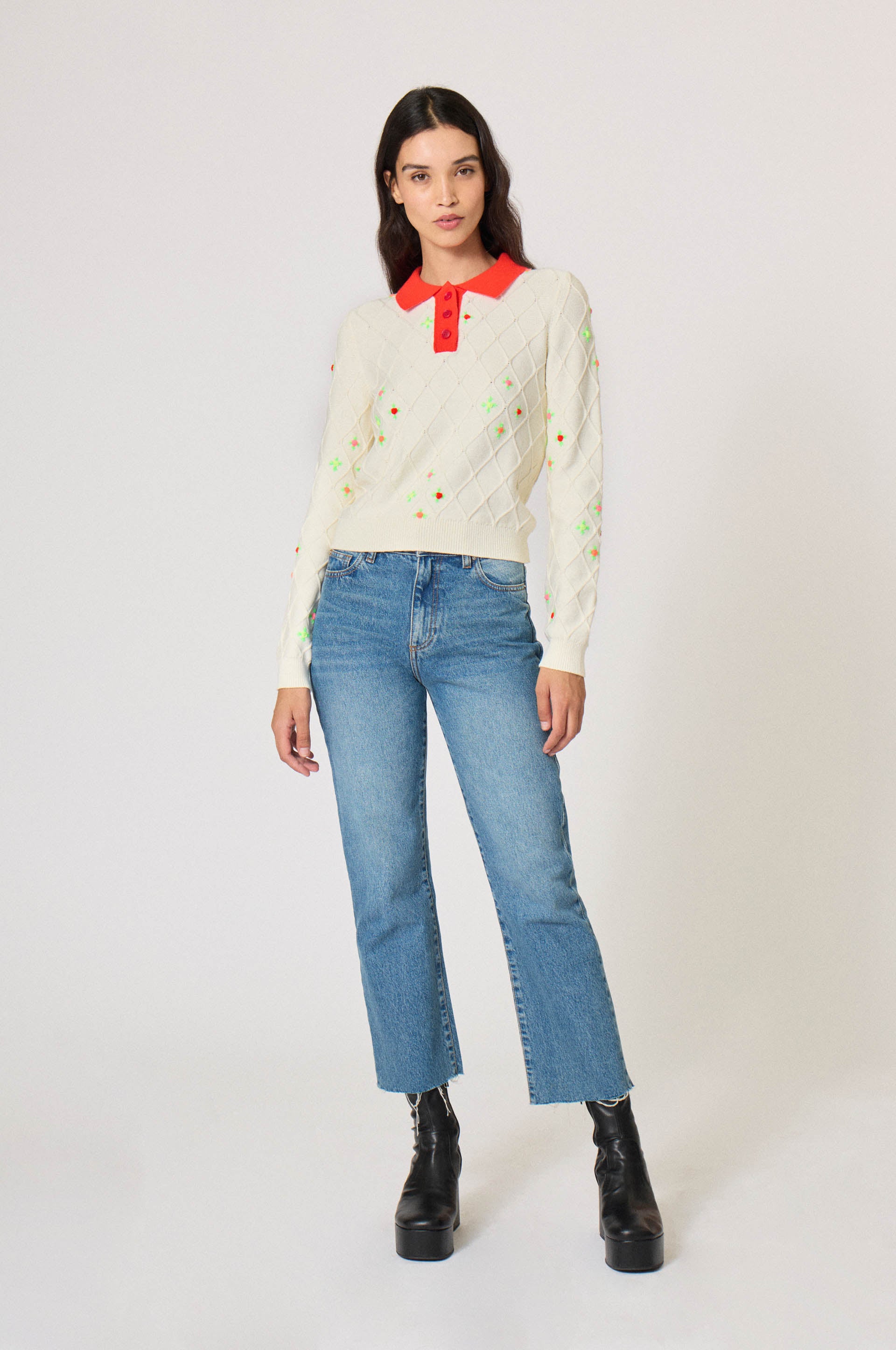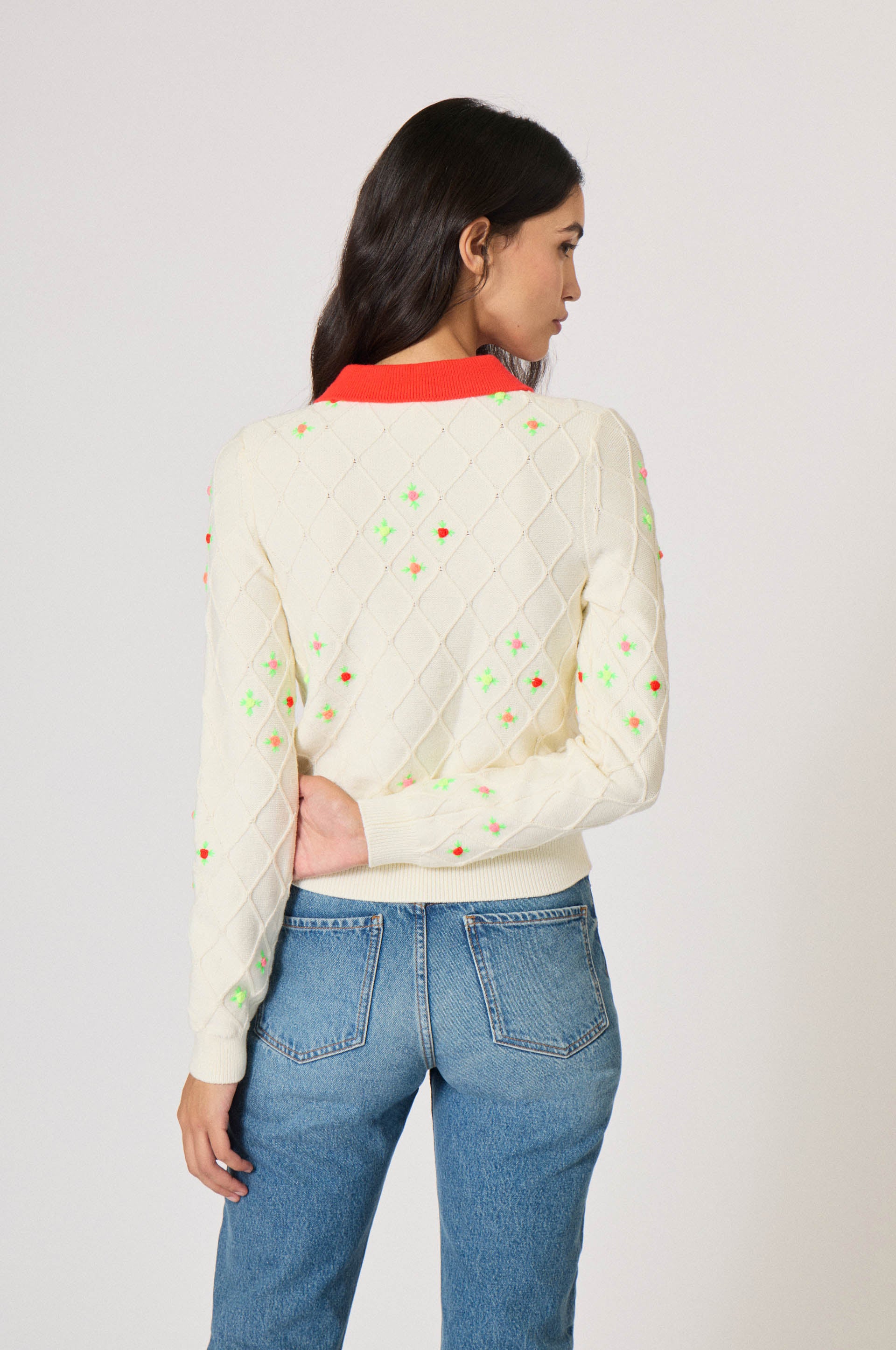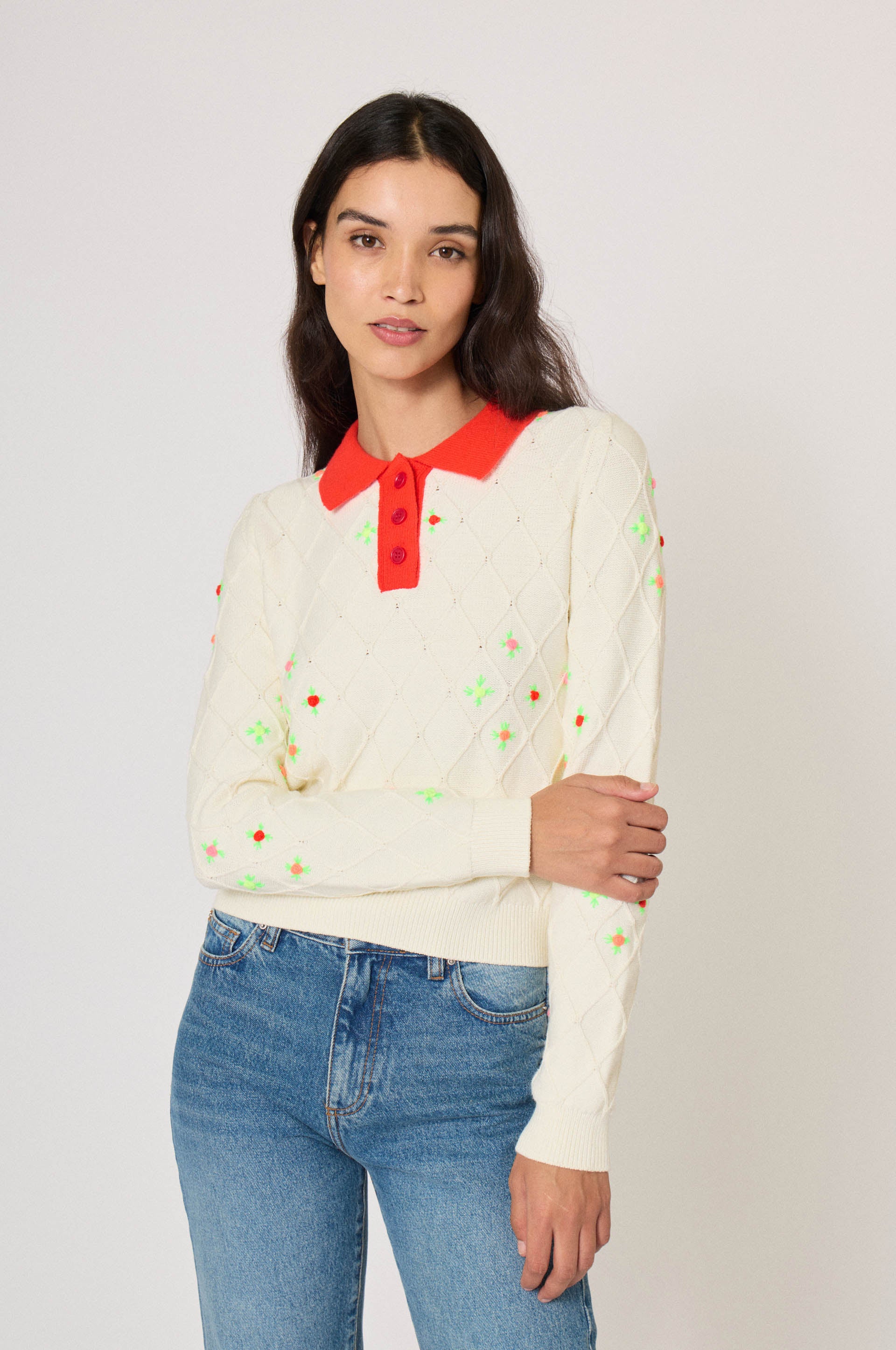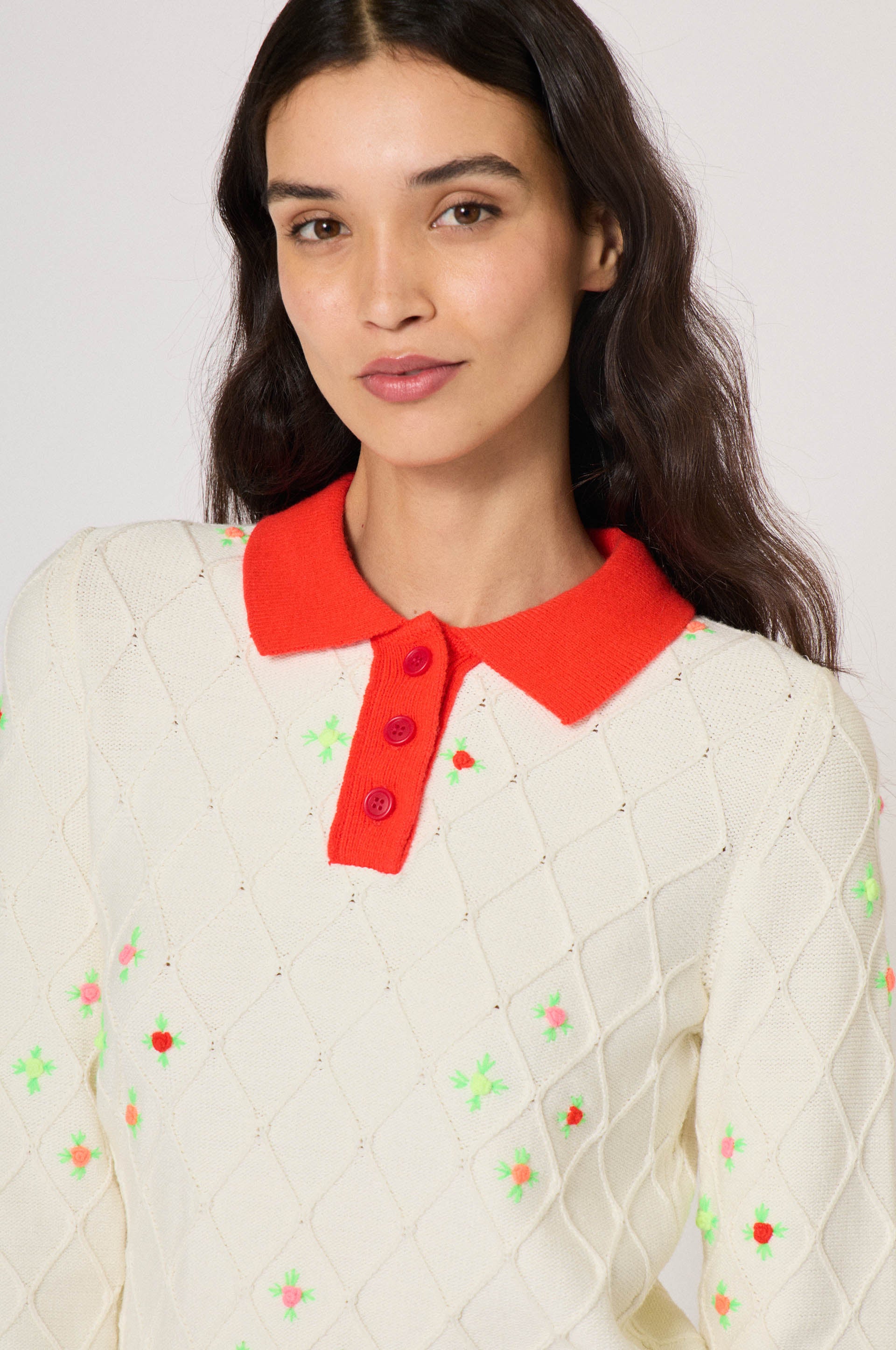 Diamond pattern knit. Small symetrical flower buttons. Red buttoned collar. Long sleeves.