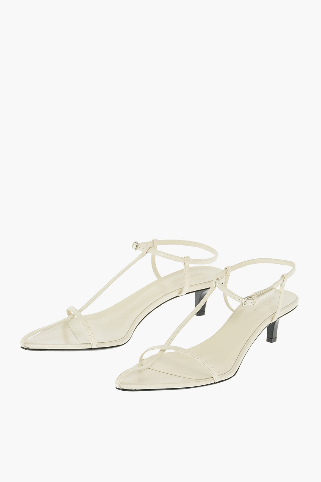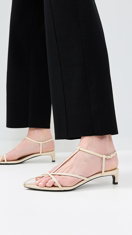 Pointed-toe leather sandal with interwoven straps and low heel.