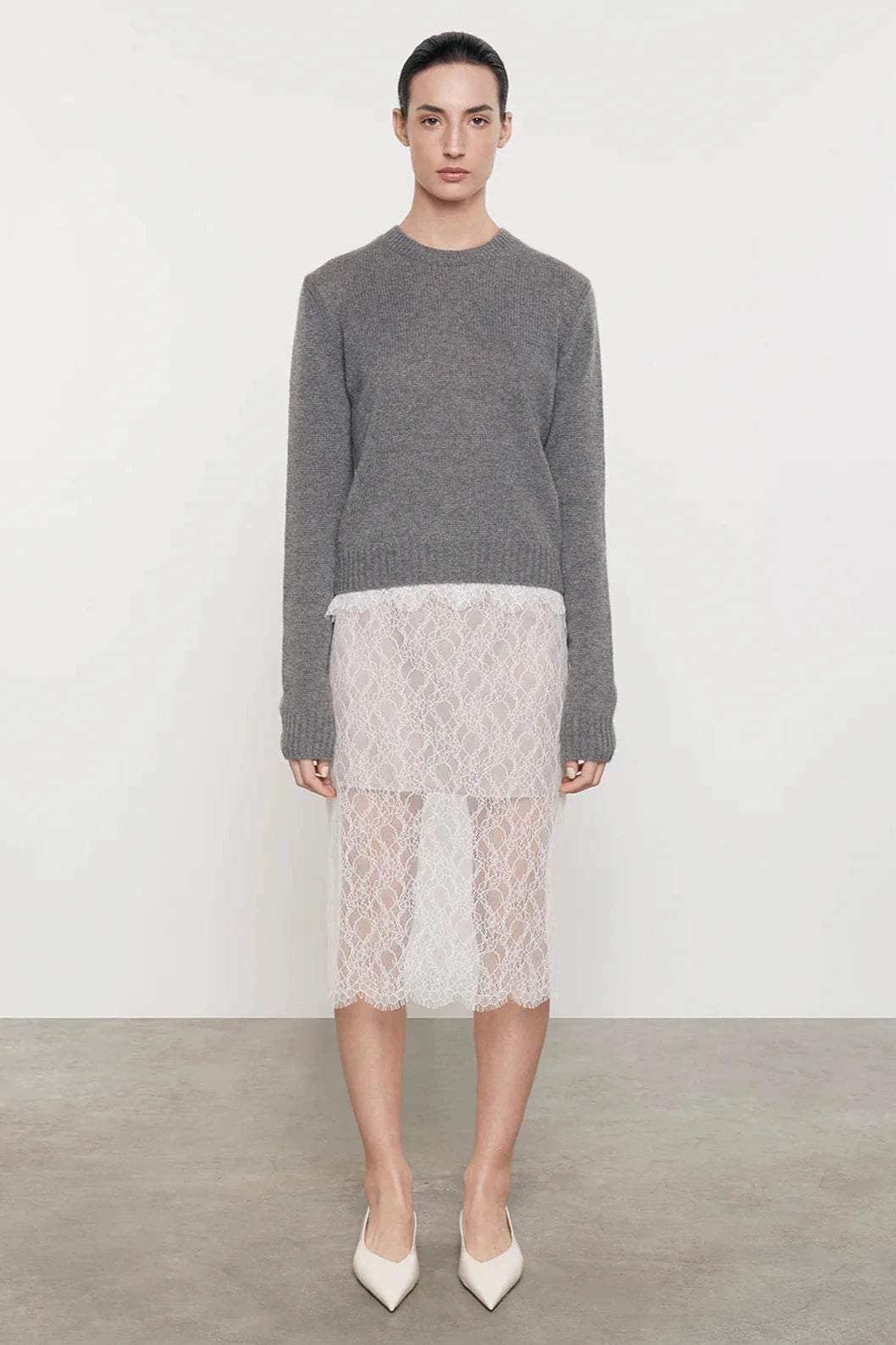 A classic crewneck sweater knitted from a soft cashmere-cotton blend. Designed to be slightly oversized, featuring a boxy fit with raglan sleeves and a loose, natural drape.