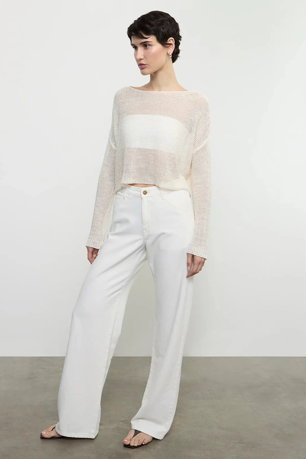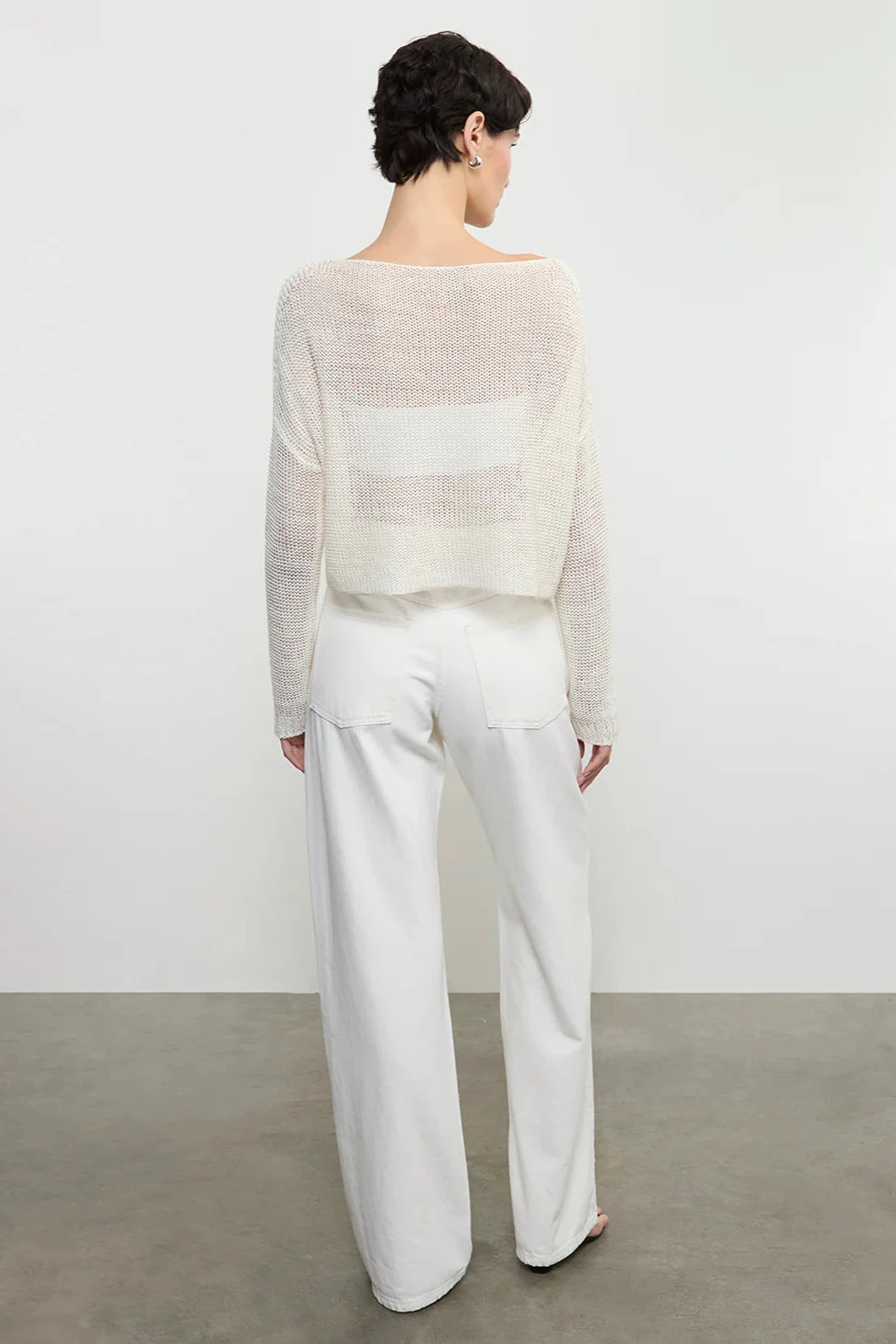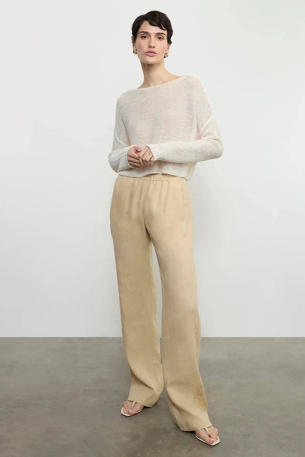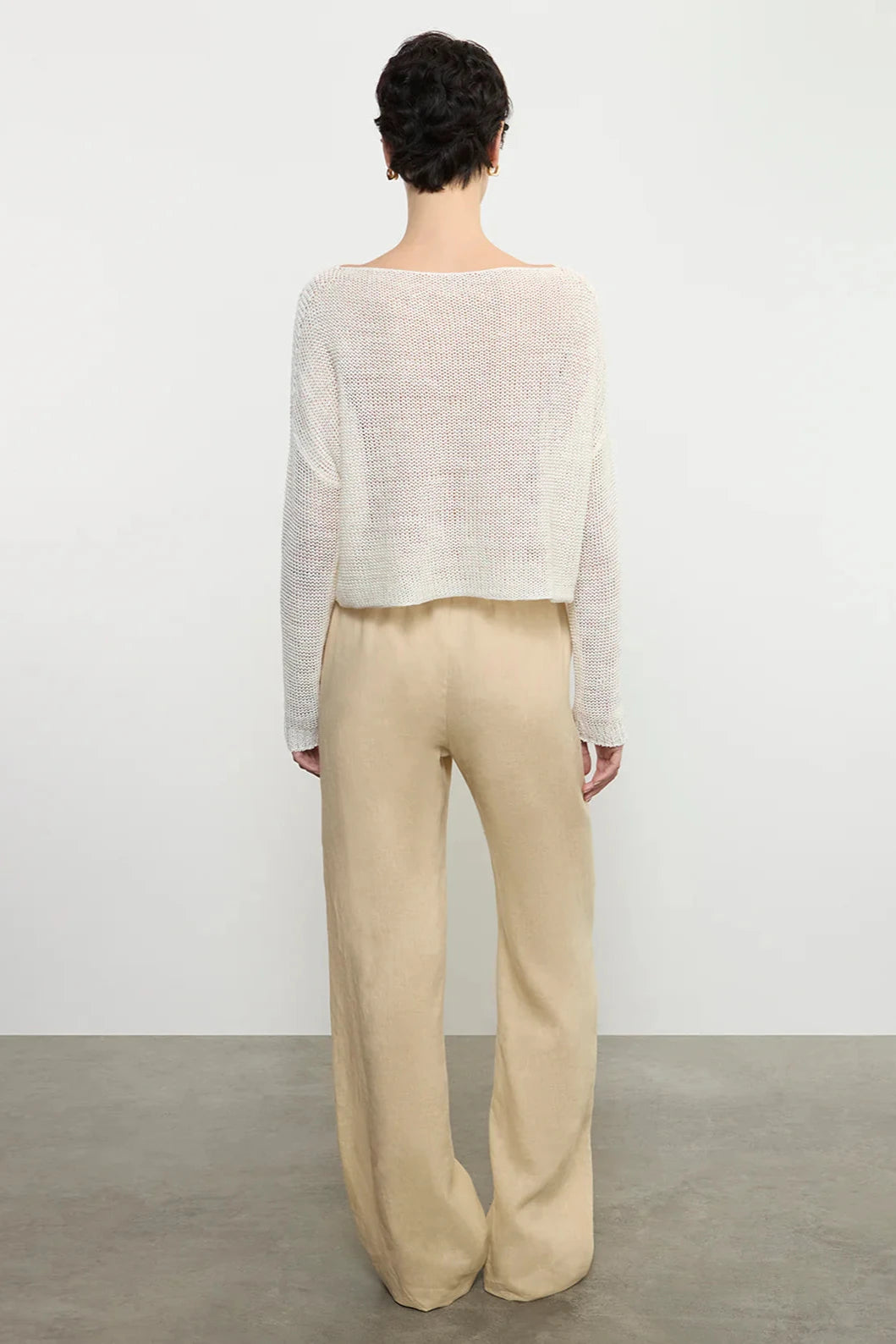 An open-knit pure linen sweater with a classic bateau neckline and waist-length cut. Relaxed fit through the body.