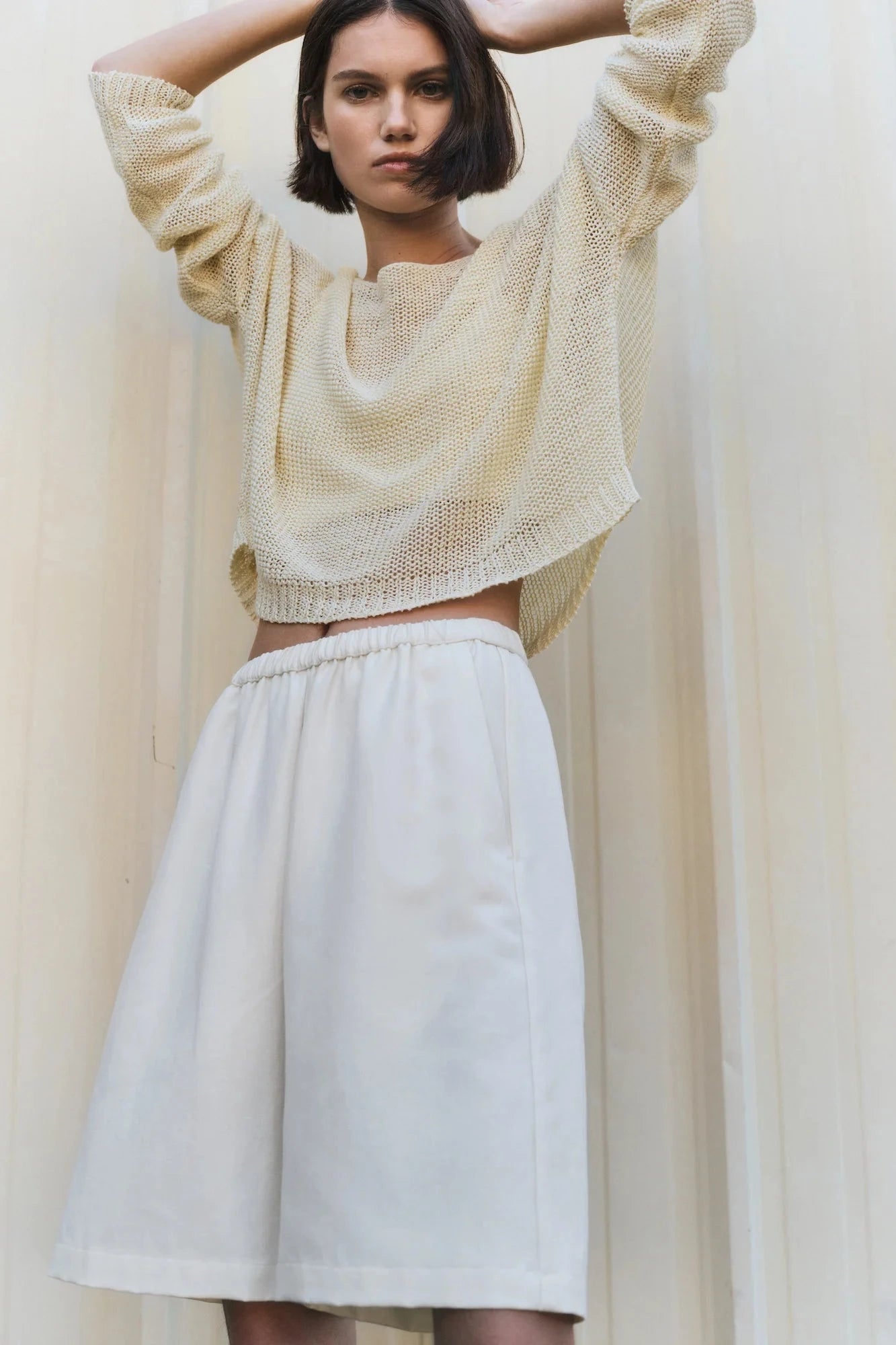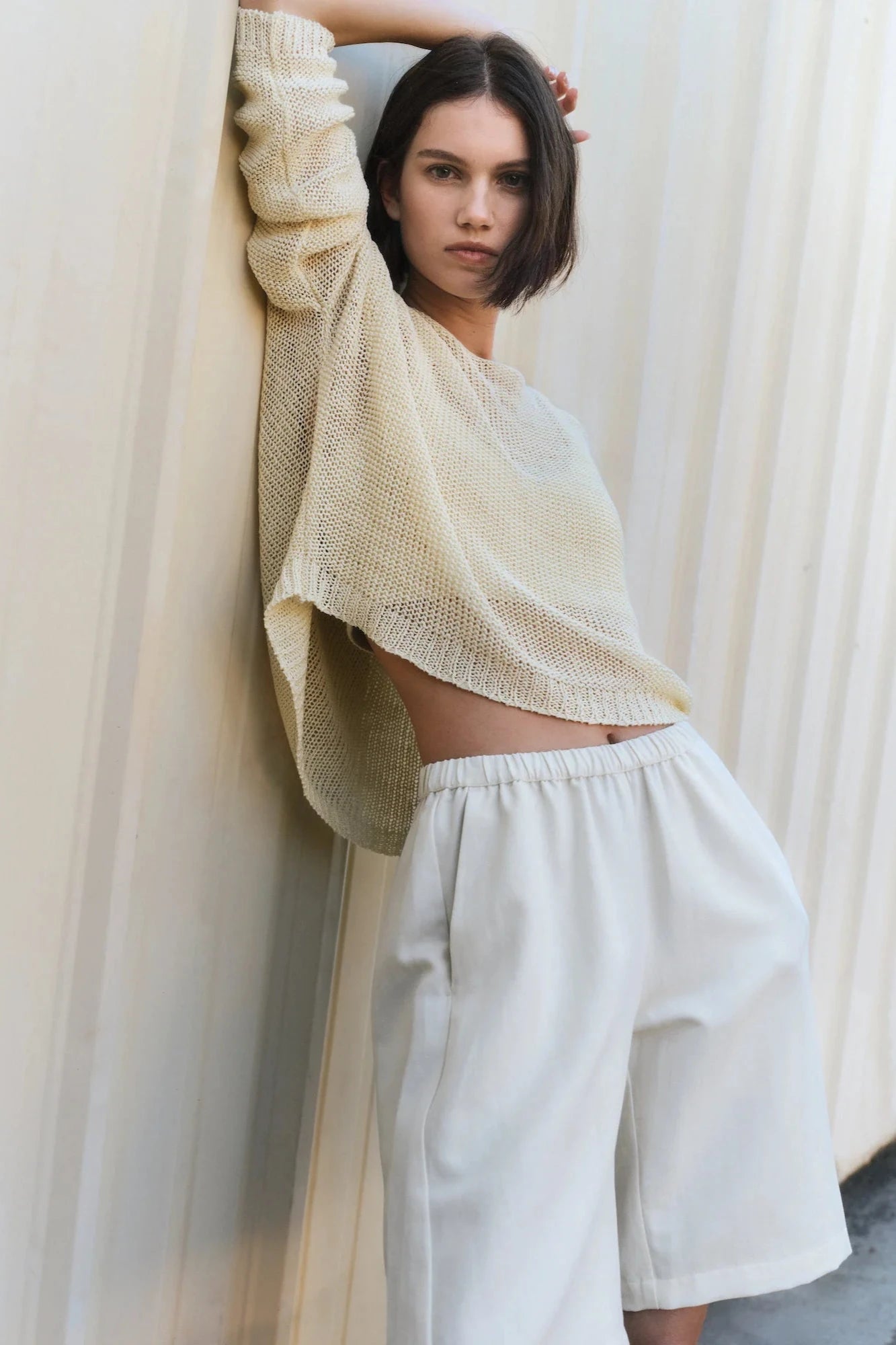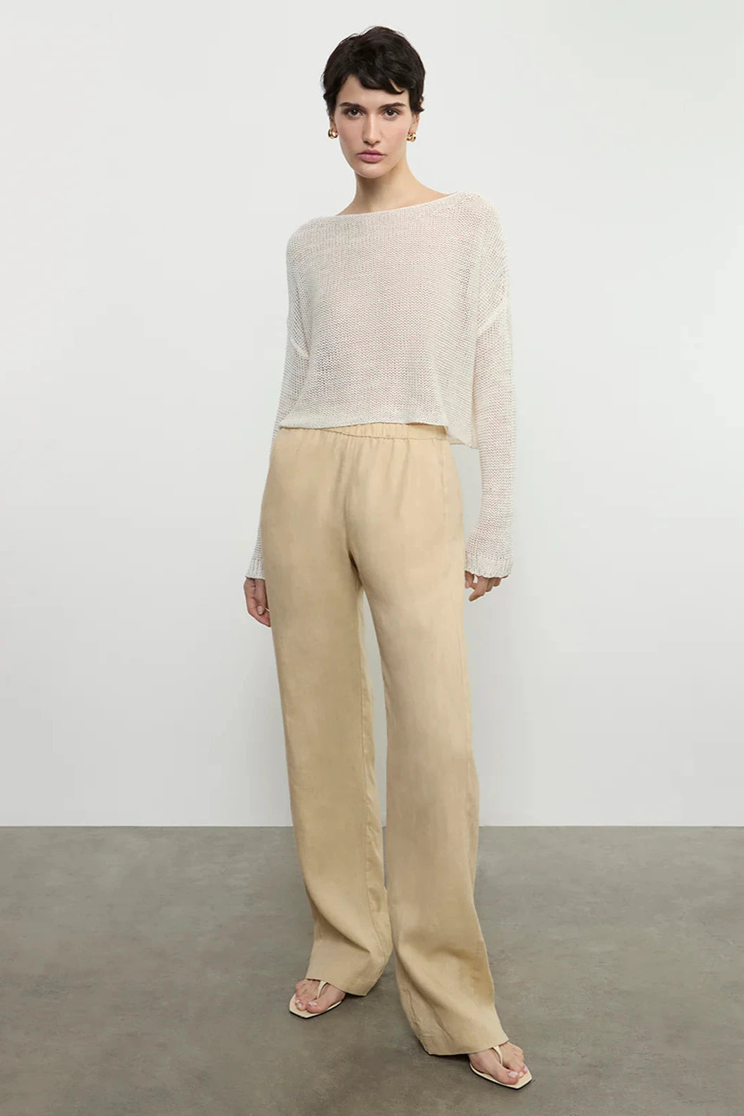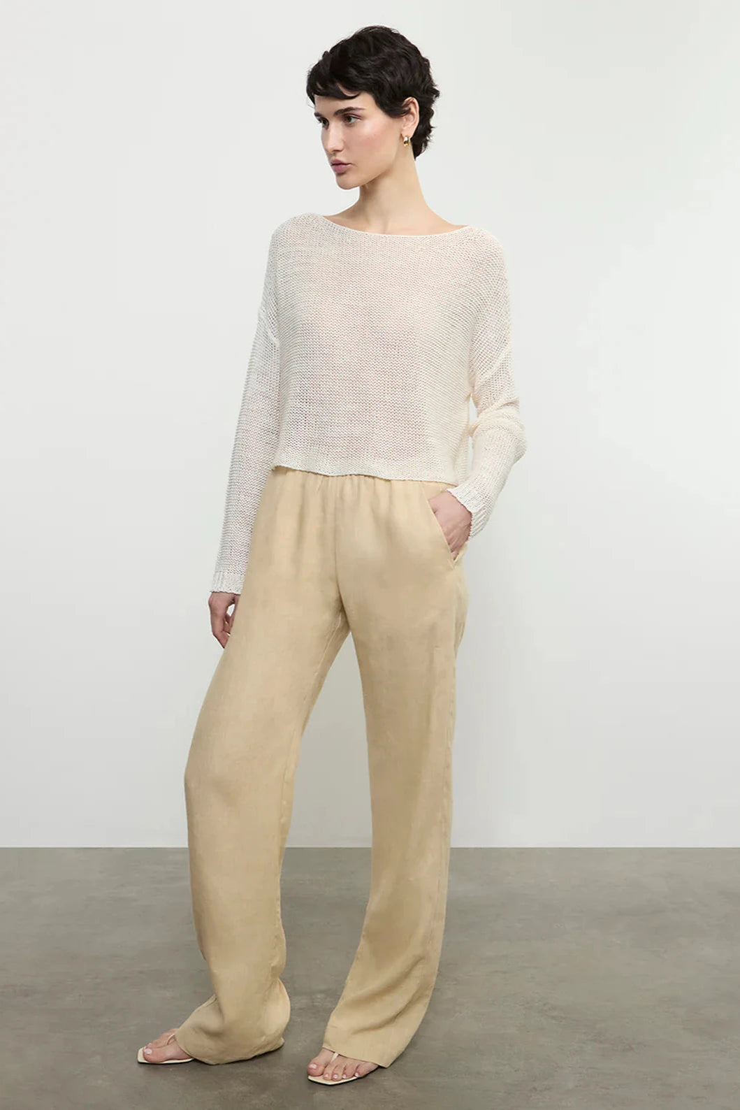 An open-knit pure linen sweater with a classic bateau neckline and waist-length cut. Relaxed fit through the body.