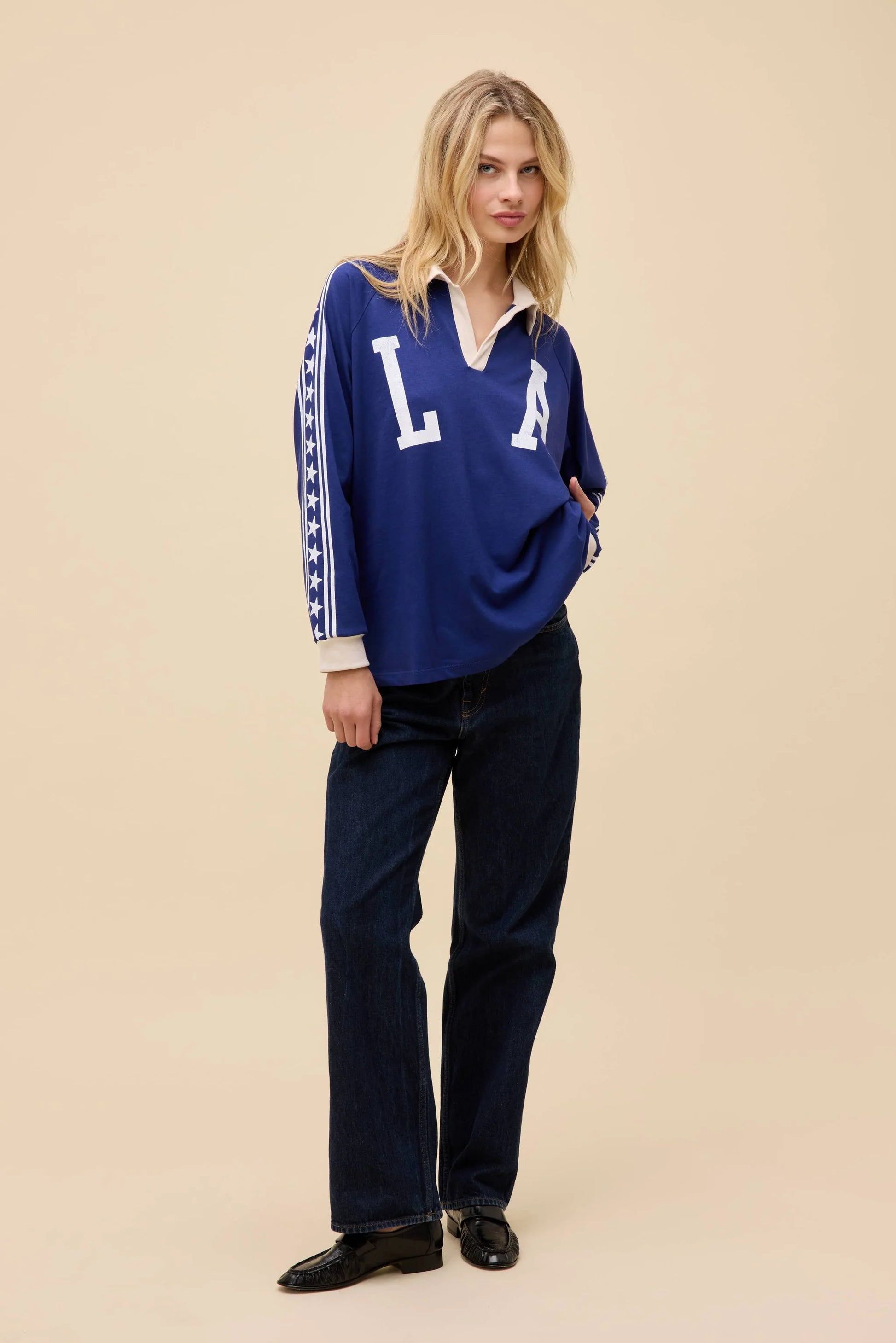 Show your spirit in a winning Raglan Rugby Long Sleeve featuring a shoutout to Los Angeles across the chest and star detailed sleeves. Designed in an oversized fit with a collar and placket.