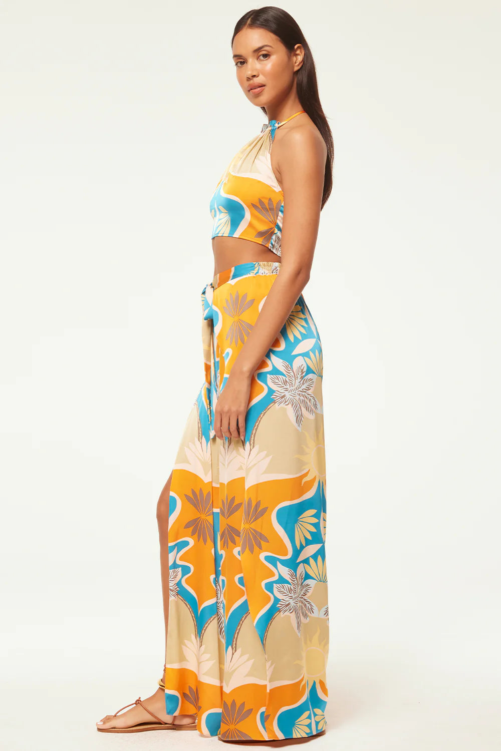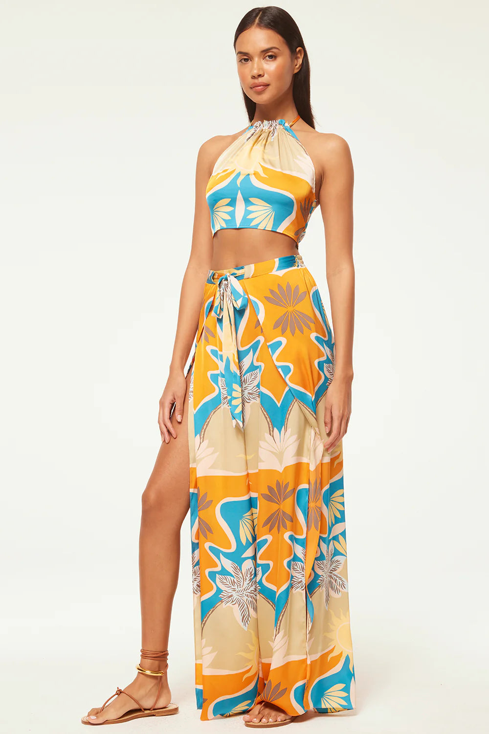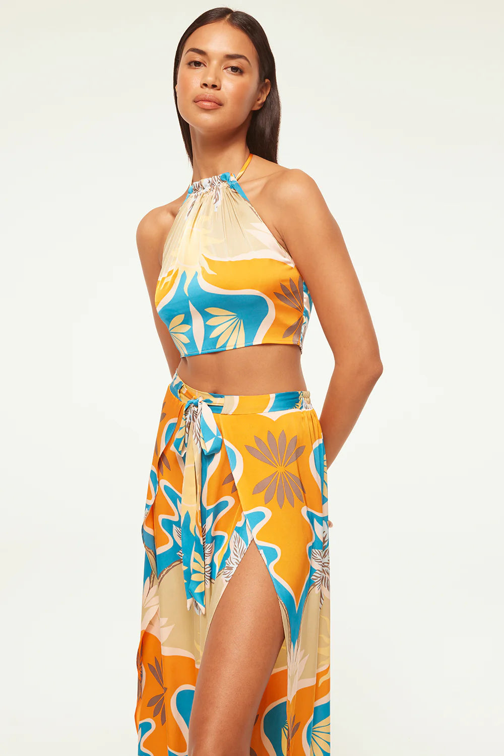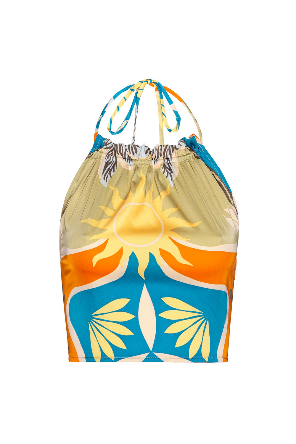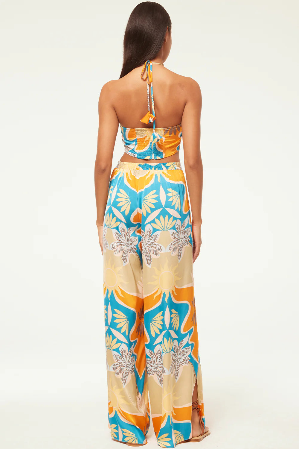 The Luan crop top is a Summer standout, cut from our stunning Bain de Soleil printed satin. A halter neckline is finished with our signature petal tassel ties. A smocked back provides a comfortable and flattering fit. Pair with the coordinating Kanna pant for a getaway set sure to stun.
