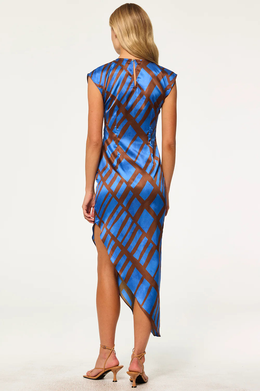 Lydia is a modern silhouette in our striking blue and brown Matrix printed satin. Sleeveless with a high neckline and a back button closure at the neck, it’s fitted through the bodice and hips for a sleek shape. An asymmetrical skirt starts at a mini length and extends to a point just above the ankle. Pair it with heels or flats to suit the occasion.