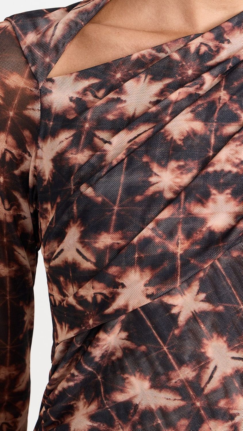 Our Marina dress is a chic new midi silhouette in our Angel Glow tie-dye mesh. A fitted bodice with high gathered neckline is double lined and leads into an asymmetric handkerchief hem. Long fitted sheer sleeves. Gathered ruched details at the bust and diagonal across hip provide a flattering fit. Pair with boots for a street-style worthy fall look.