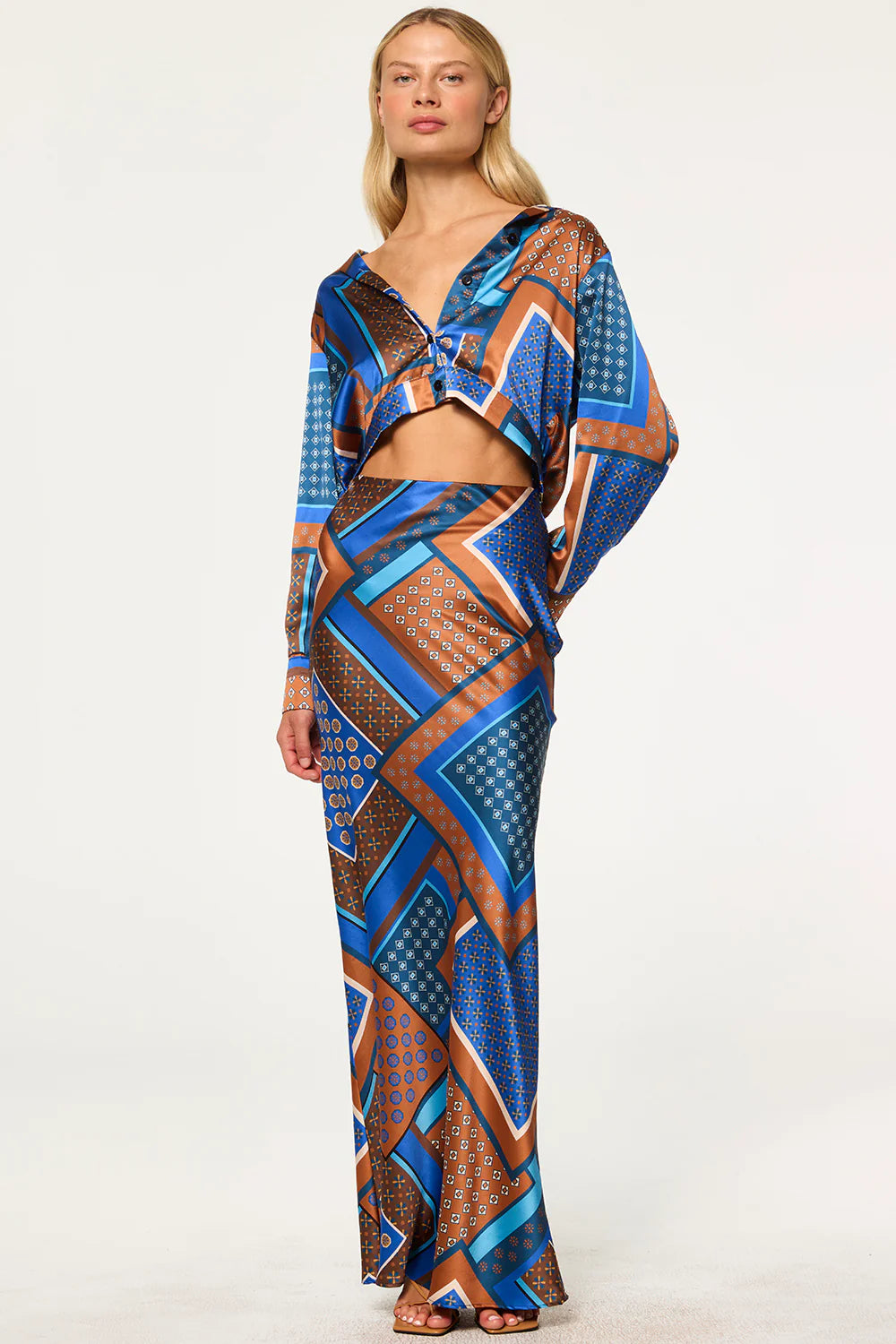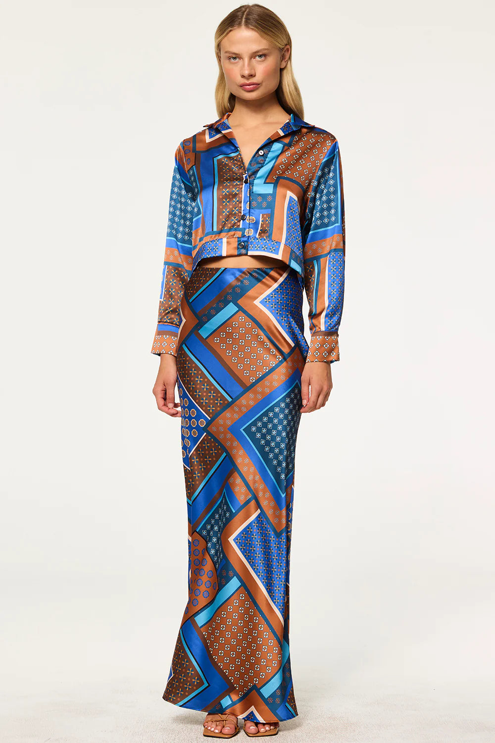 Nadine is a chic cropped shirt jacket in our vibrant Tile Patchwork printed satin with rich brown and electric blue hues. It features a foldover collar, V neckline, button front, and long sleeves with button cuffs. Gathered at the back yoke for a blouson fit and finished with a banded bottom, Nadine pairs perfectly with a white tank and denim or the coordinating Sierra skirt.