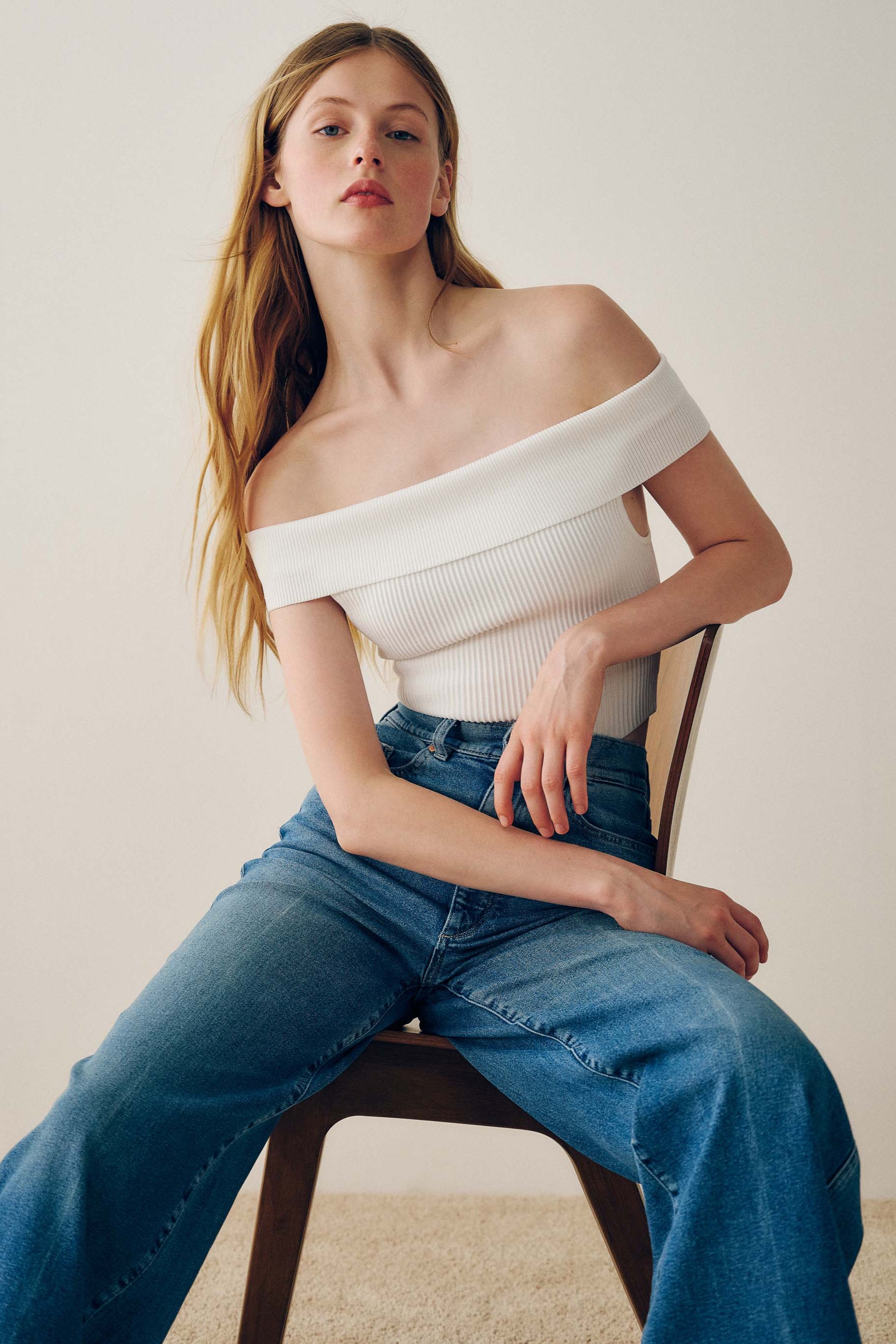 The Off Shoulder Top is made of a smooth, slimming and sculpting rib. It's designed to sit off the shoulder for easy wear. White is a bright white sculpting rib knit with clean finishing.