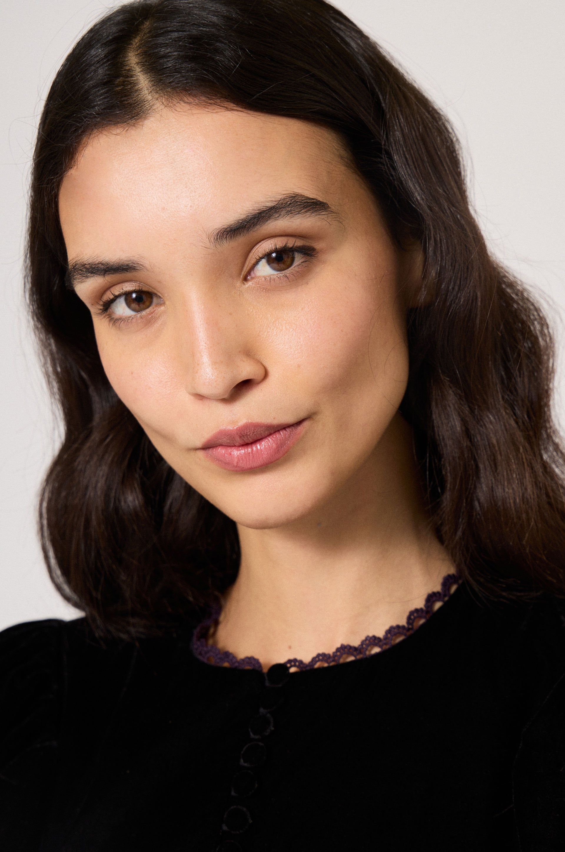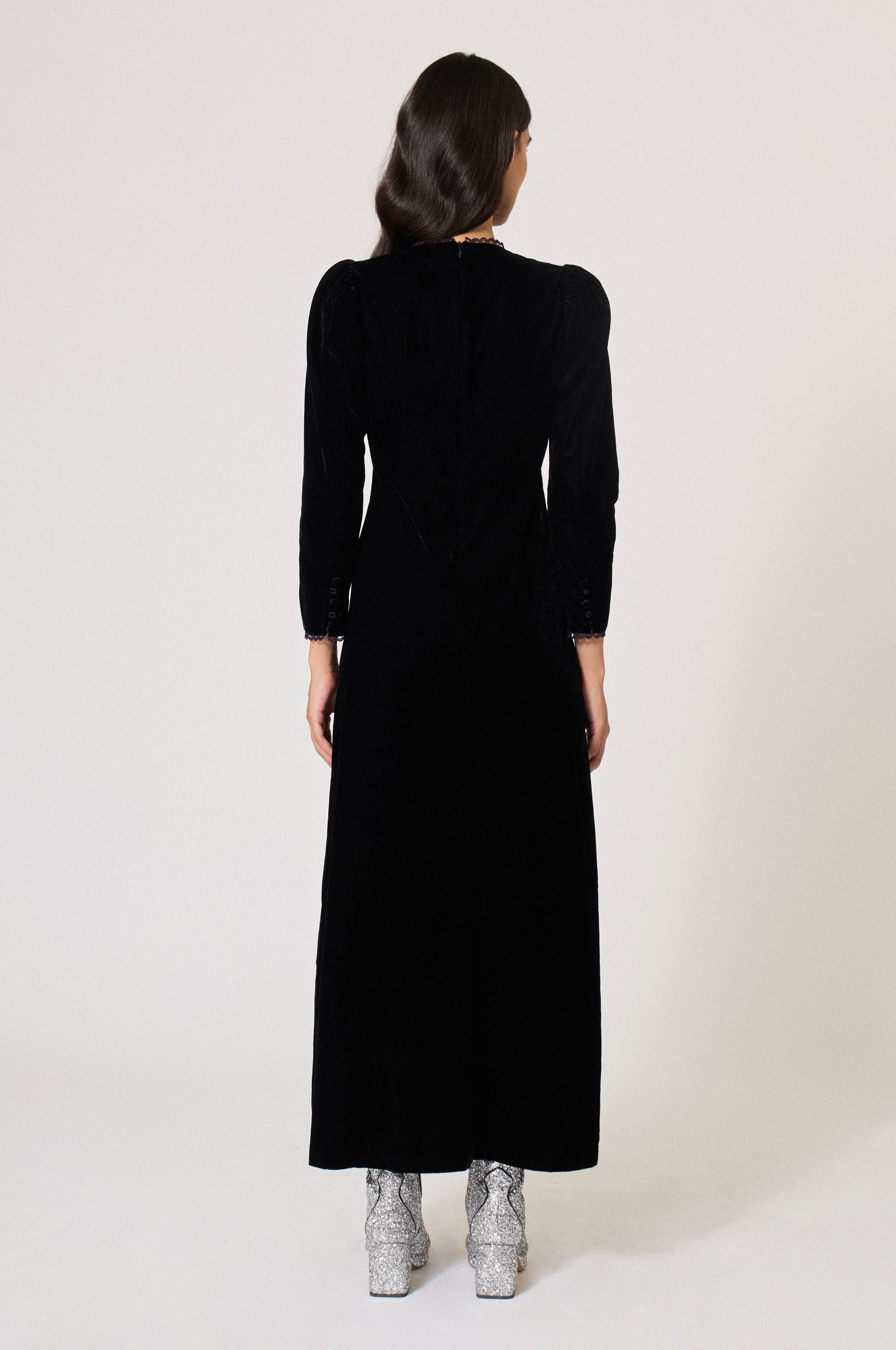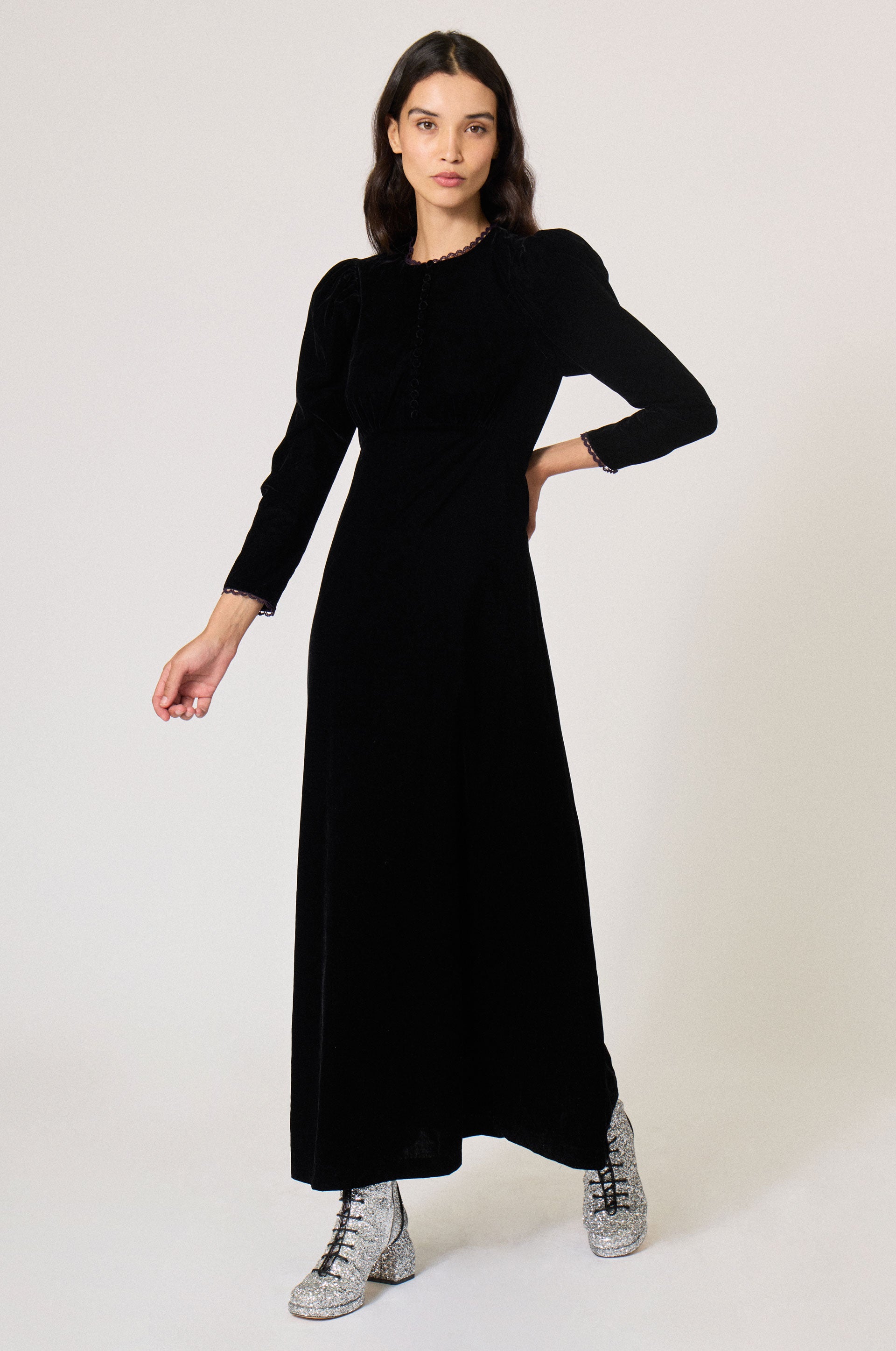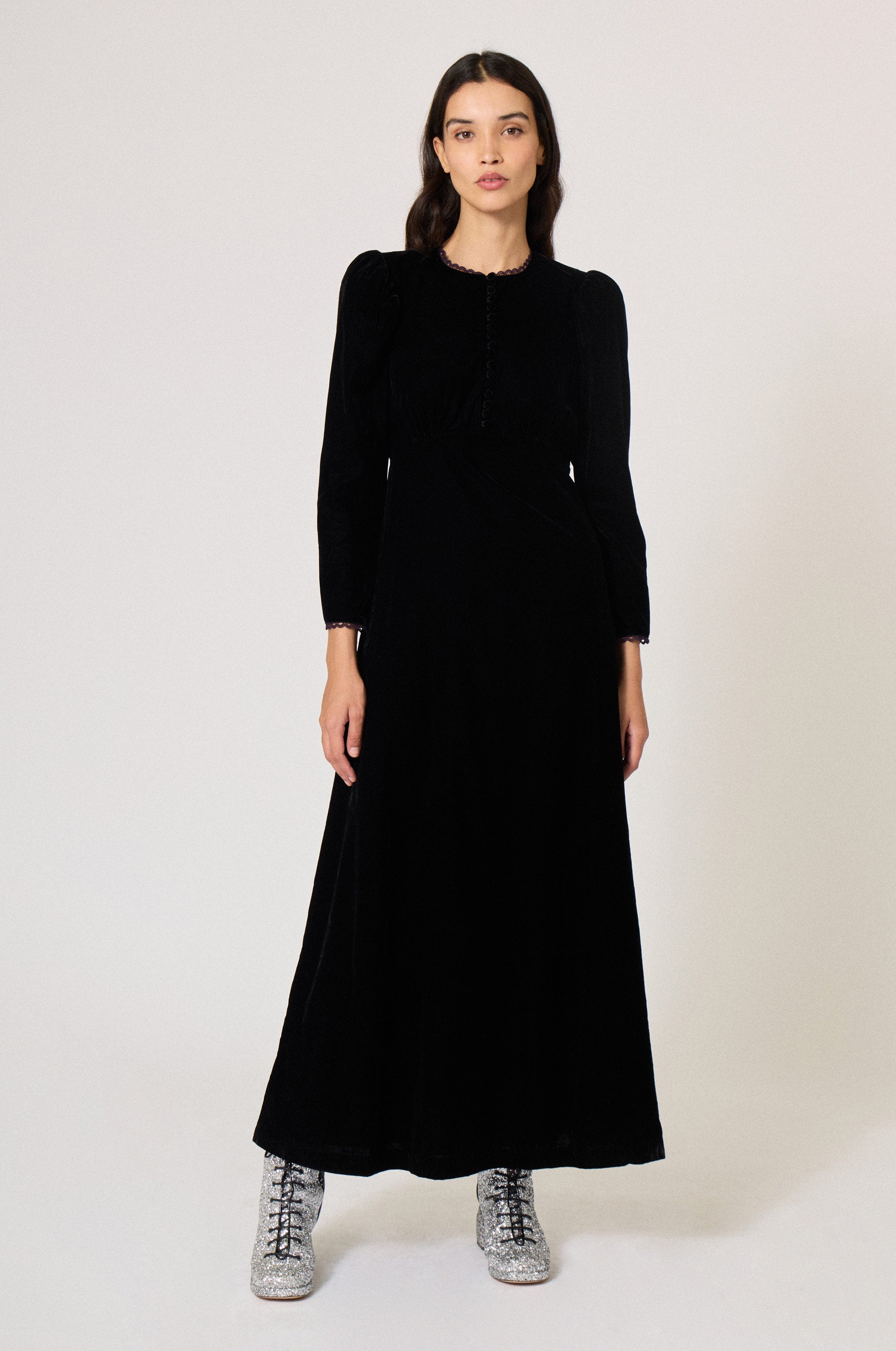 Velvet long empire dress. Lace trim. Vintage front button closure. Round collar. Back zip fastener.