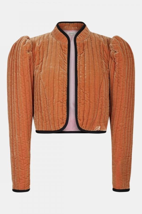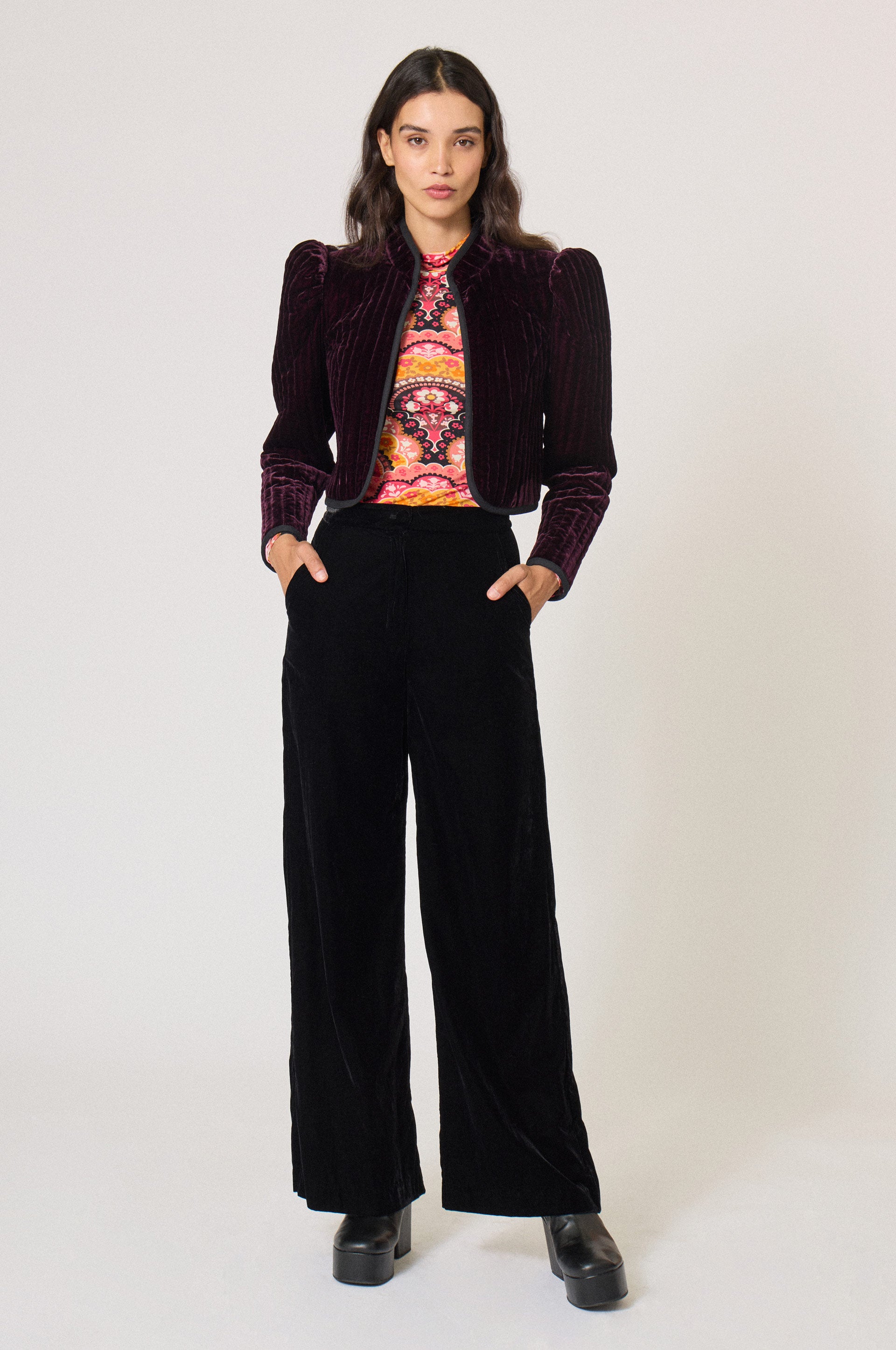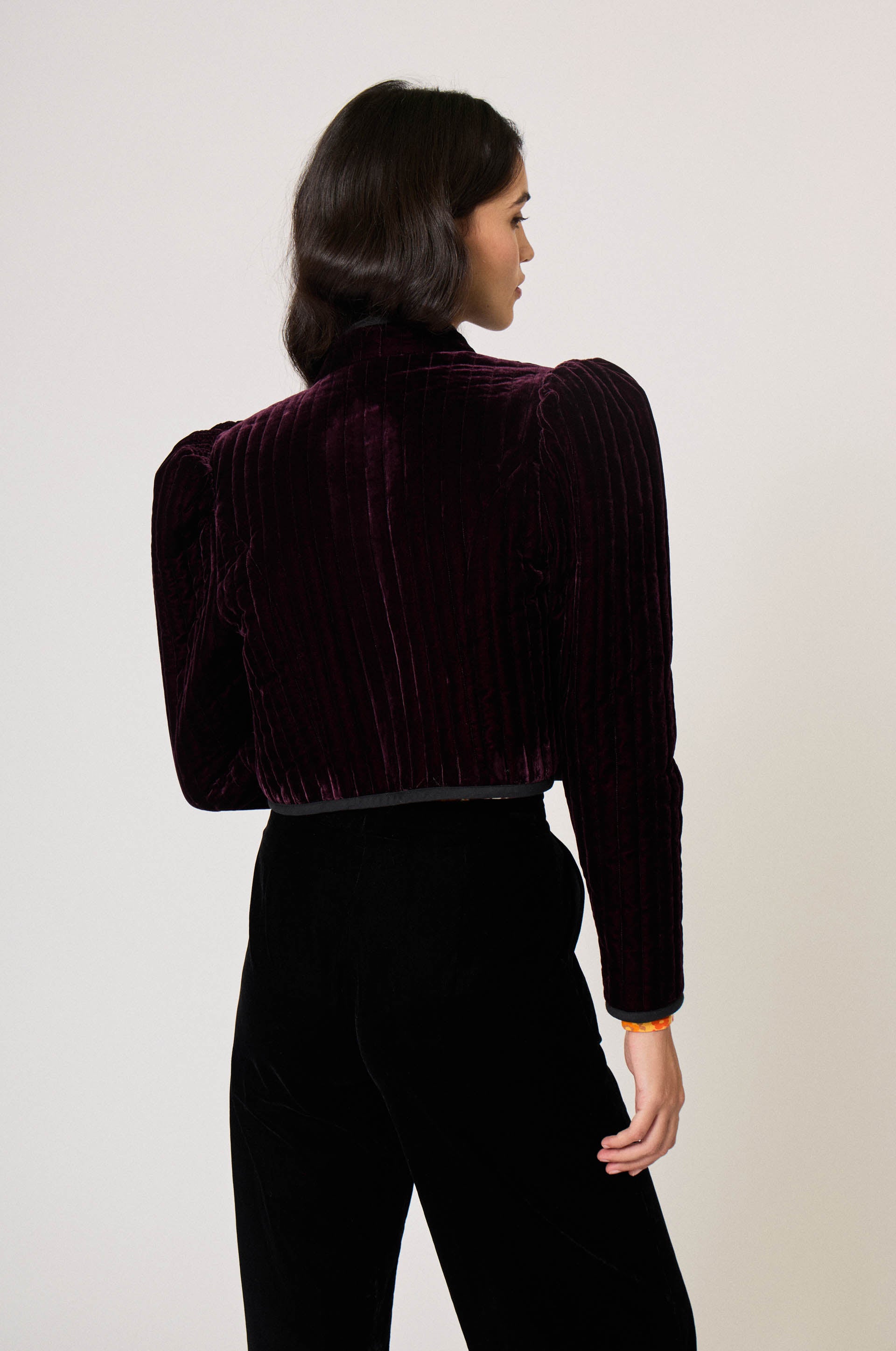Quilted velvet jacket. Long balloon sleeves. Mockneck. Pink satin lining.