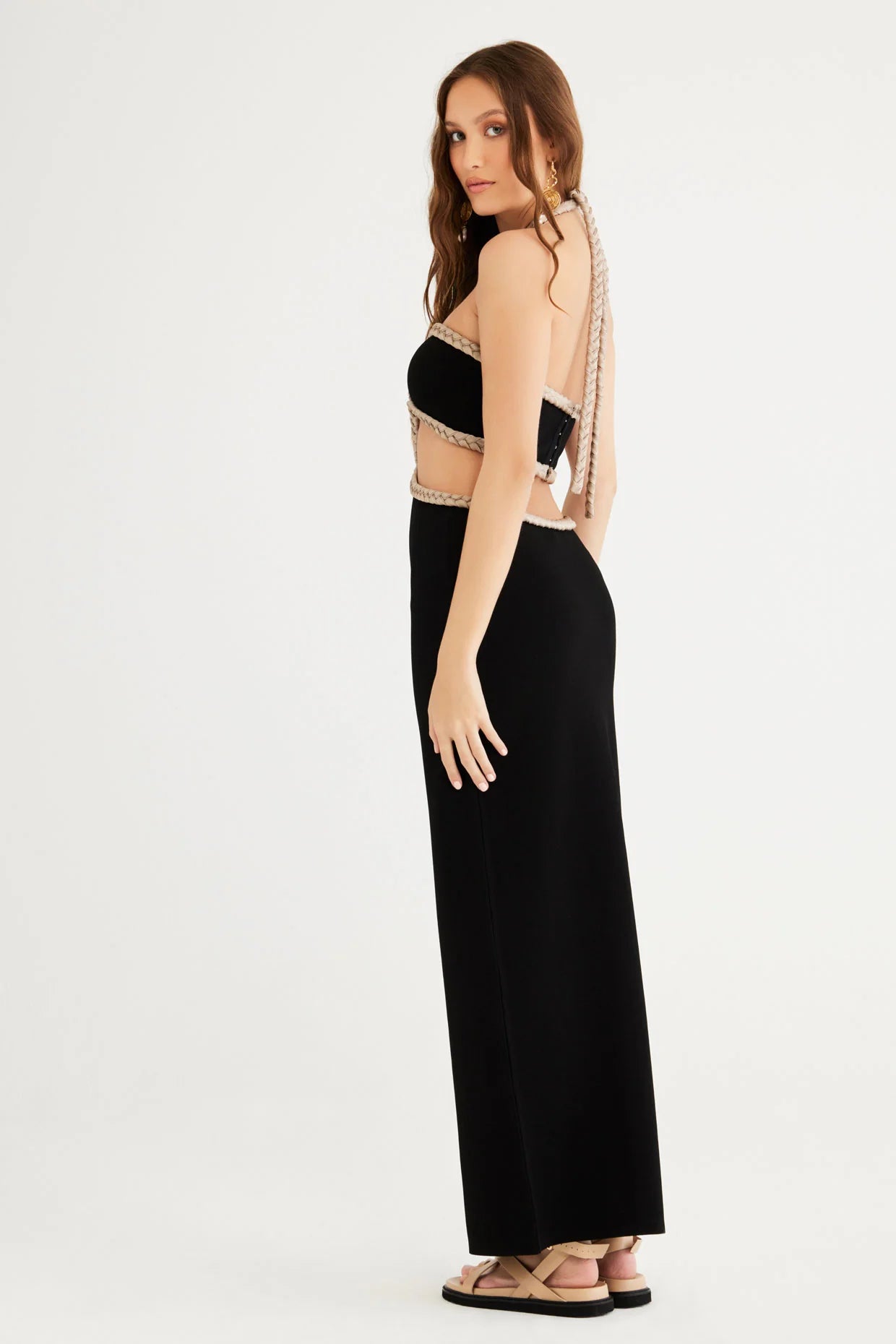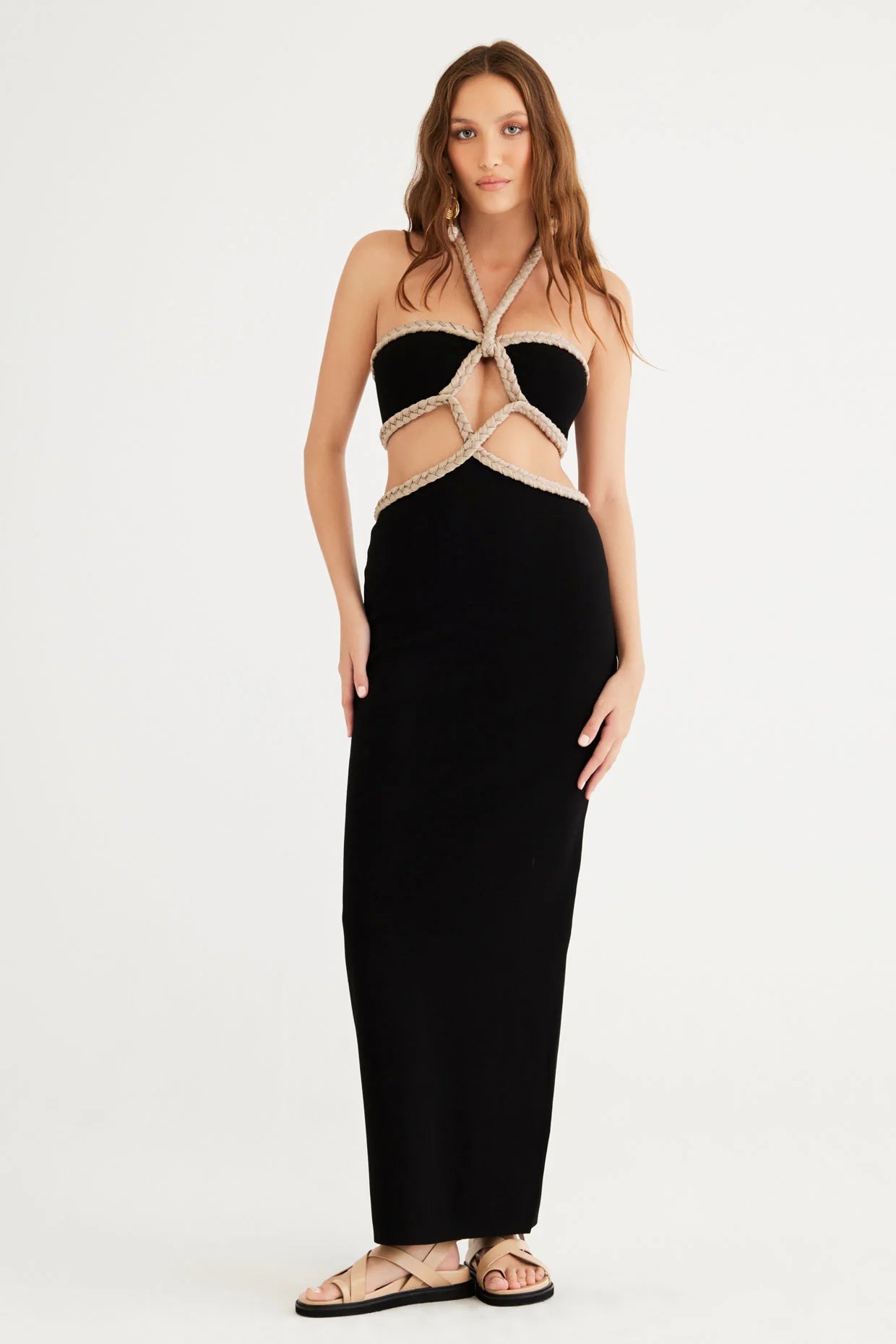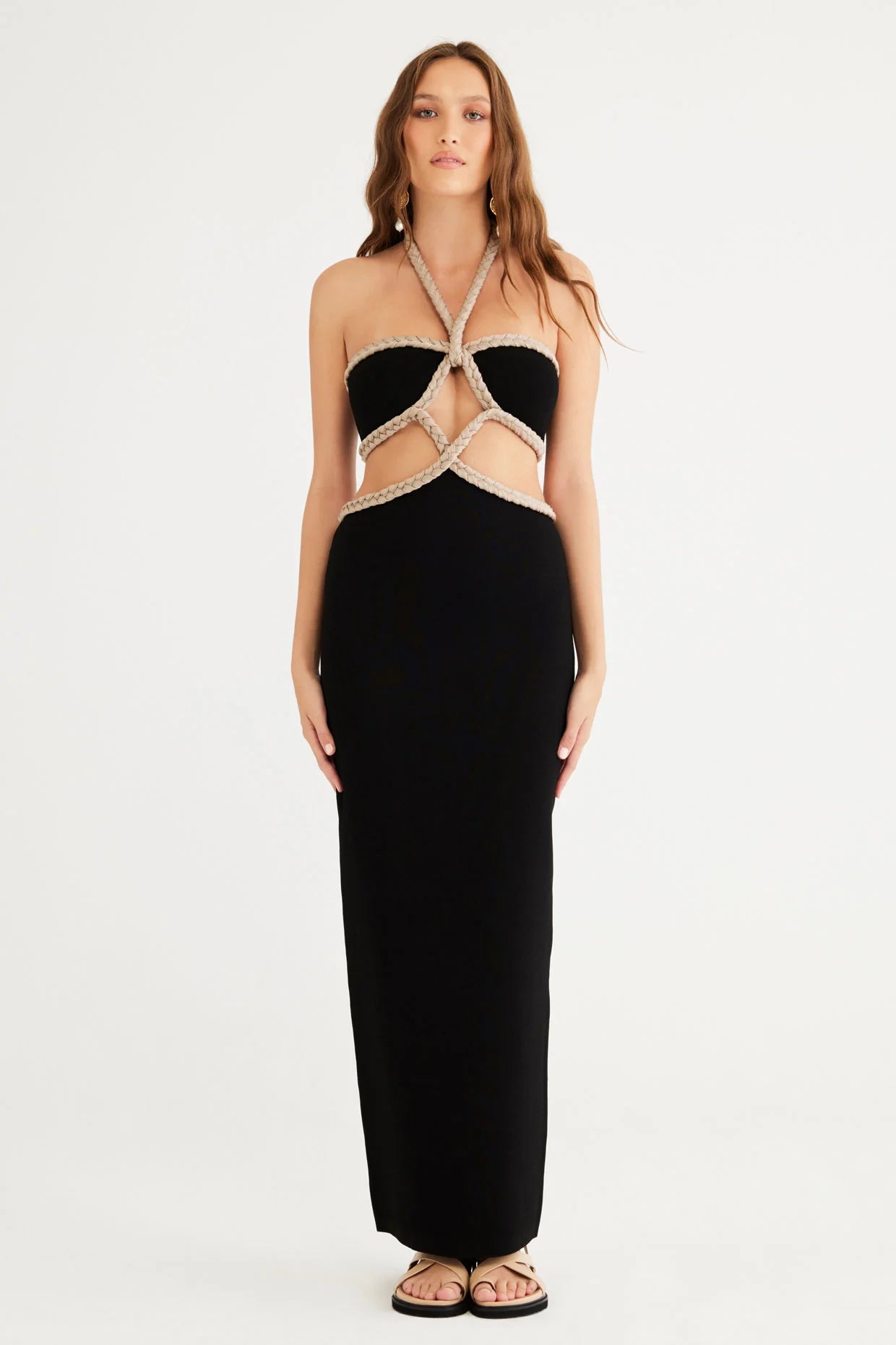 Beautiful floor length design crafted from our figure hugging textured knit. Features a bandeau style fit, striking cut-out details & a gorgeous rope element lining the bust, waist & straps. If you are between sizes, we recommend sizing down in this style.