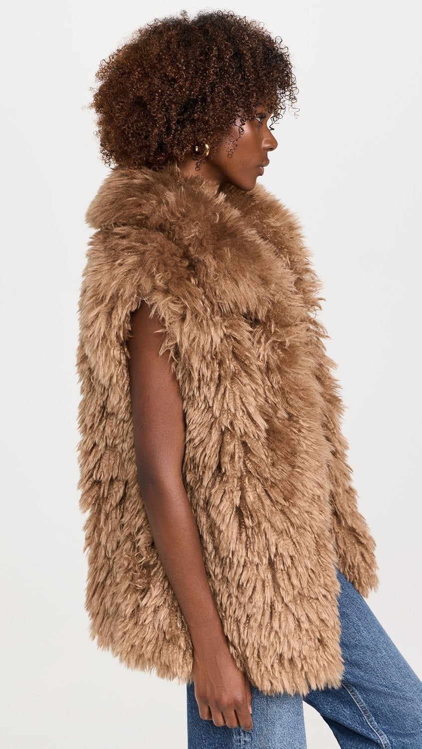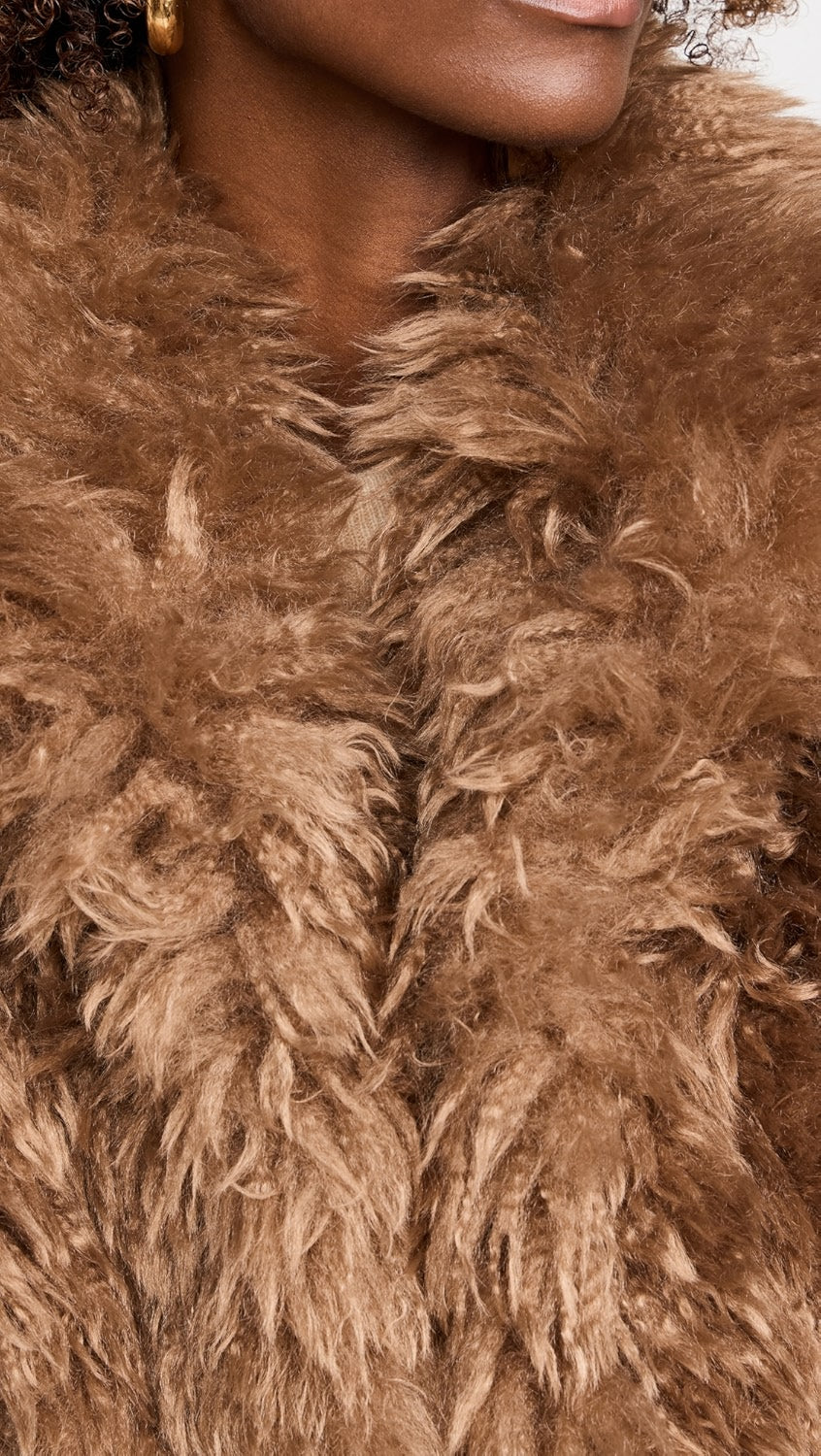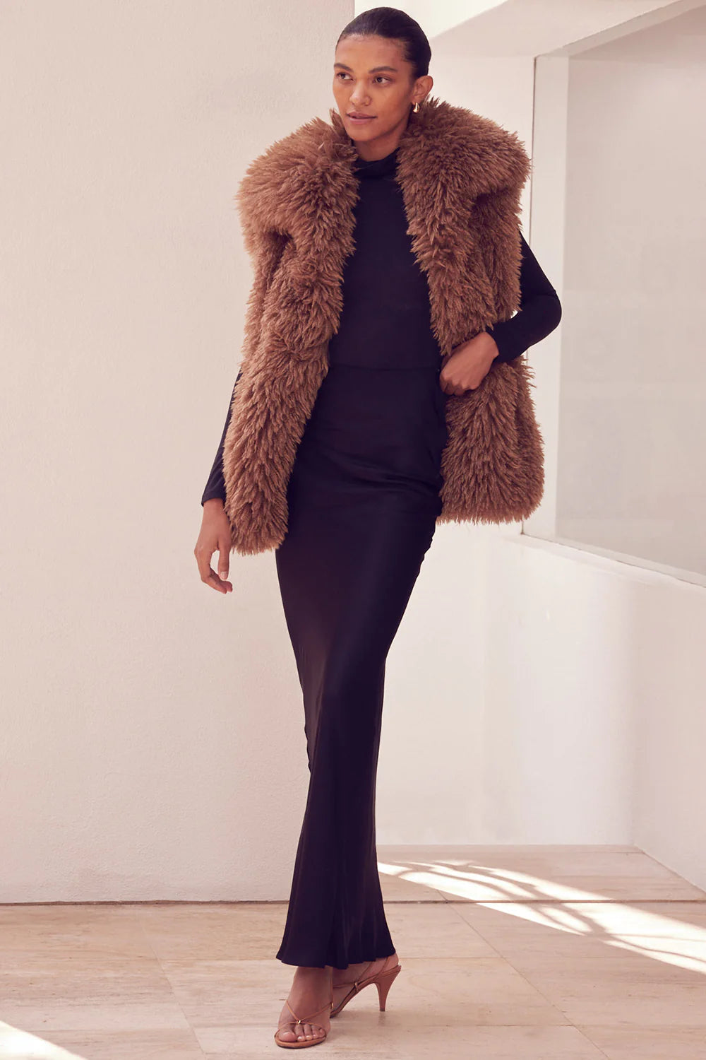 Our new Ryleigh faux fur vest is a chic piece to add to your outerwear rotation. This soft and cozy vest has a fold-over collar and hits below the hip. Featuring hidden front hook and eye closures and double slit pockets. Satin lined. Throw on over any of our dresses or with our mesh tops for the perfect layering look.