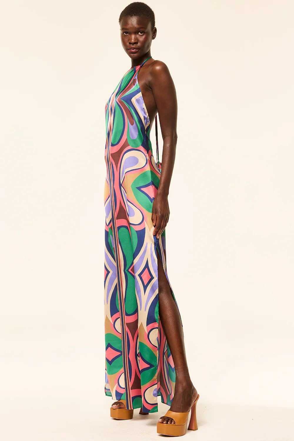 The Samantha Dress is a striking halter maxi cut from our luminous Butterfly Mirror–printed satin. The neckline ties with signature petal tassels, while a dramatic open scoop back flows into a sweeping skirt with double thigh-high slits. Finished with a hidden back zip, it’s perfect dressed down with flat sandals for a warm-weather escape or elevated with strappy heels for your next event.