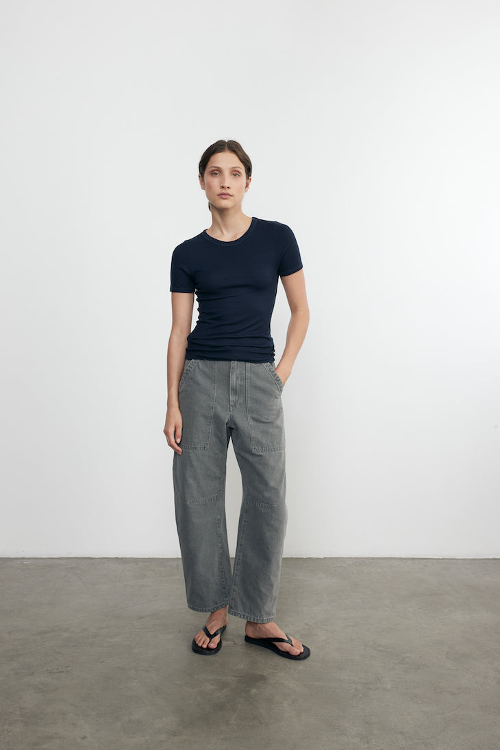 Our Silk Knit Essential Tee is cut from the brand's ultra-soft stretch silk rib material. This essential tee features a sheath neckline and a slim fit with a banded trim.