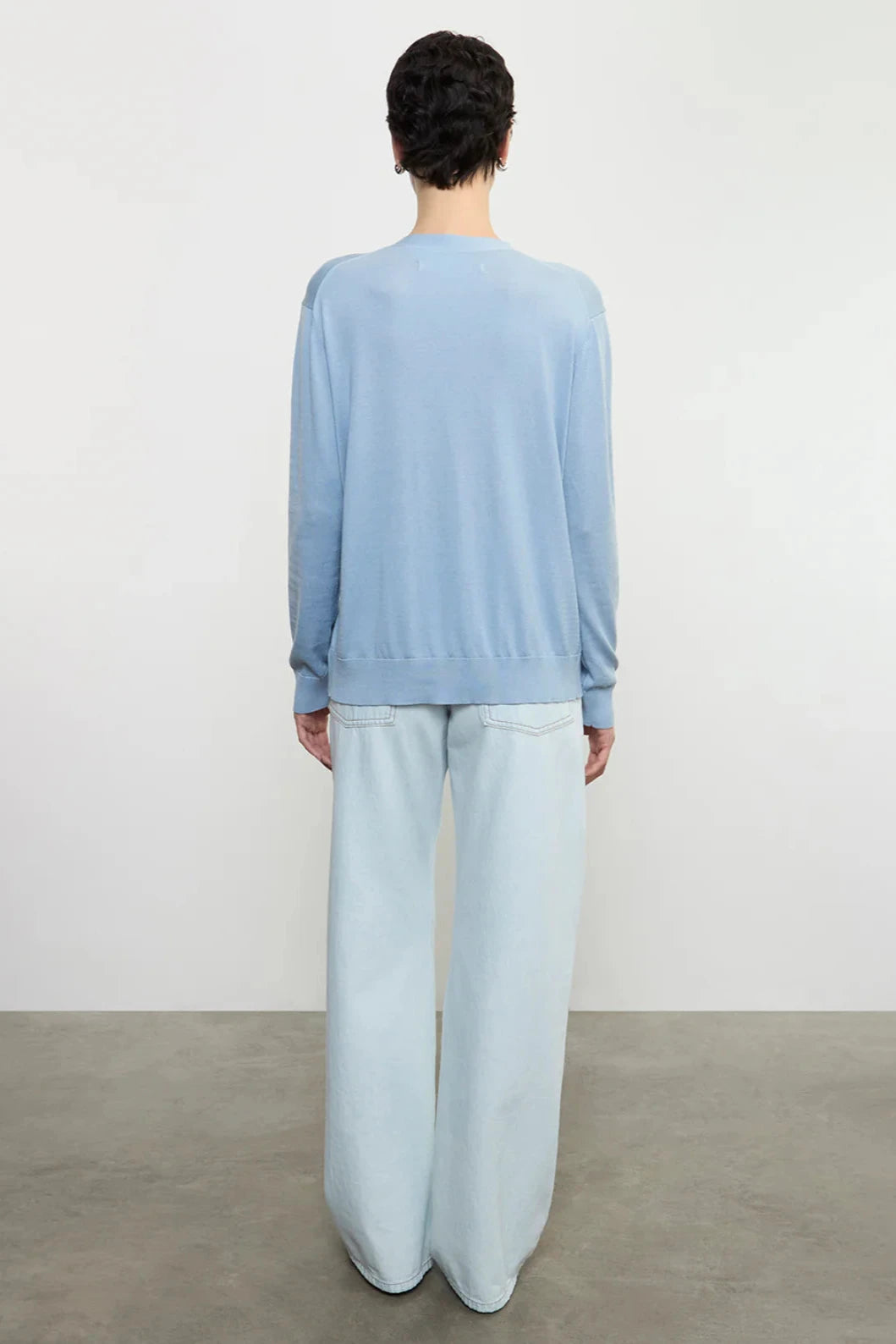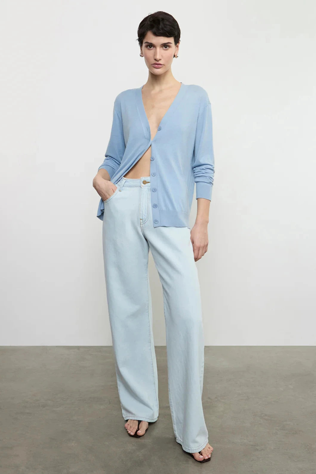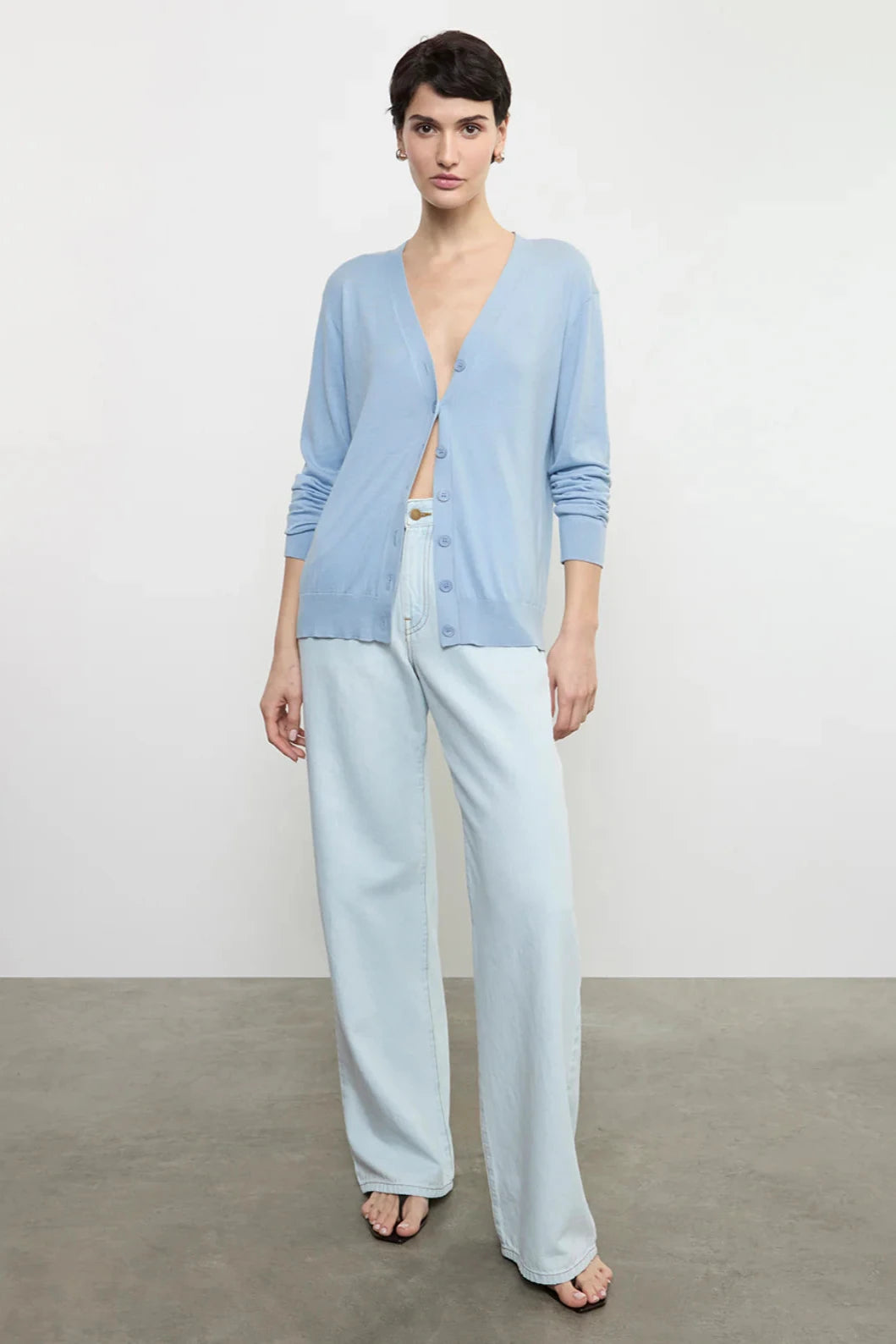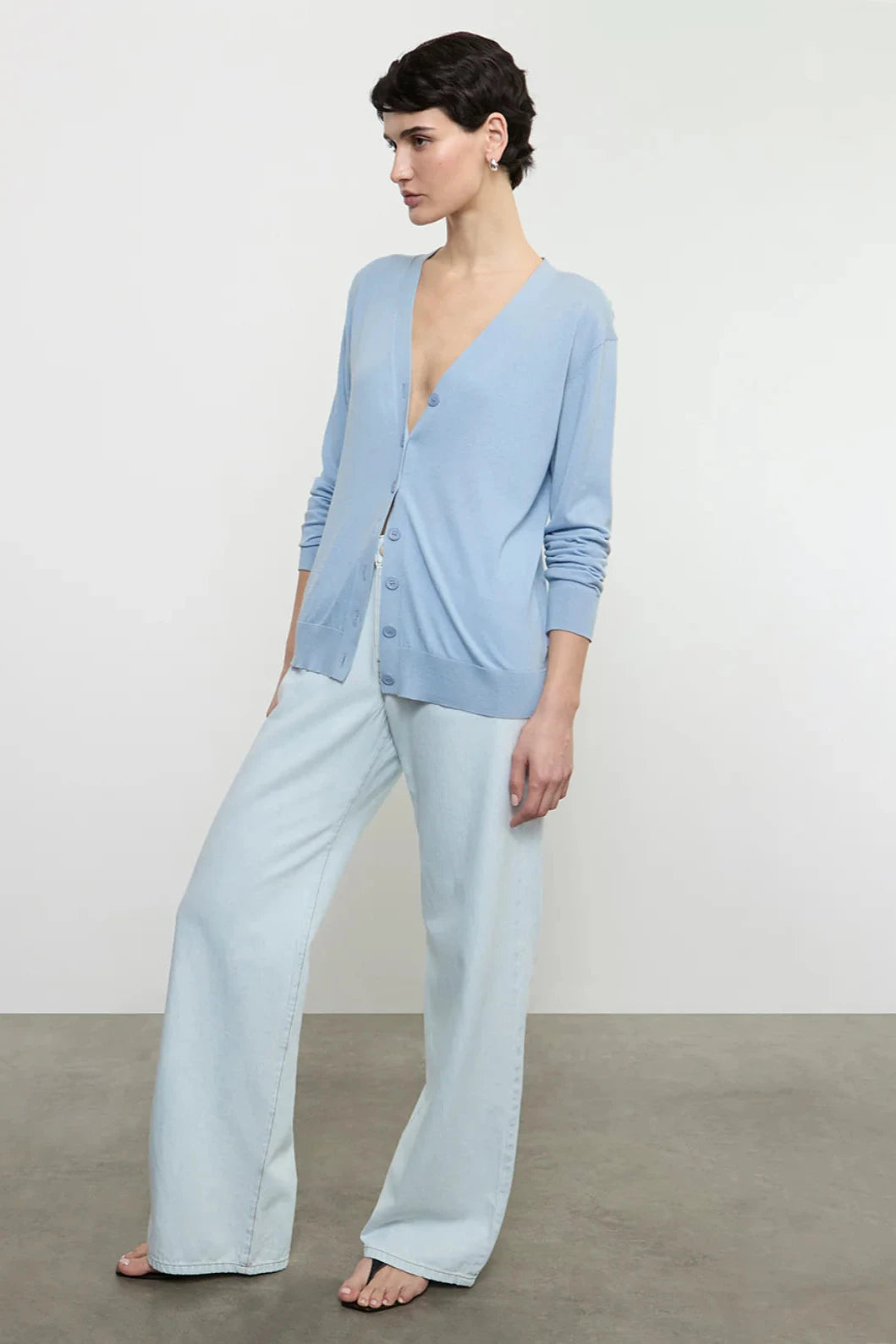 A fluid silk-cotton cardigan with a relaxed fit, shell buttons, and a wide ribbed hem.