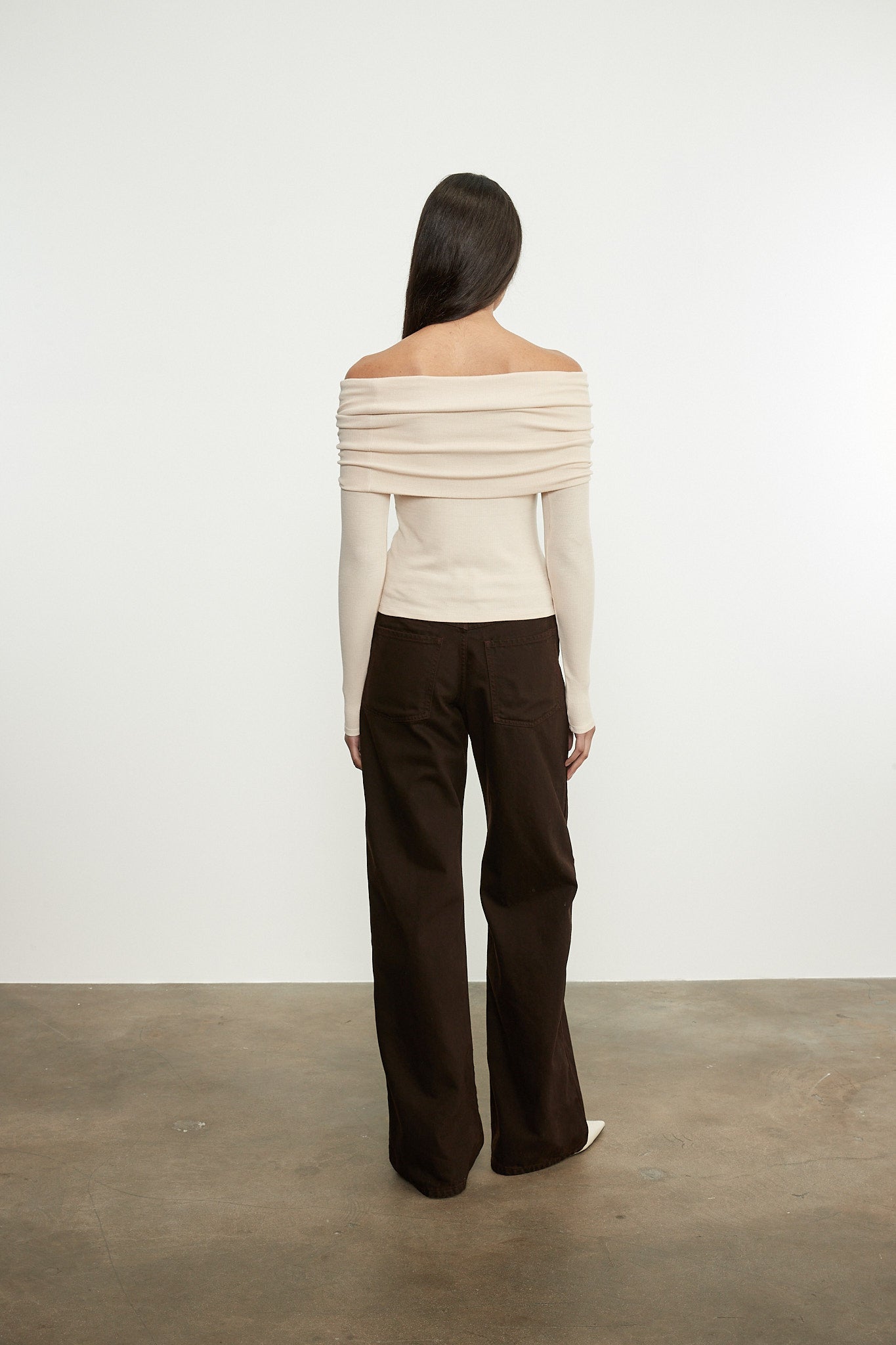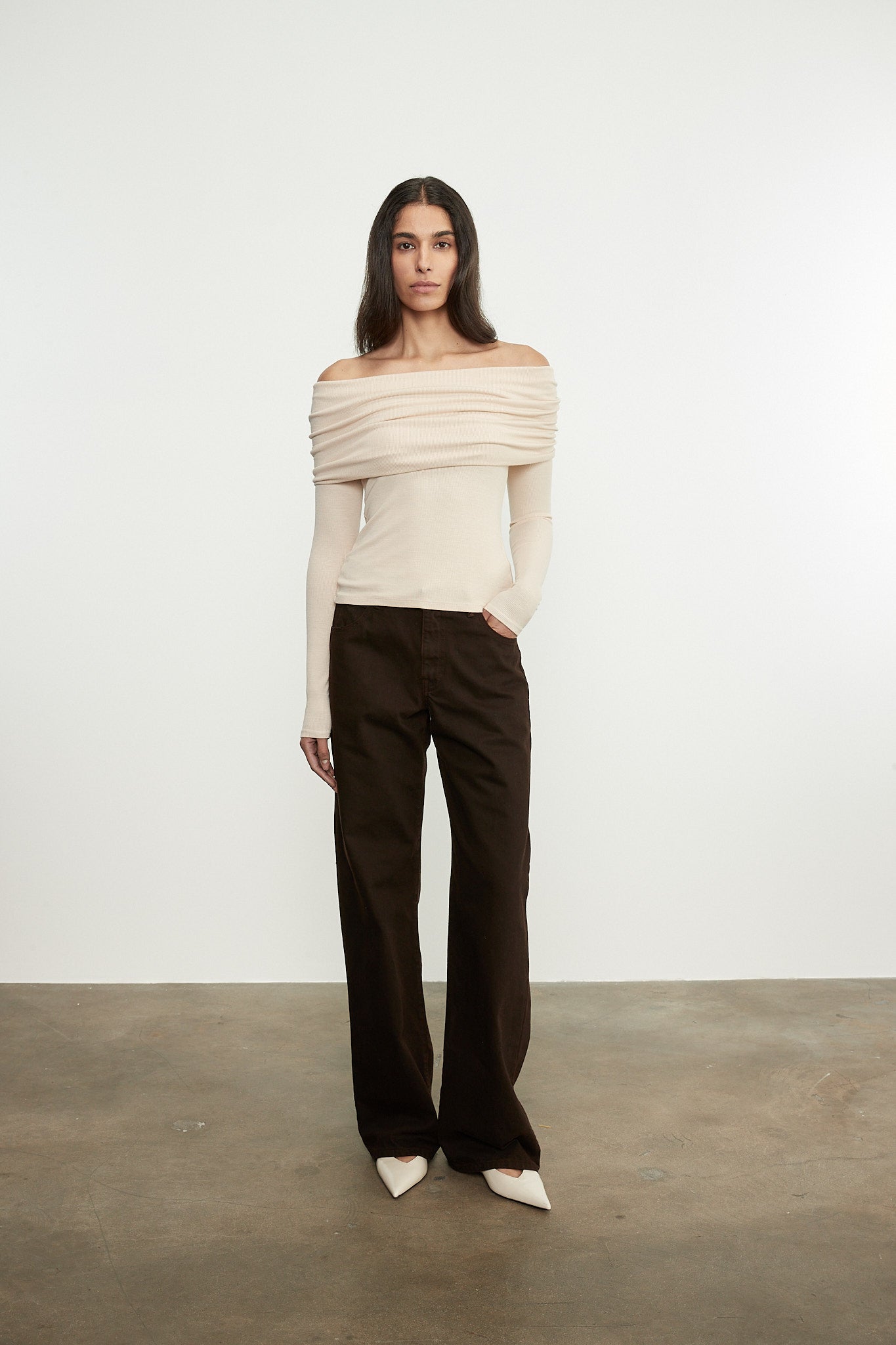 This silk knit top is crafted with the most touchable softness. It offers a body-skimming fit with flattering stretch, featuring off-shoulder neckline, thumbholes, and the brand's signature center back seam. Wear this versatile piece layered or on it's own.