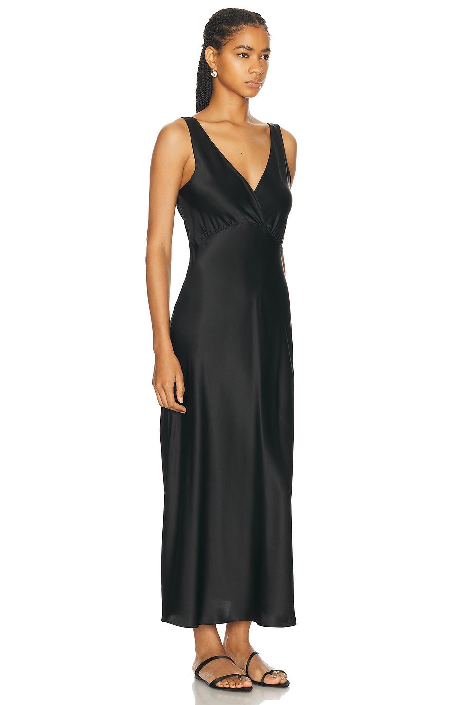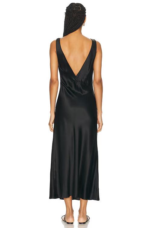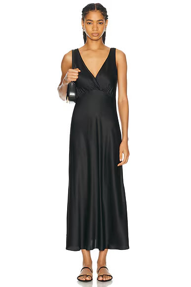 Crafted entirely from lustrous silk, this dress features a graceful fluidity, softly draping down to the ankle-skimming hem. It delicately gathers at the bodice, with a dramatic plunging V-neckline and empire seam.