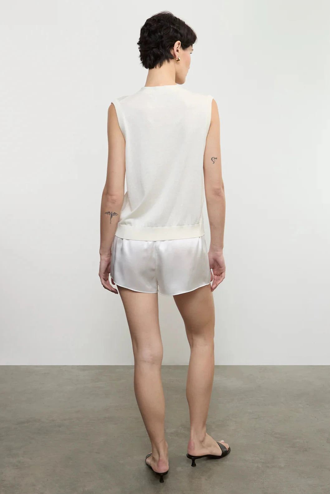 The Silk Slip Short is made from 100% silk. It features an elastic waistband and a relaxed, flirty fit.