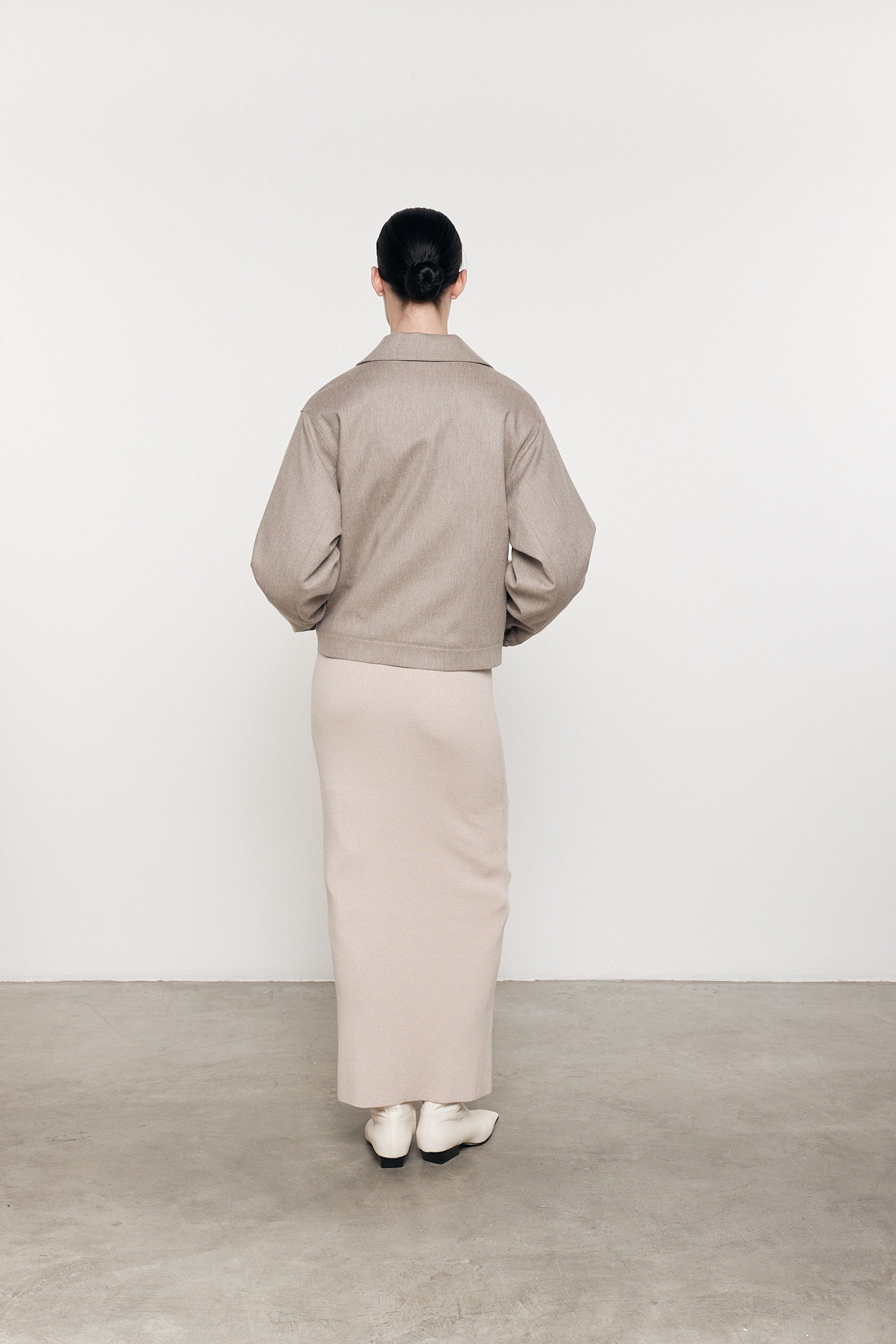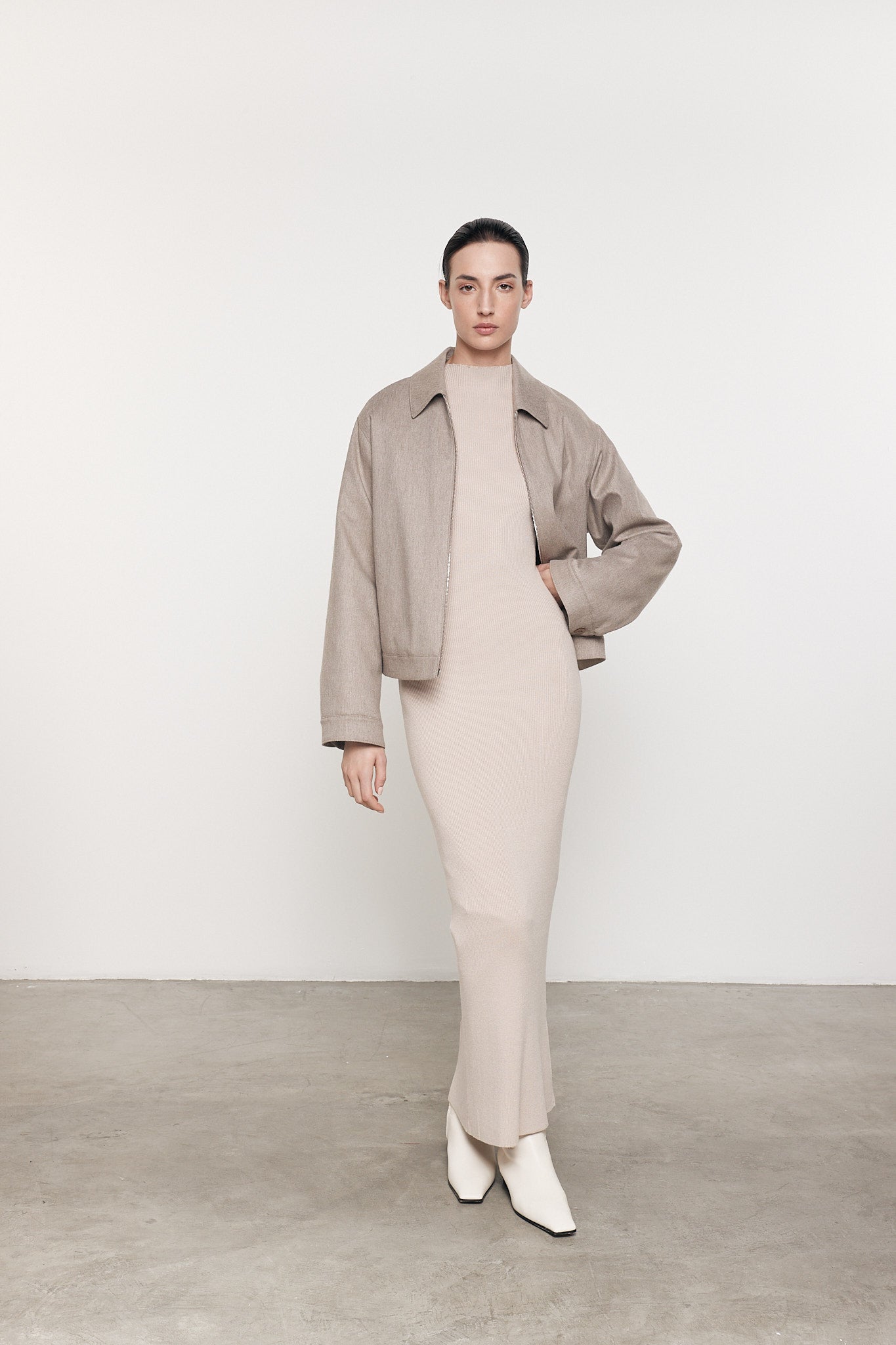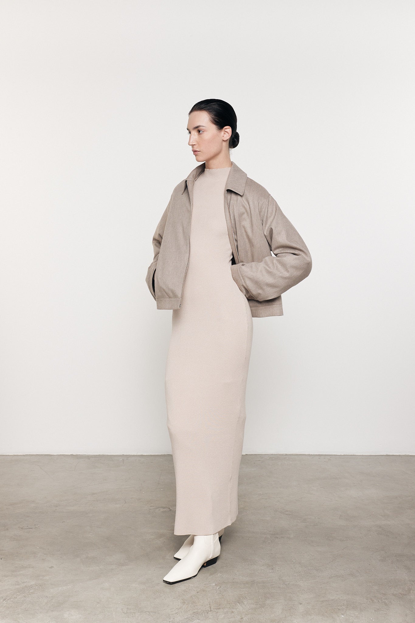 This silk sweater knit dress is crafted for a soft compressed feel, featuring a mockneck and ankle skimming length.