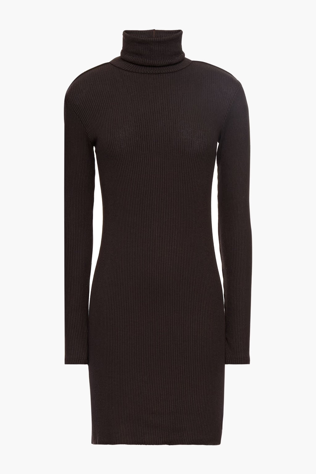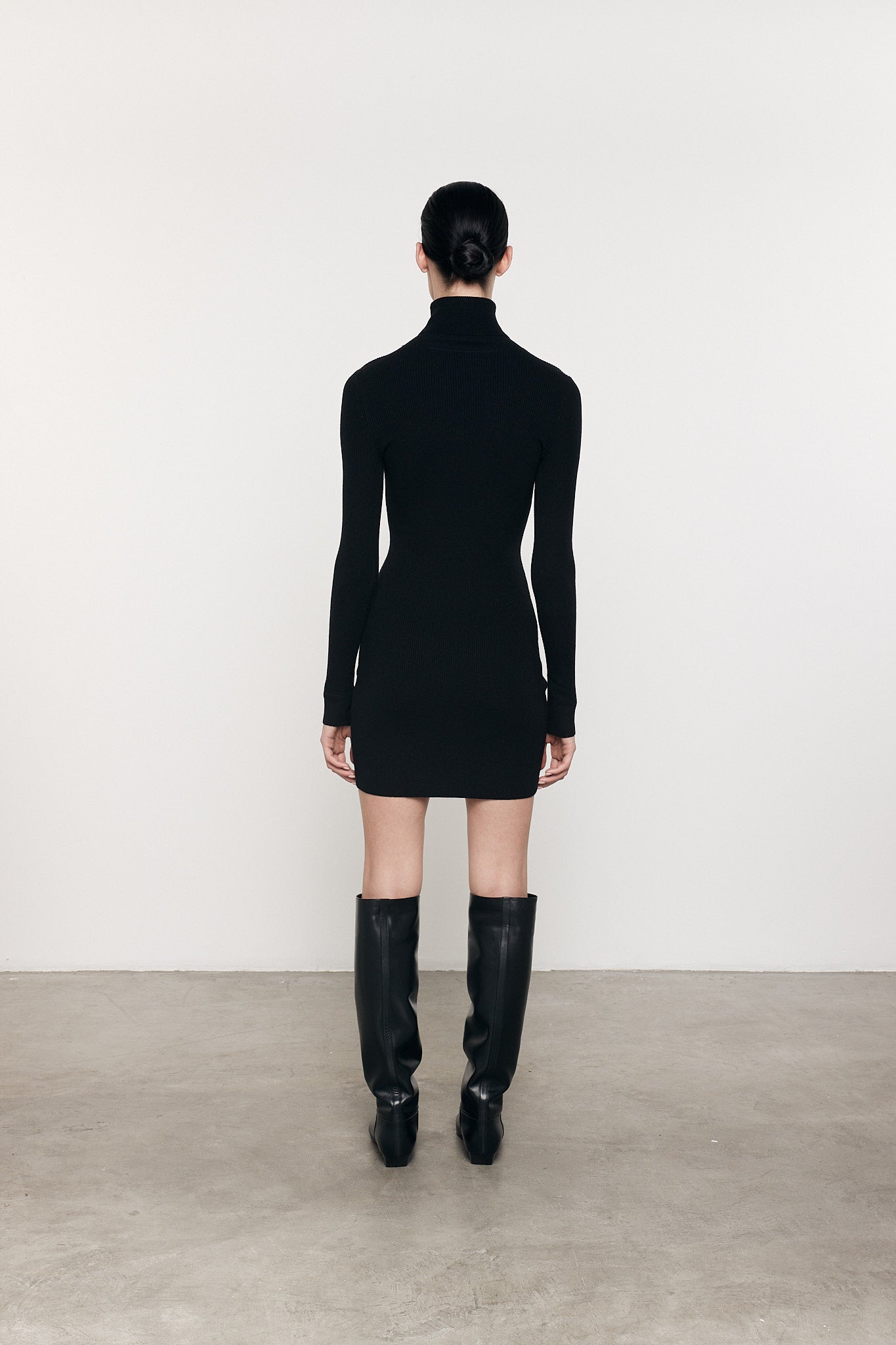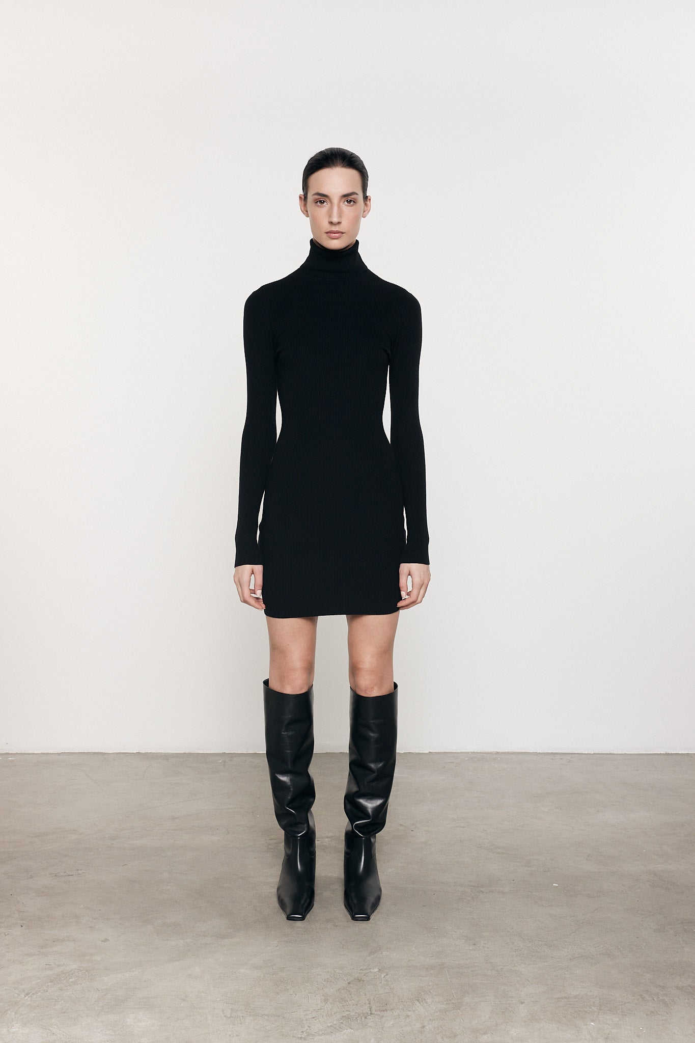 This silk sweater knit dress is crafted for a soft compressed feel, featuring a turtleneck and mini length.