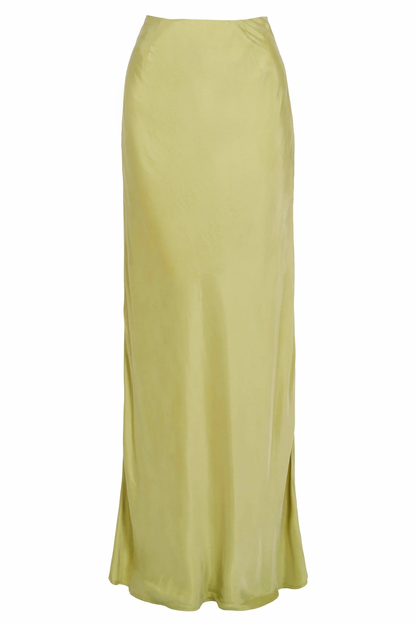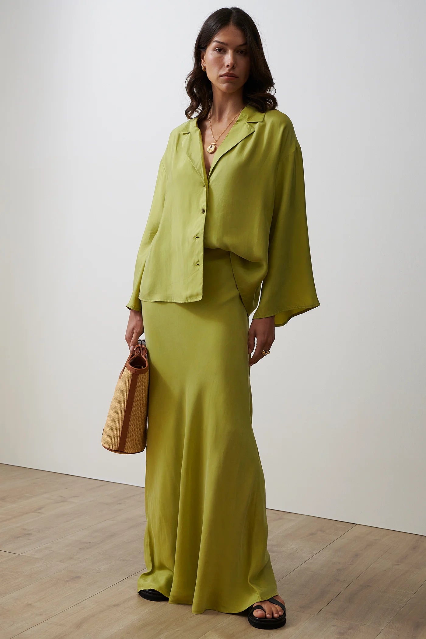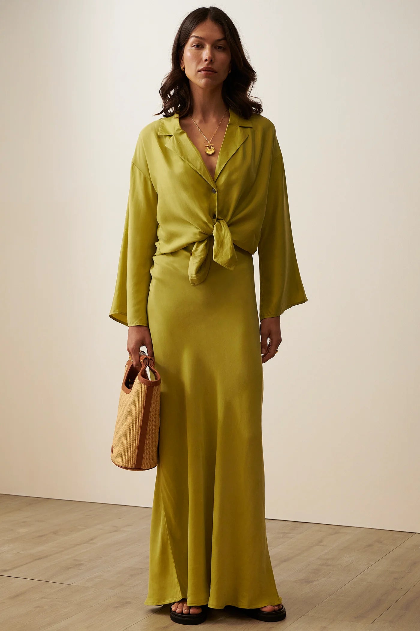 Sleek and flattering. The Deslia Skirt is a bias slip style skirt making the fit drape along your figure. The skirt features a fitted waist with a zipper at the back. For a trendy fit, pair yours with the Sola shirt in aloe and the Ottilie bag.