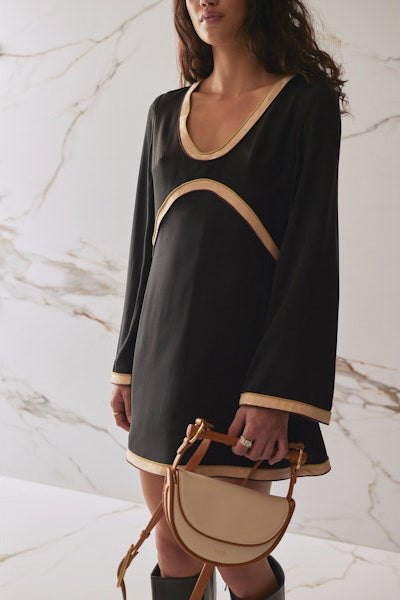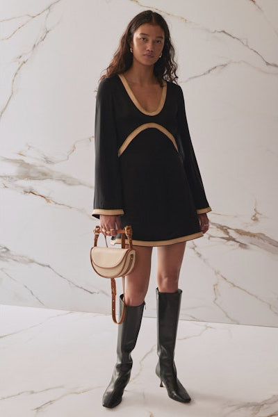 Designed with a unique vintage feel in mind, the Luella dress is the perfect long sleeve mini to add to your wardrobe. The dress has all the flattering shapes of its predecessor, featuring the signature contrast binding and elegant v-neckline. Perfect for a cocktail event or wear out to dinner with heels or knee-high boots to embrace a 60s retro look.