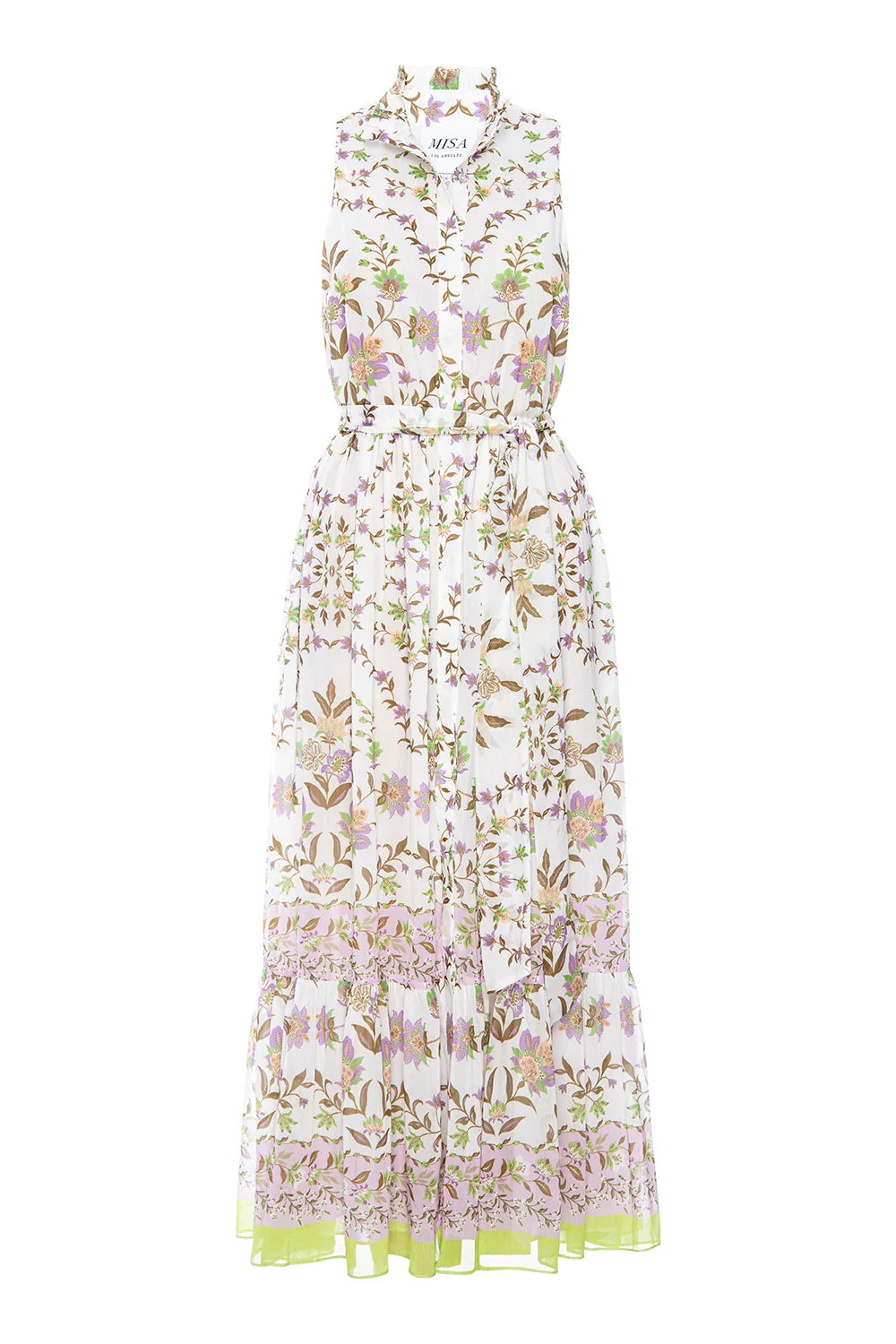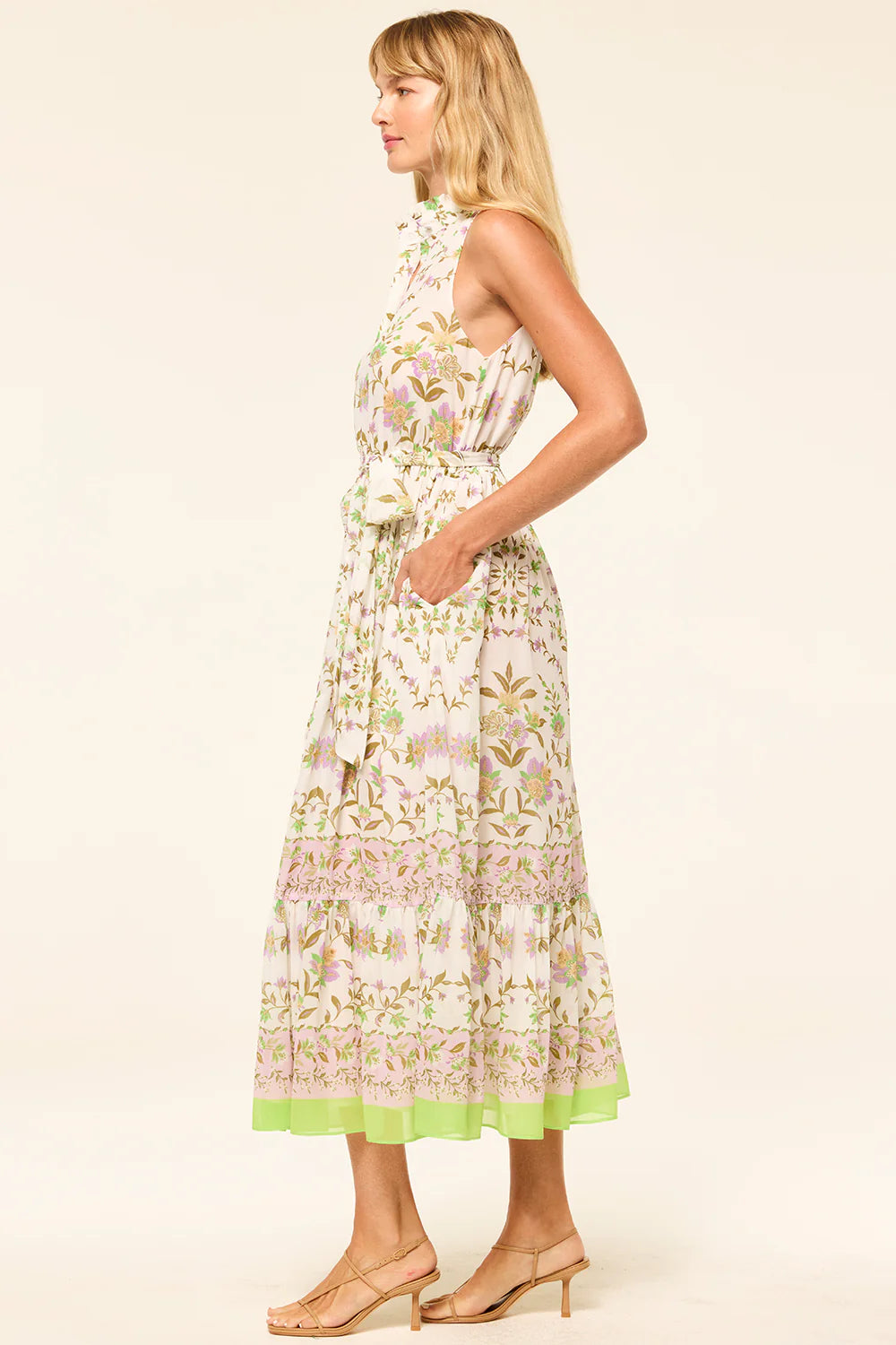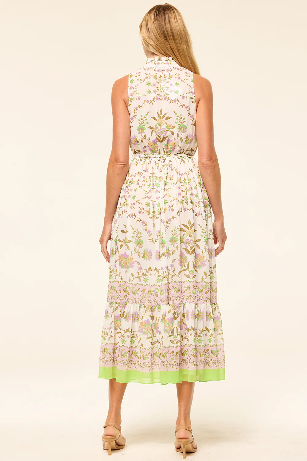 Thebez is an effortless spring midi dress cut from our lovely Secret Garden print chiffon. Sleeveless with a ruffle-trimmed stand collar and covered button front. Optional self-tie waist and double side-slit pockets. Self lined.