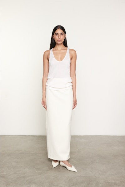 Discover the Tissue Cashmere Tank crafted from the lightest cashmere wool blend. This tank features a low scoop neckline and racerback detail. Pair with our Silk Full Length Skirt for a relaxed evening look.