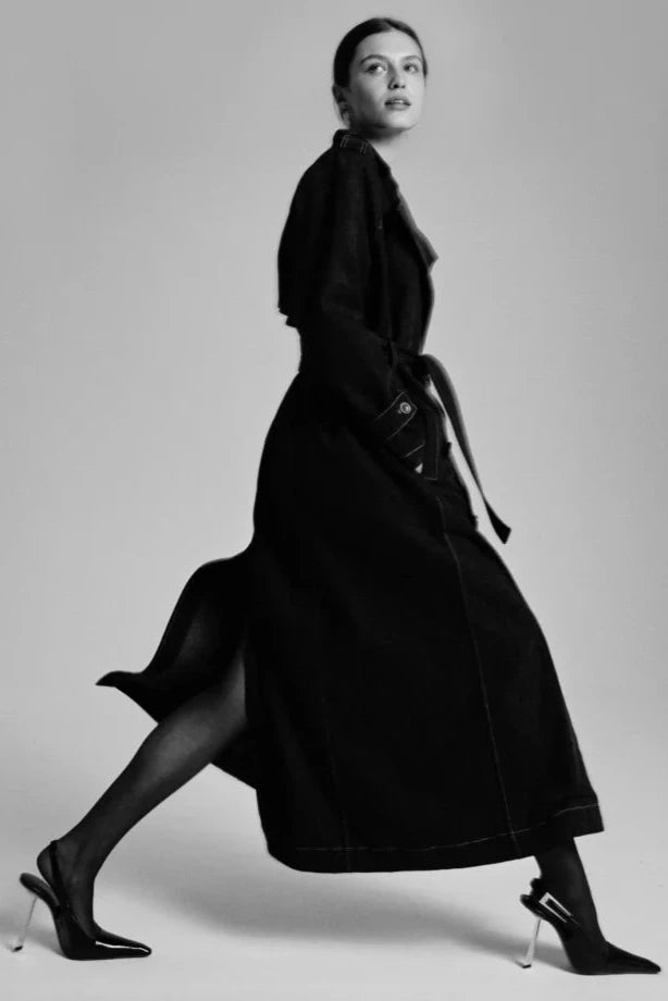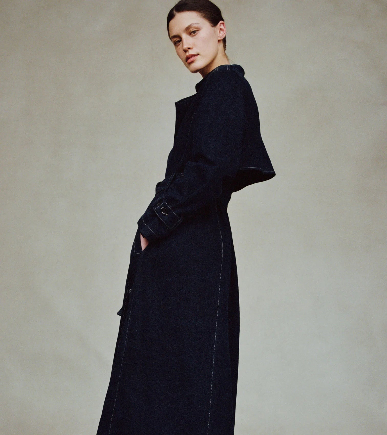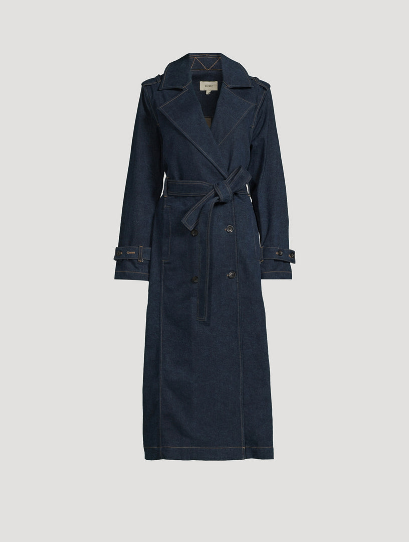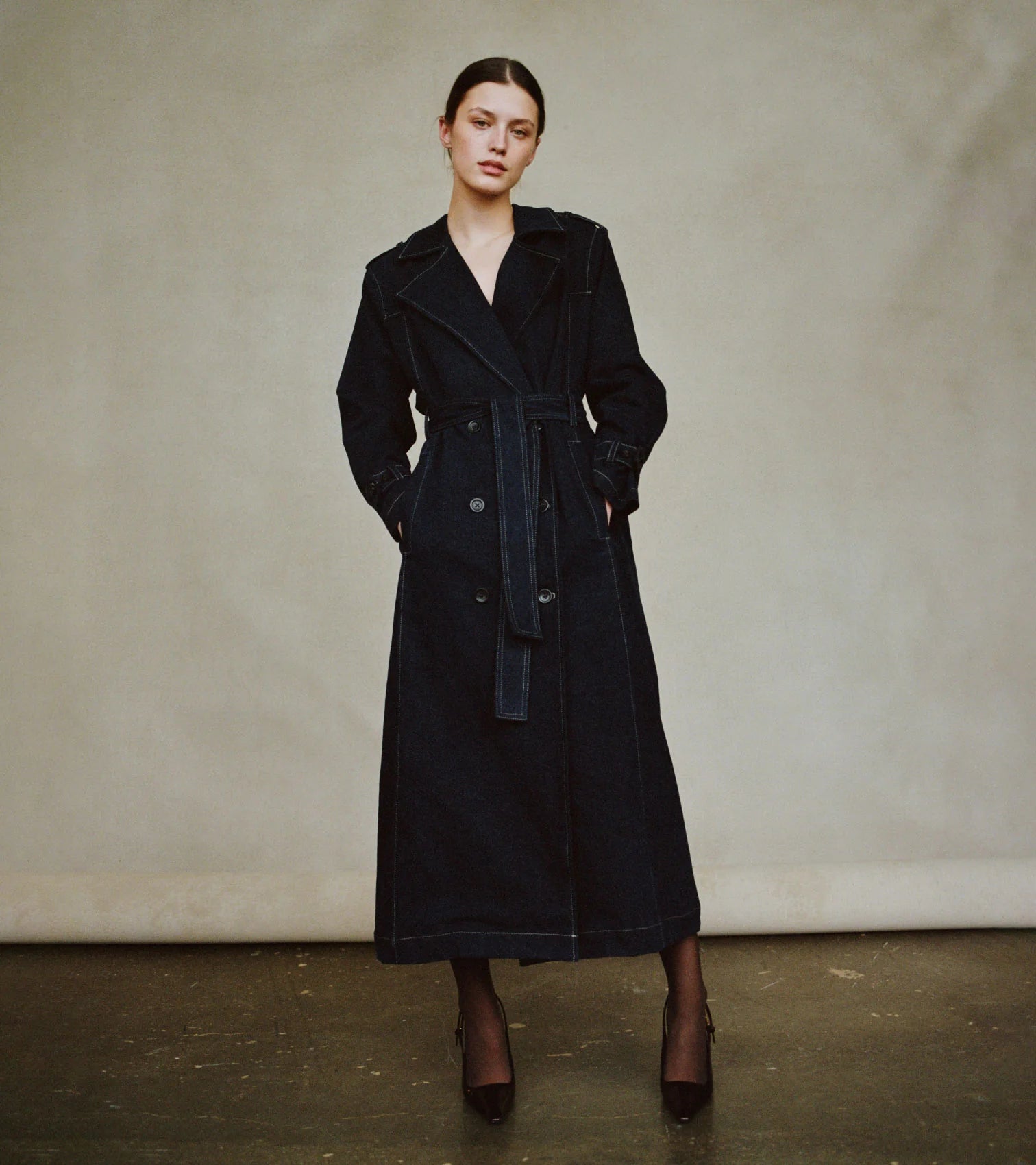 This trench is a classic, belted overcoat that is sure to become a closet staple. Made in stretch denim in a classic, deep indigo wash. It features buttons, a self belt, khaki stitching, and clean finishing.