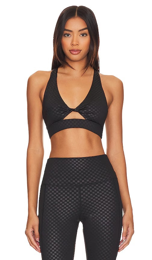 The Twist Top is our twisted racerback sport top that features a front twist with a cut-out above the band allowing your skin to peek through. This top has a sleek petite embossed checkered print in smooth black fabric that is lightweight and breathable with moisture-wicking properties. Pair with the matching Summer Legging and Reina Jacket for a sleek look this season.