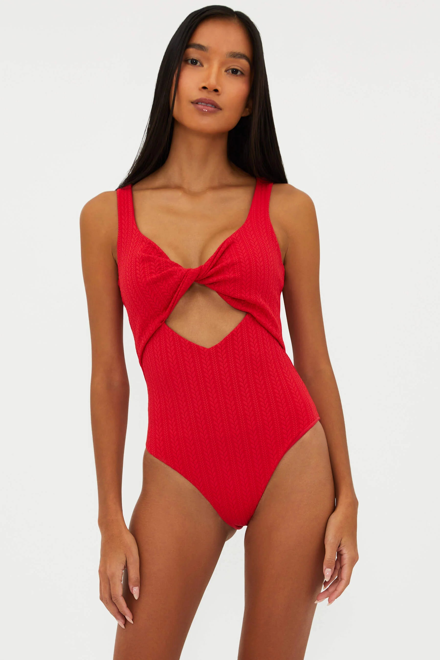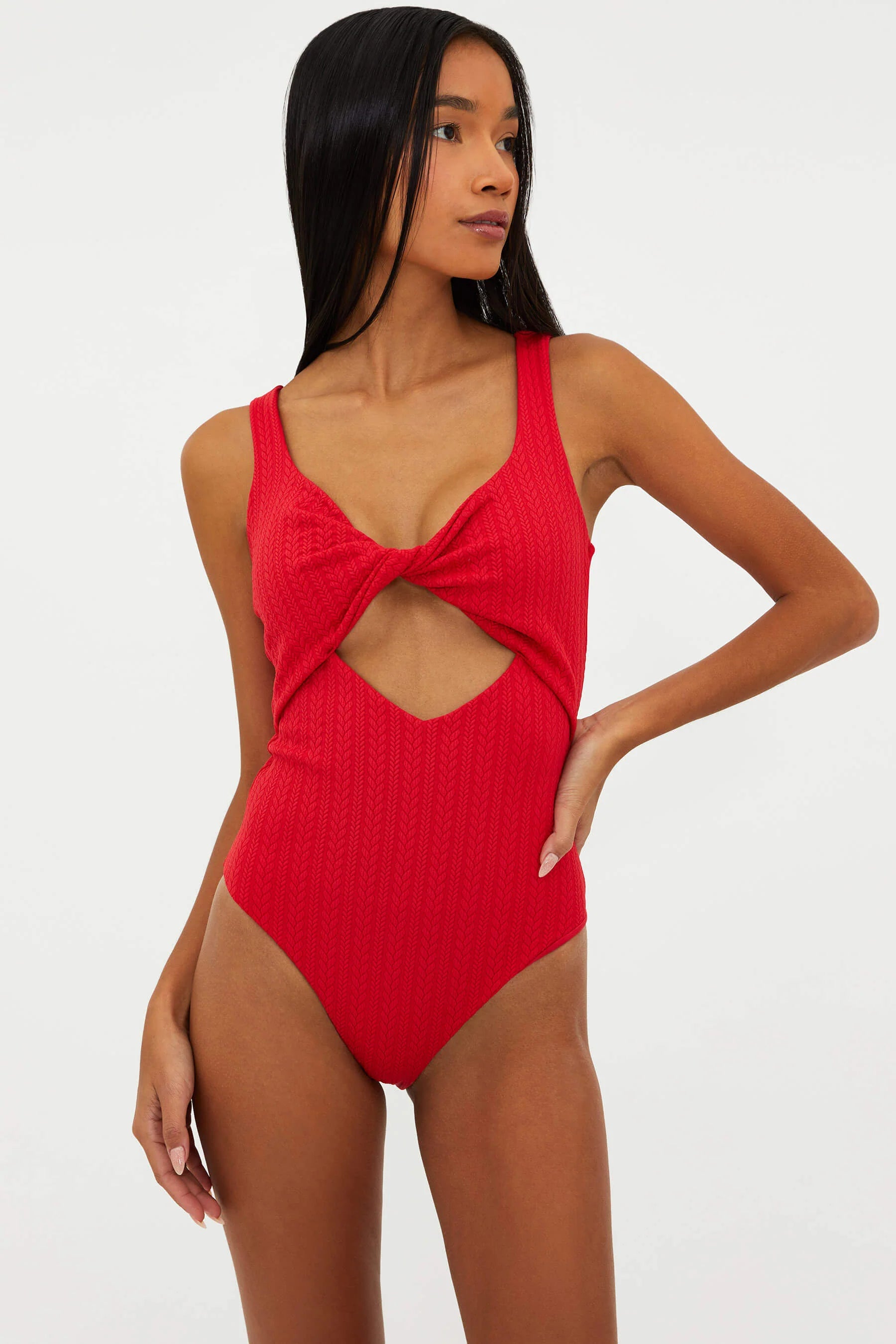 The Tyler One Piece is now featured in our best-selling cable fabric with mixed-size braid detailing that brings a subtle touch of texture. It has a front cutout and a twist at the bodice. This Merry red color is trending for this season.
