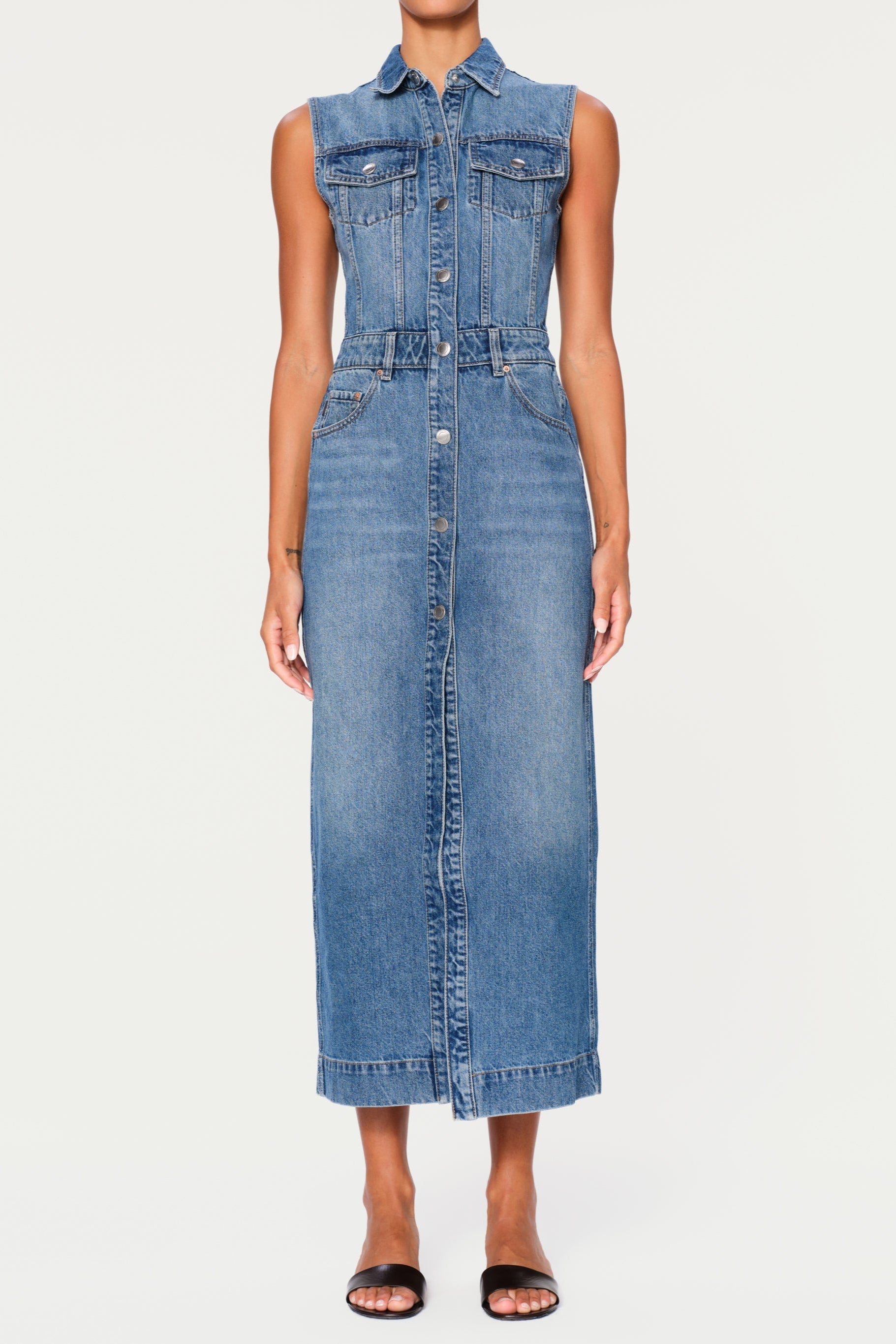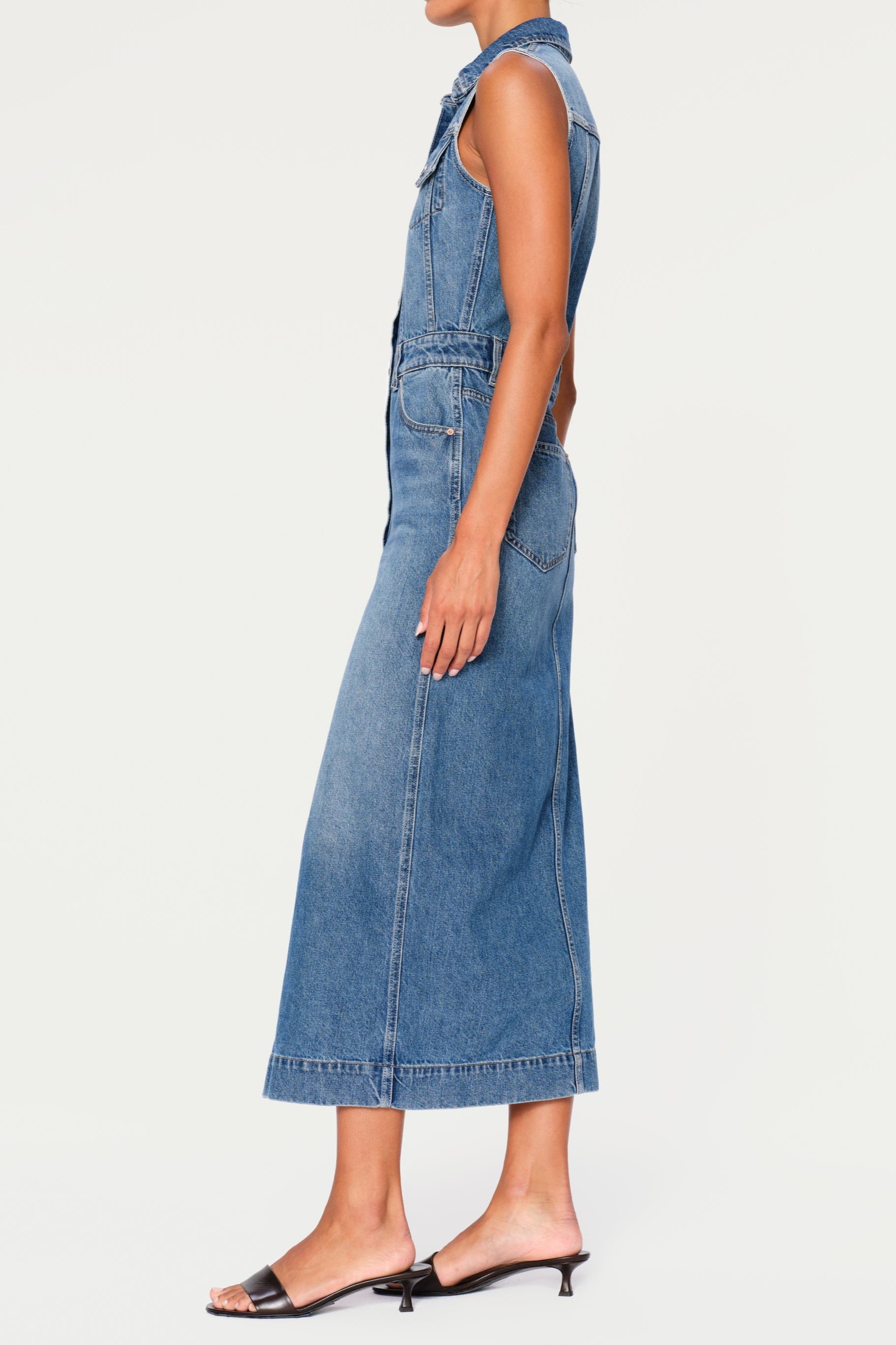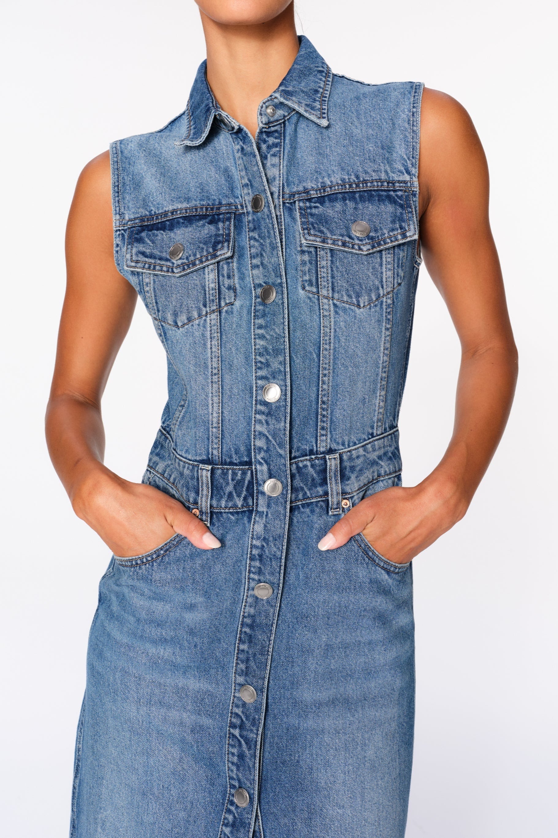 The Vest Dress is a maxi, timeless button up dress featuring front pocket detailing. Endless Sea is a vintage inspired mid wash with authentic character. It features silver hardware, multi-colored stitching and a clean hem.