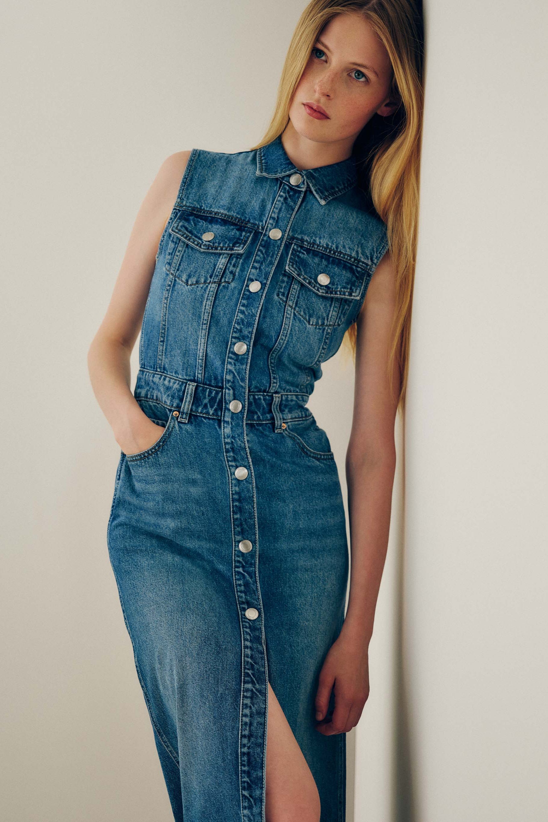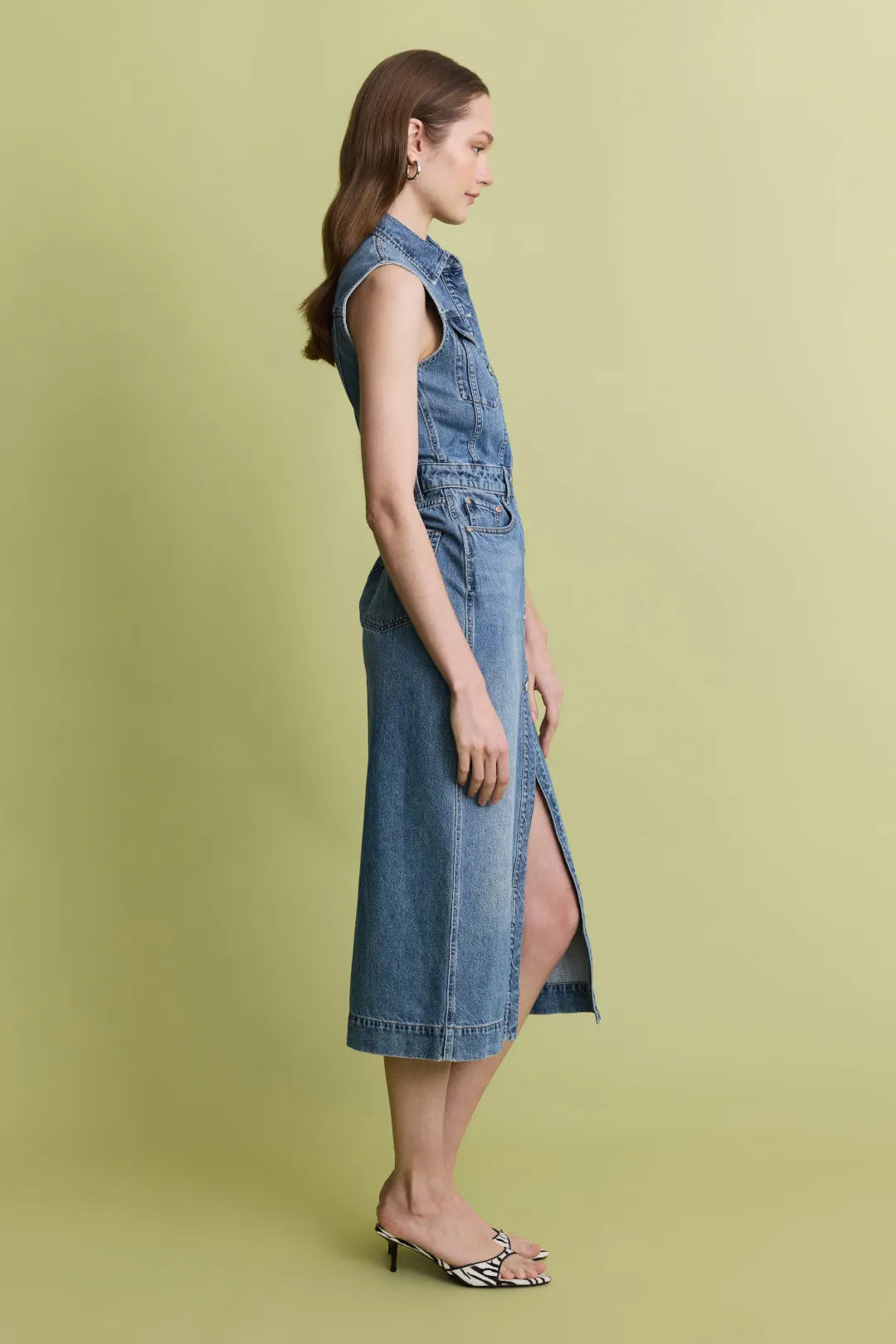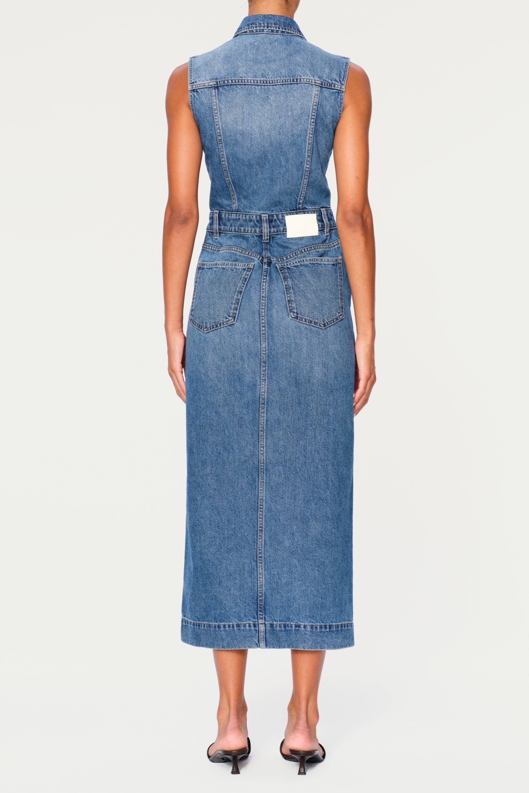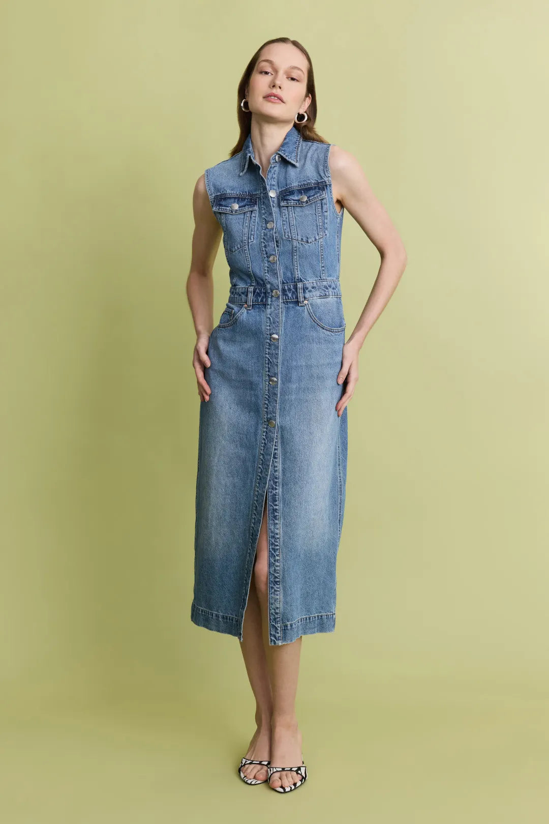 The Vest Dress is a maxi, timeless button up dress featuring front pocket detailing. Endless Sea is a vintage inspired mid wash with authentic character. It features silver hardware, multi-colored stitching and a clean hem.