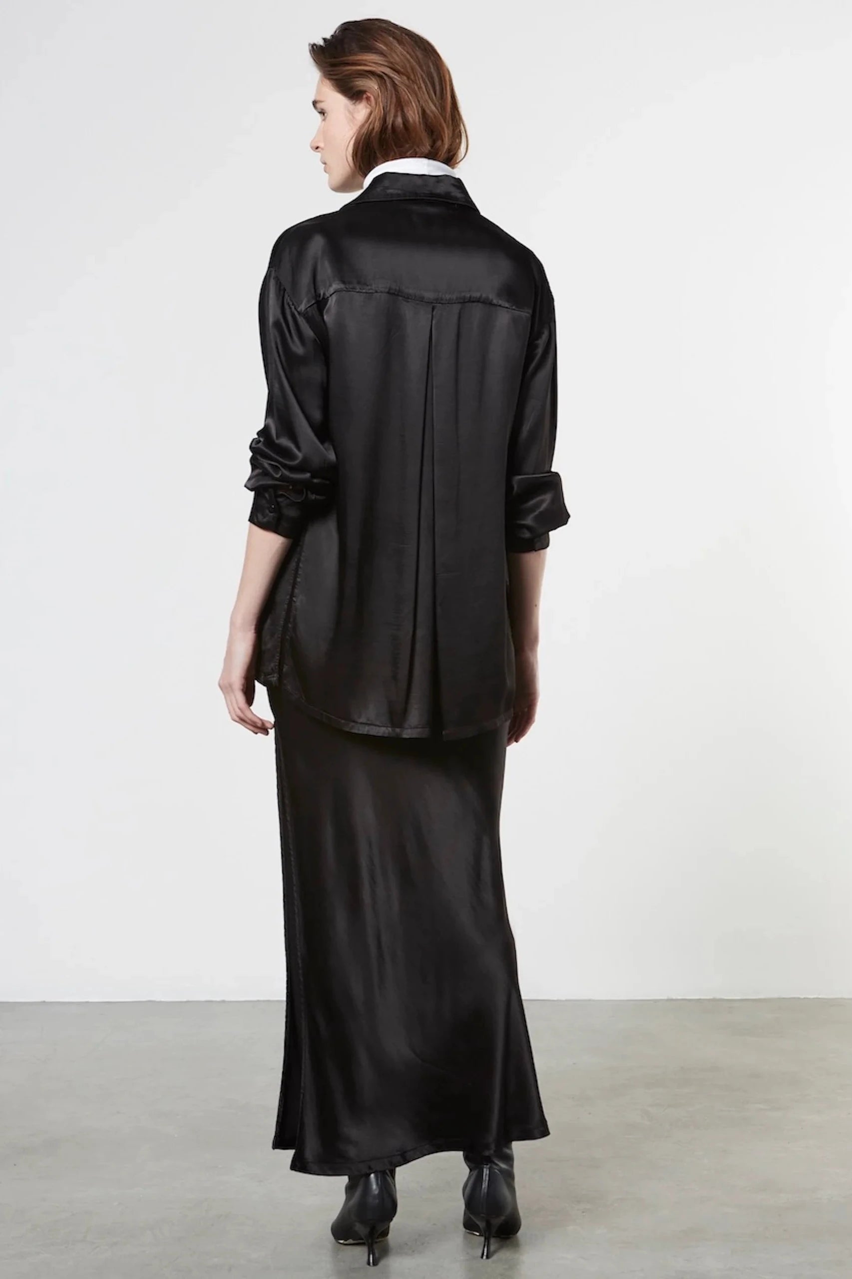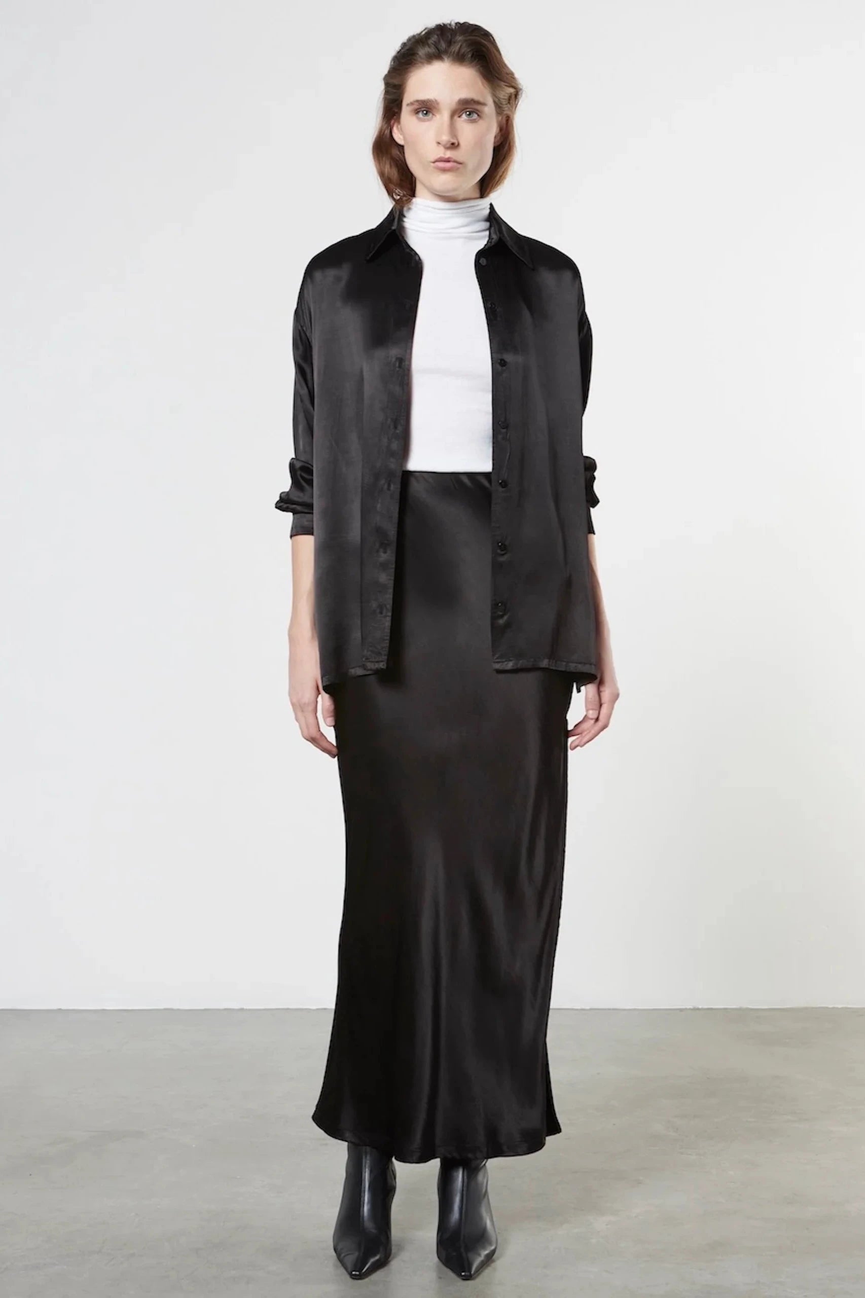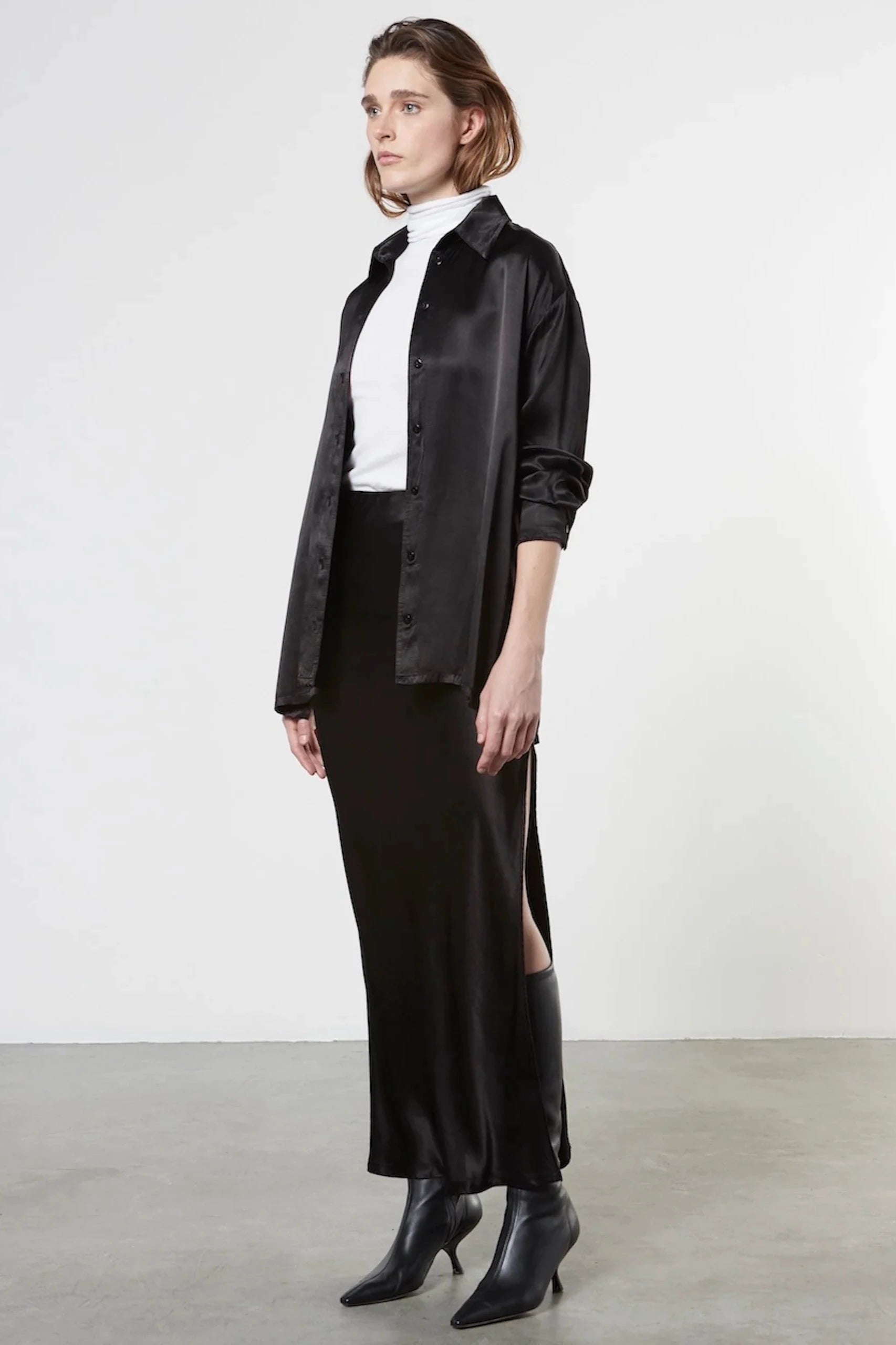 A bias maxi skirt in rayon satin with an elastic waist featuring a side slit detail. Pair with any of our tanks for a relaxed daytime look or dress it up with our satin shirt.