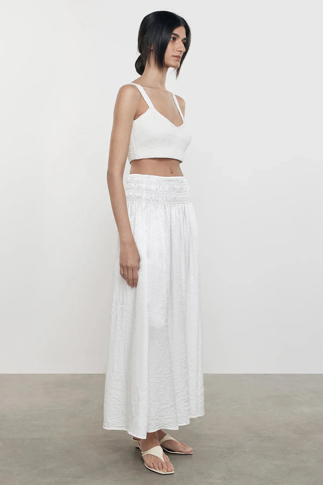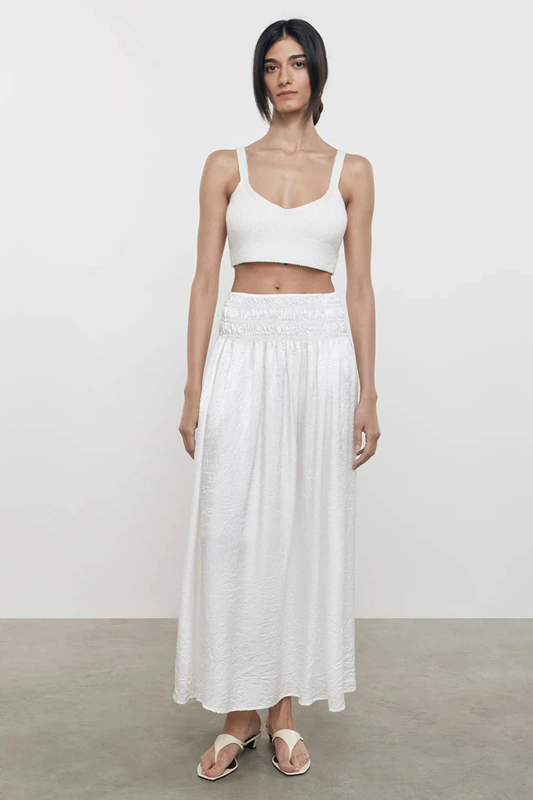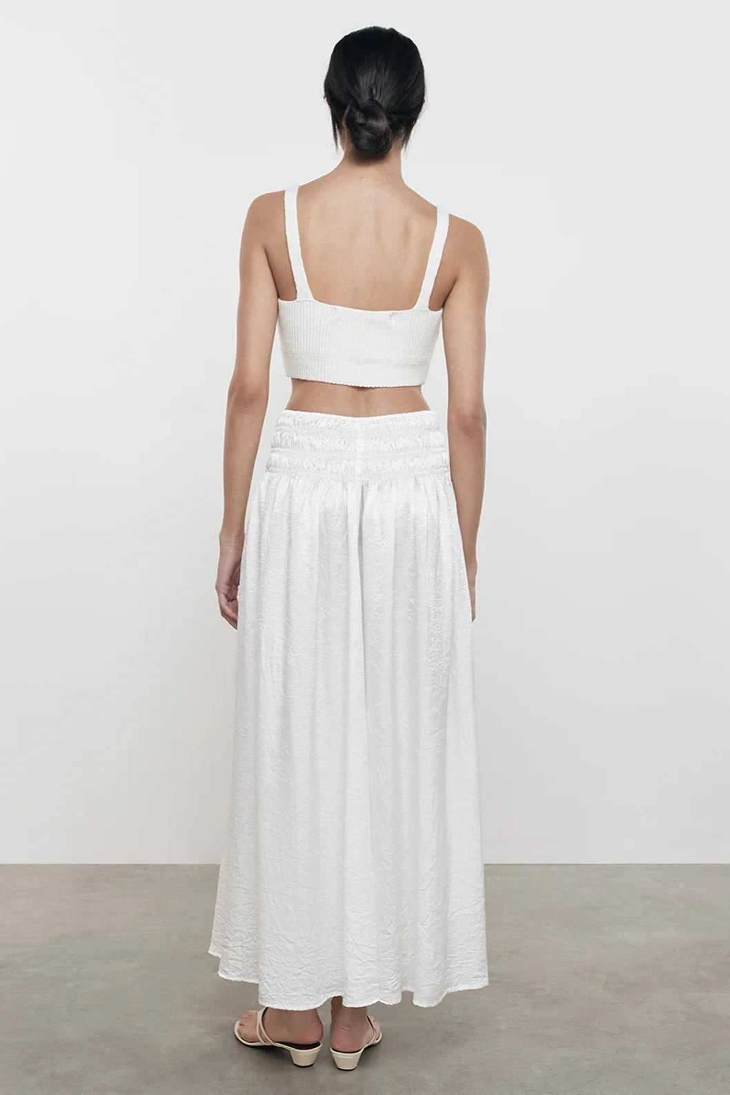 Introducing our Linen Knit Bralette, meticulously crafted from 100% breathable linen. This piece features a compact knit design, scooped neckline, and cropped length, ensuring the ultimate support and comfort. Pair it effortlessly with our Textured Satin Smocked Skirt or Resort Pants for a coordinated look.