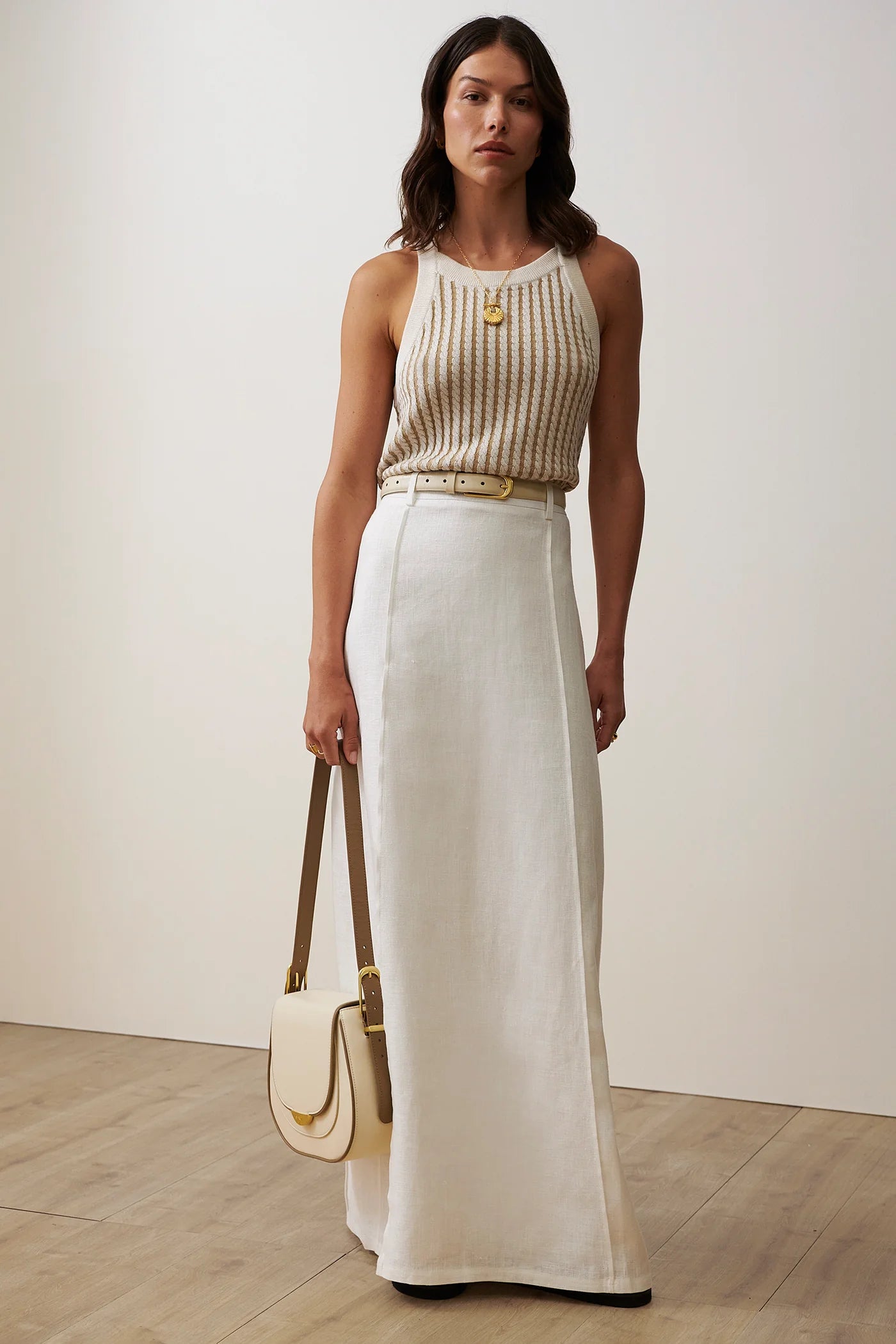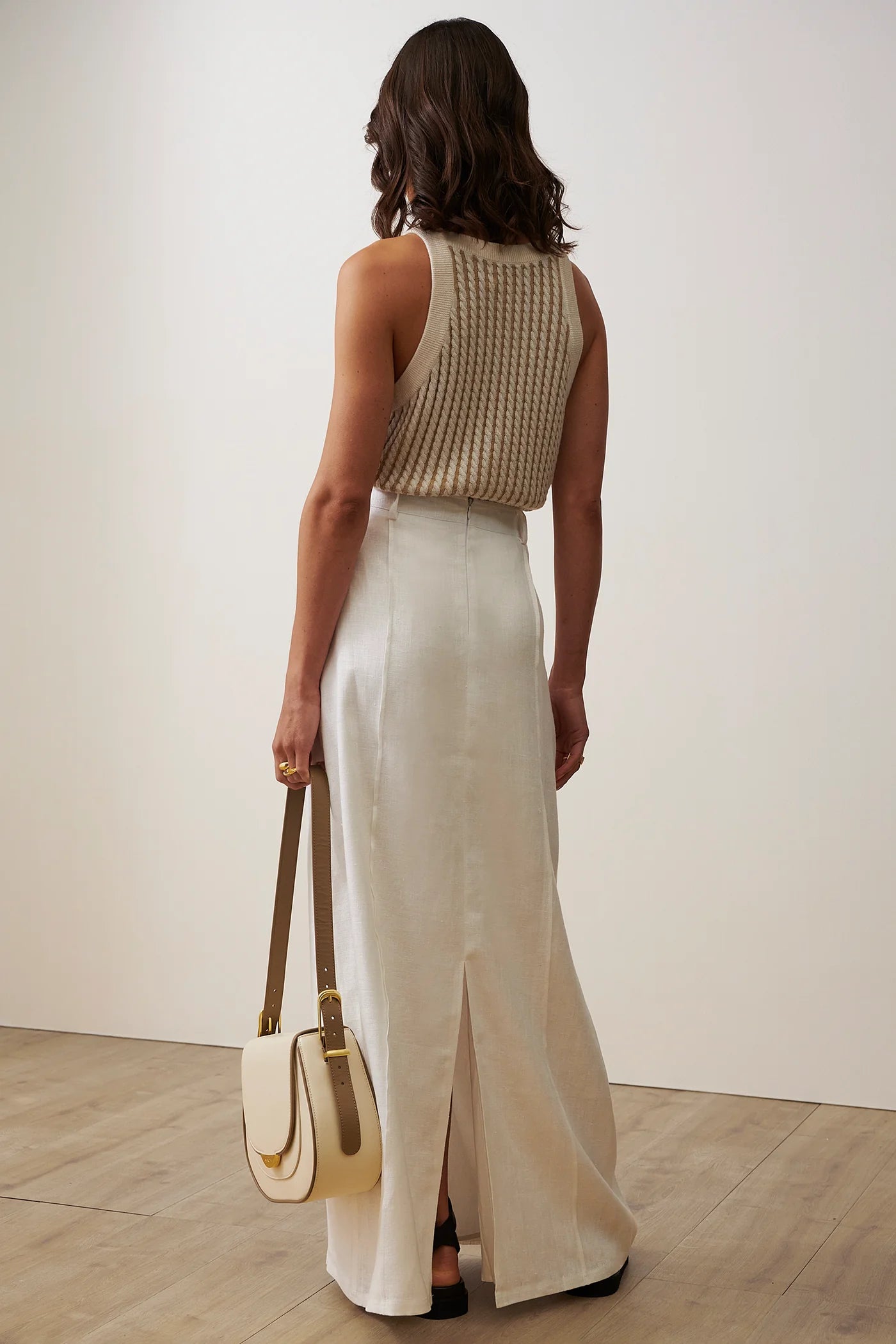 The Fallon Skirt gives minimal and sophistication with a tailored fit around the waist and A-line silhouette. Featuring a piped finish to the waistband and a back slit of ease of movement. Pair with a summery top for warmer weather or a knit sweater tucked in for the cooler months.