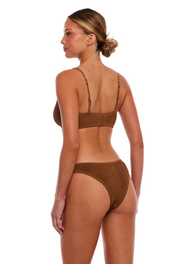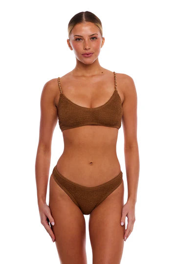 Elevate your swimwear collection with the Bondi Gold Chain Bralette Bikini Top—a statement piece that seamlessly blends luxury, style, and comfort.
