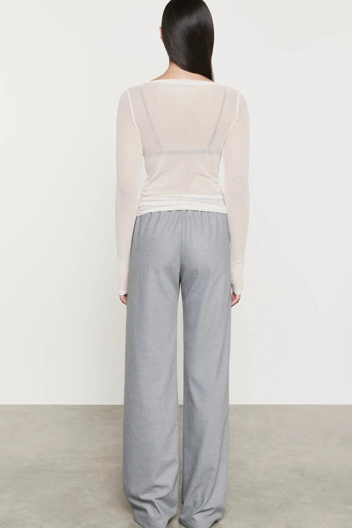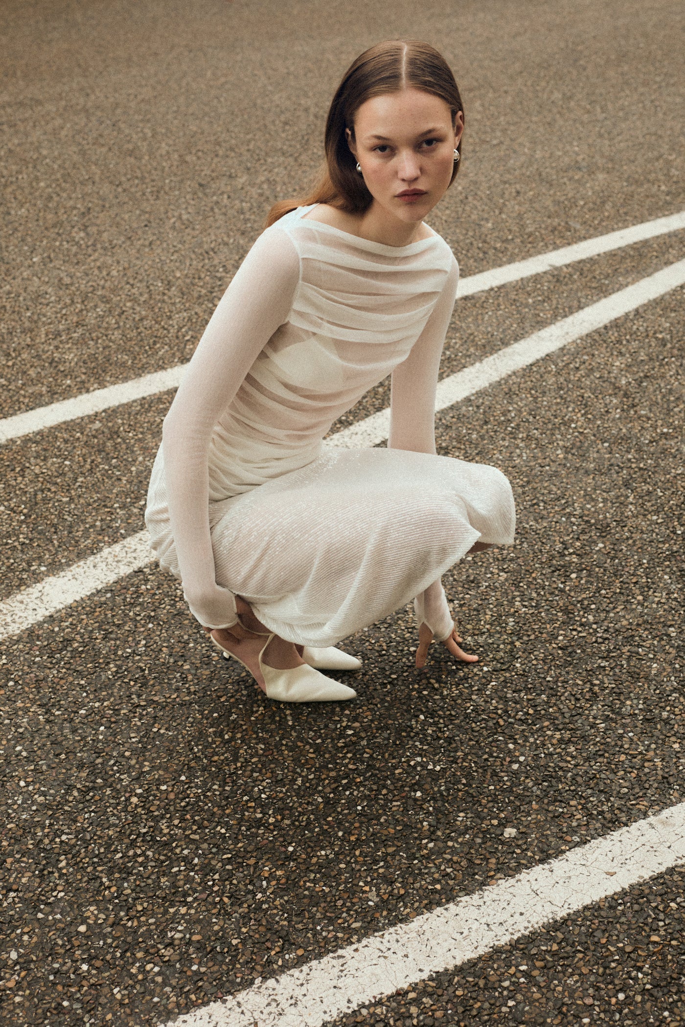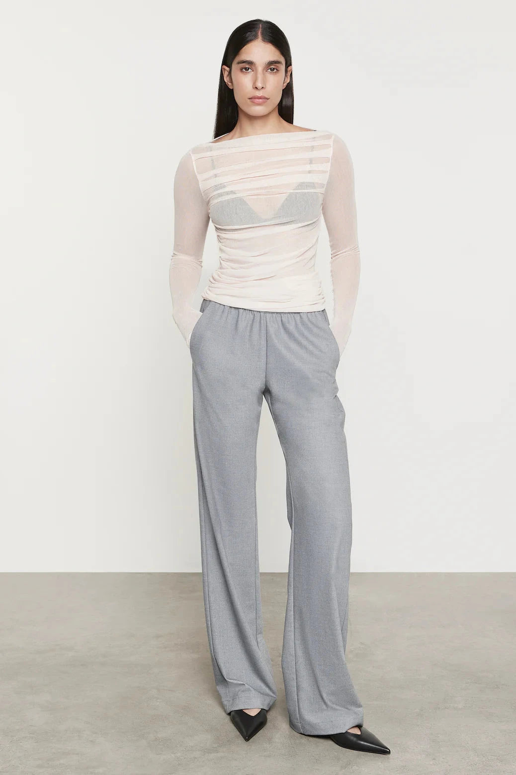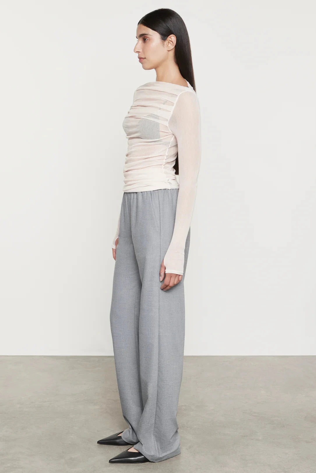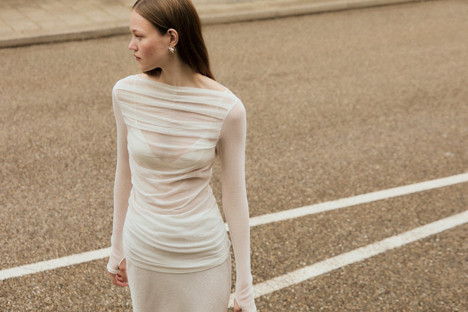 This semi-sheer top is cut from a delicate cotton mesh and features a draped boatneck and ruching detail along the bodice.