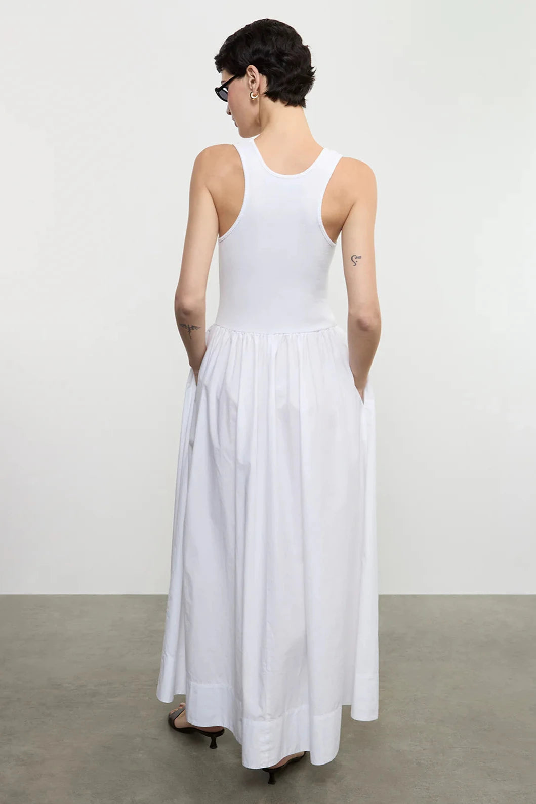 The Cotton Resort Tank Dress pairs a finely ribbed tank silhouette with a lightweight, structured cotton skirt. Includes side pockets.