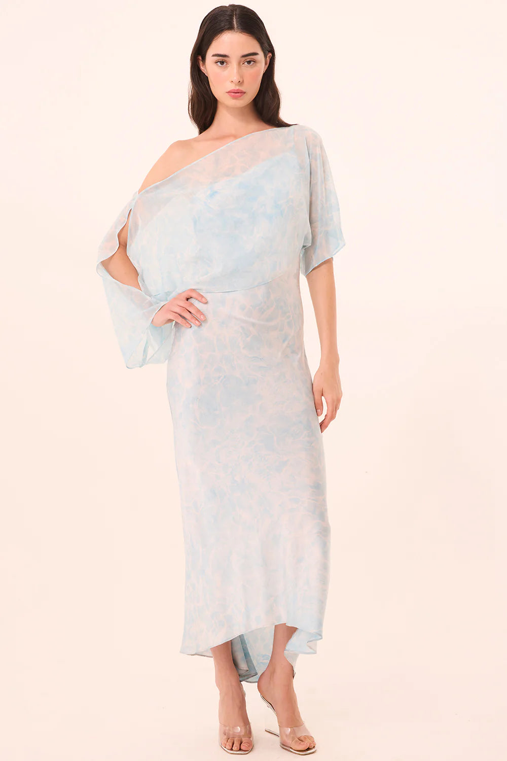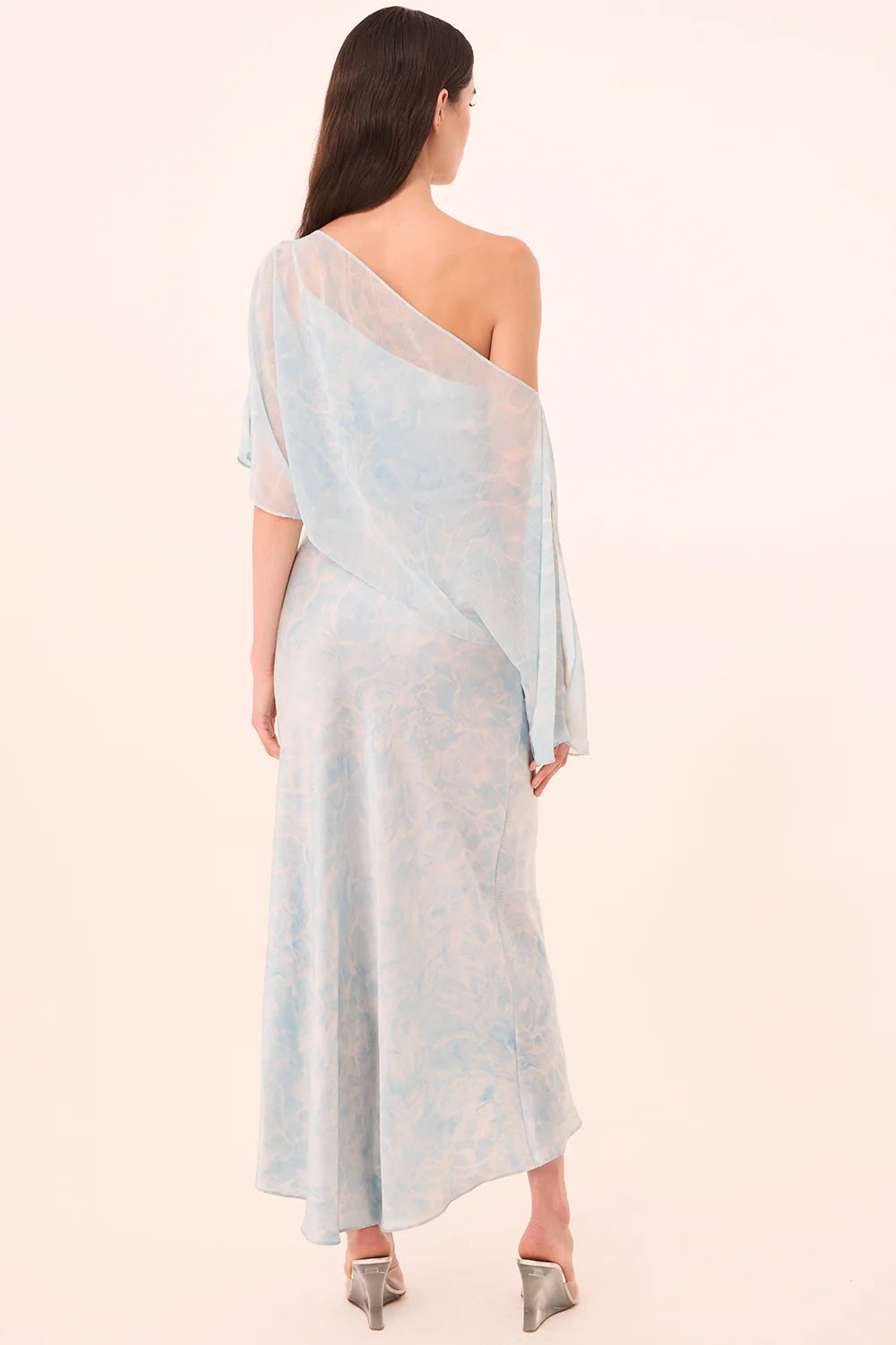 The Dalena dress is a sleek, figure-skimming maxi cut on the bias from our Acqua Blue–printed satin. This one-shoulder silhouette features a hidden side zip closure and an asymmetrical hem for added movement. For a dramatic styling option, it includes a detachable chiffon cape with an arm slit in the same print, designed to drape diagonally across the dress. A versatile piece that can be styled for everything from special occasions to elevated everyday moments.