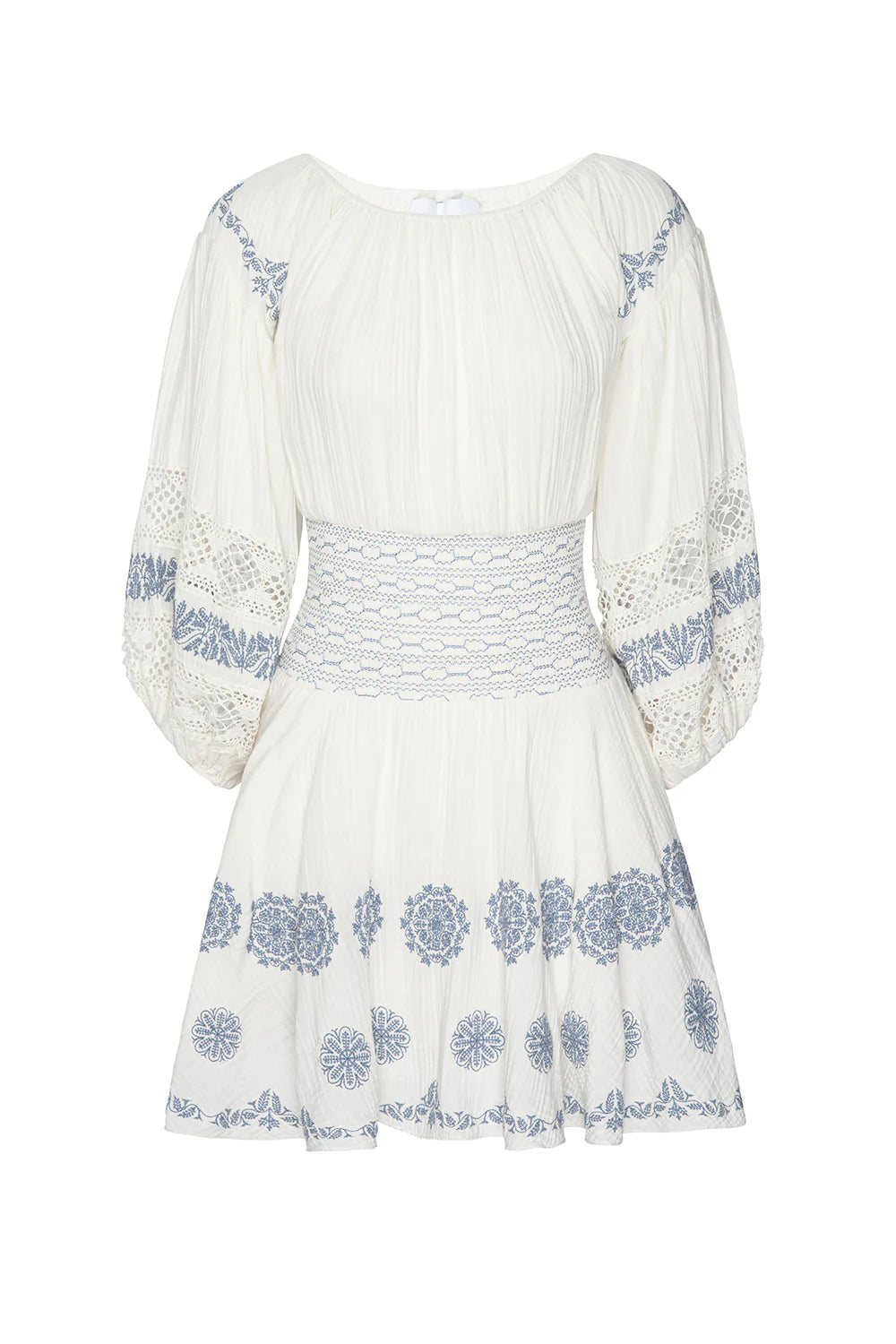 Daliya is an effortless getaway-ready mini dress to carry you into the warmer seasons. This off-the-shoulder style is cut from a breezy cotton gauze and features long voluminous sleeves with elastic cuffs trimmed in tonal lace with blue embroidered details. The blouson top is accentuated with a wide smocked embroidered waistline and leads into a flowing skirt with embroidered blue medallions. Fully lined. This pack-and-go style is a timeless addition to your warm-weather wardrobe.