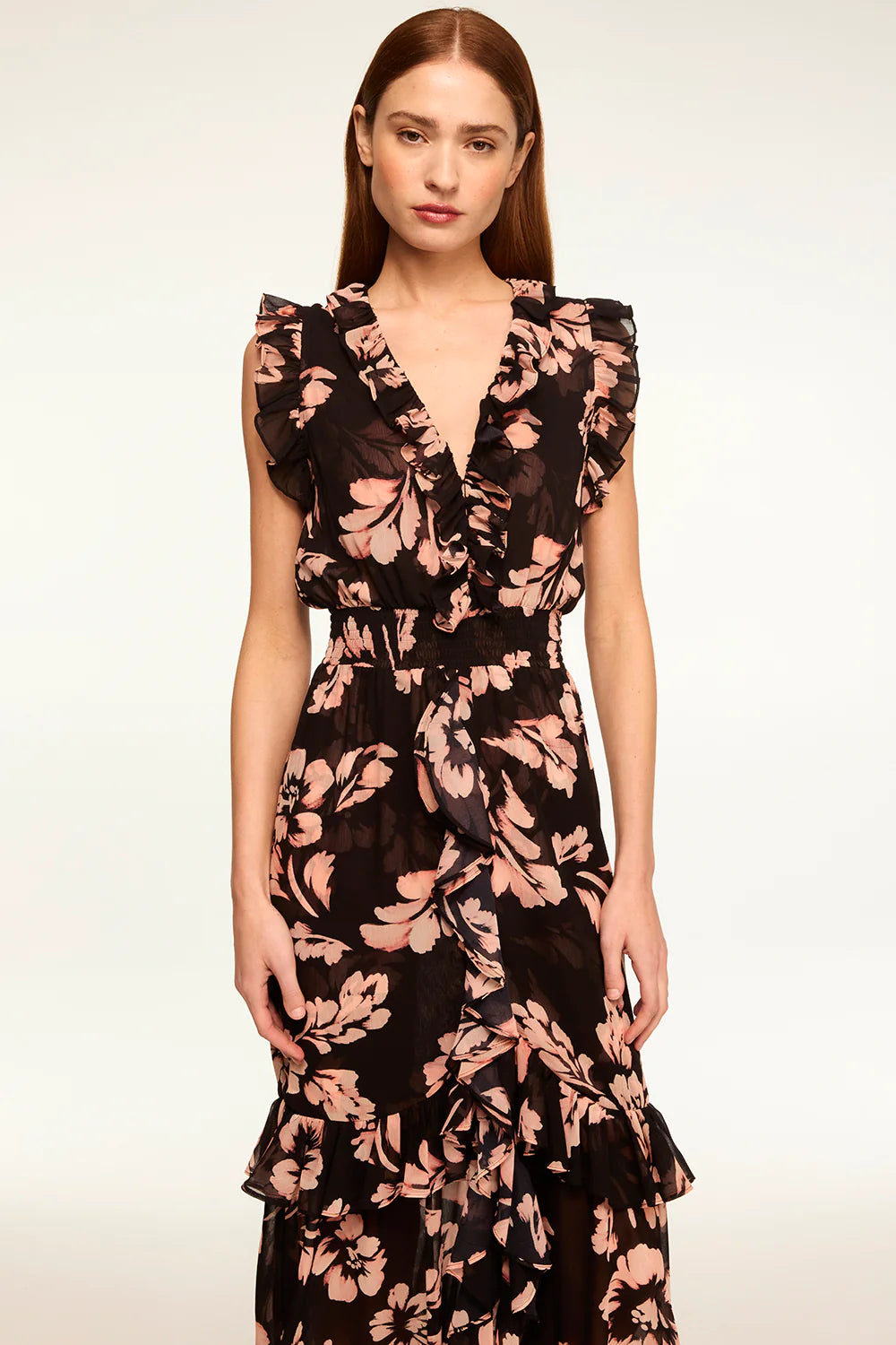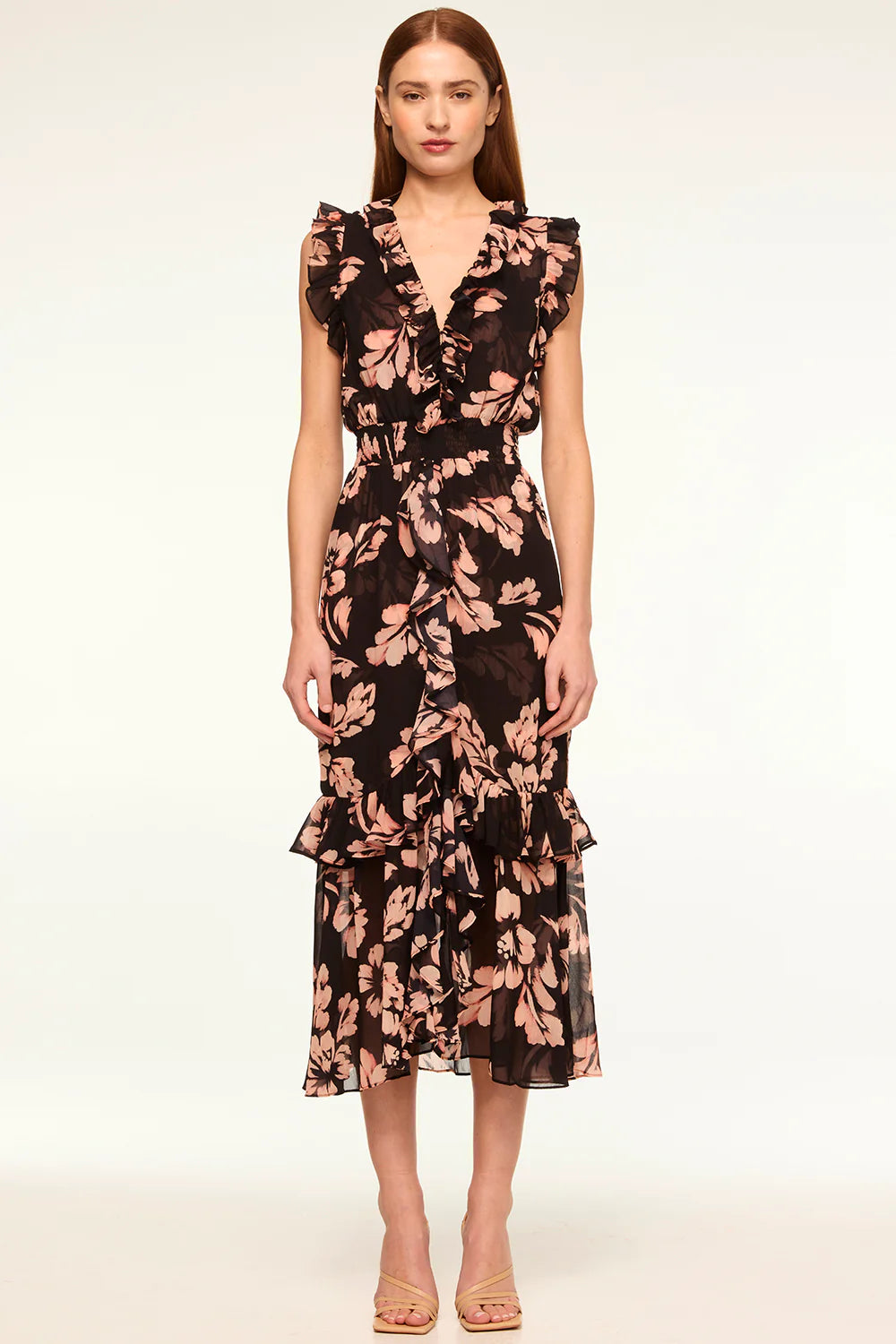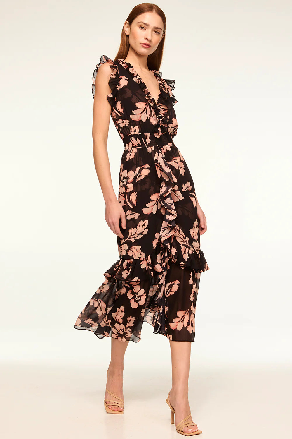 A chic update for your wardrobe, our best-selling Kidada is a gorgeous Auric Flora printed chiffon midi dress with stunning ruffles. The perfect many-moment dress featuring a v-neckline, hidden hook and eye closure with a ruffle trim that compliments the sweet ruffle detail at the shoulders. A flattering smocked waistband leads into a cascade ruffle trimmed skirt.